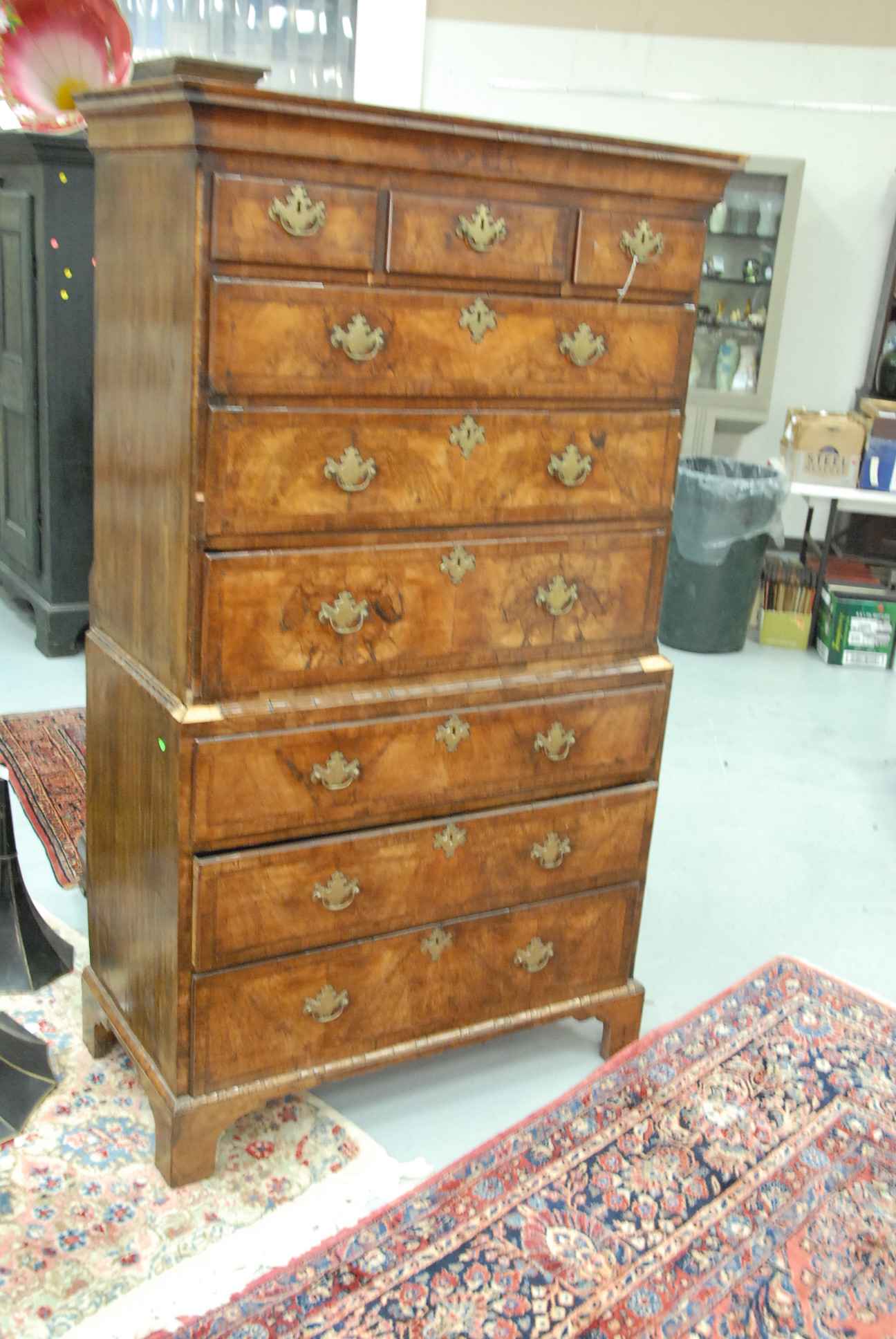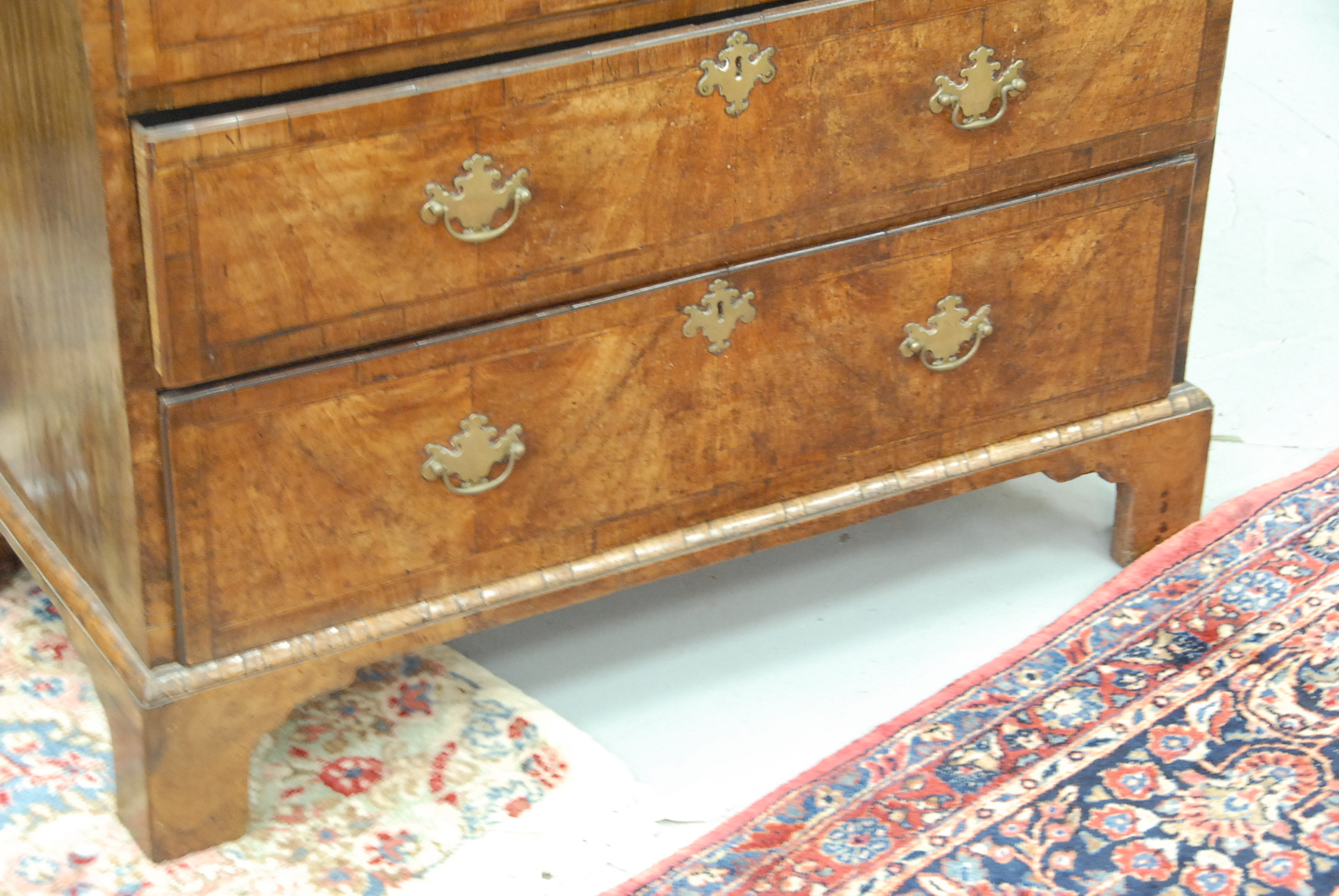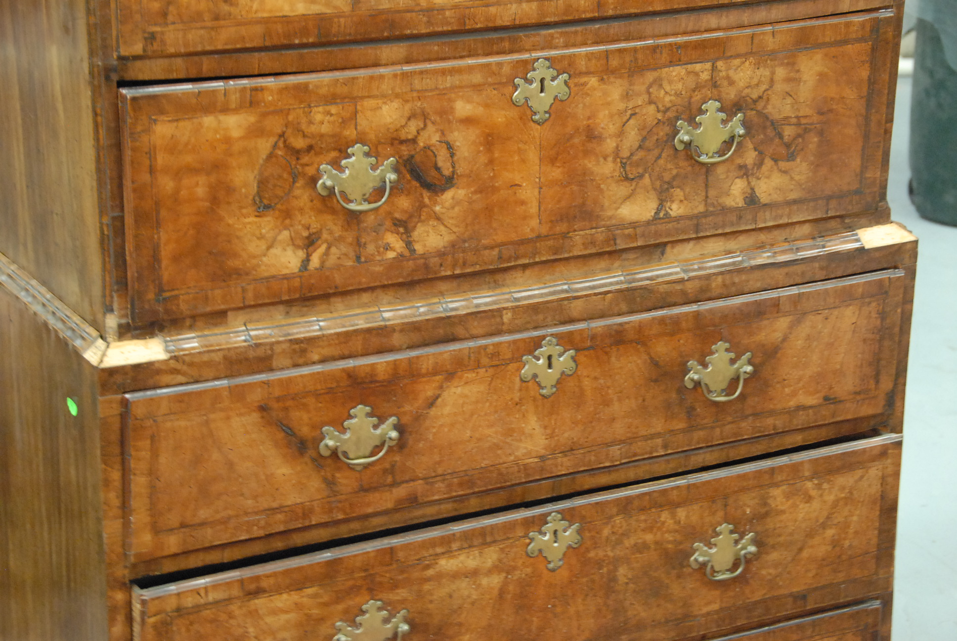 George II walnut and burl walnut chest on chest in two parts, original hardware.