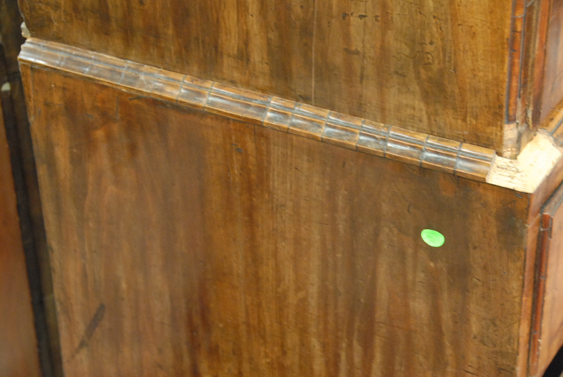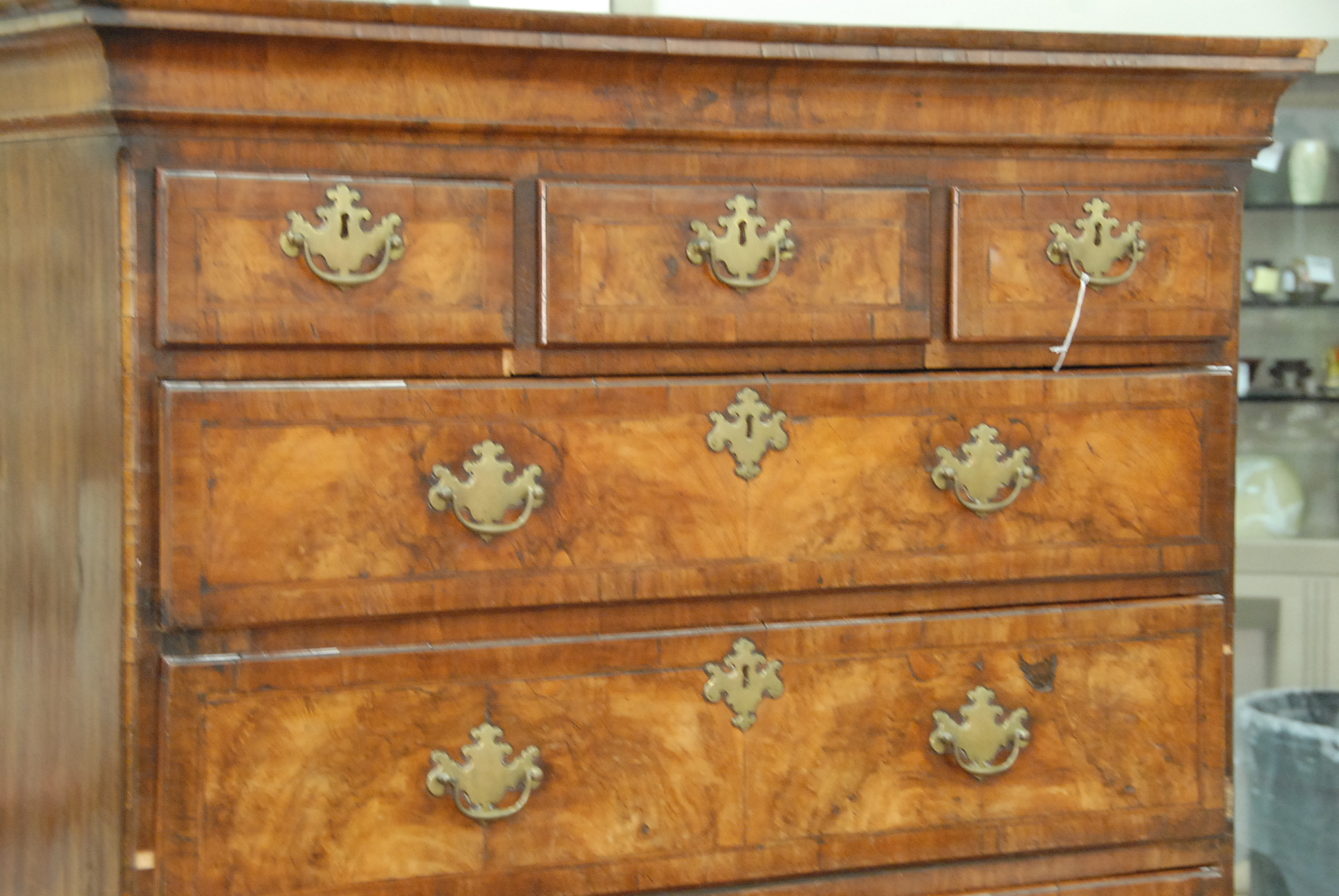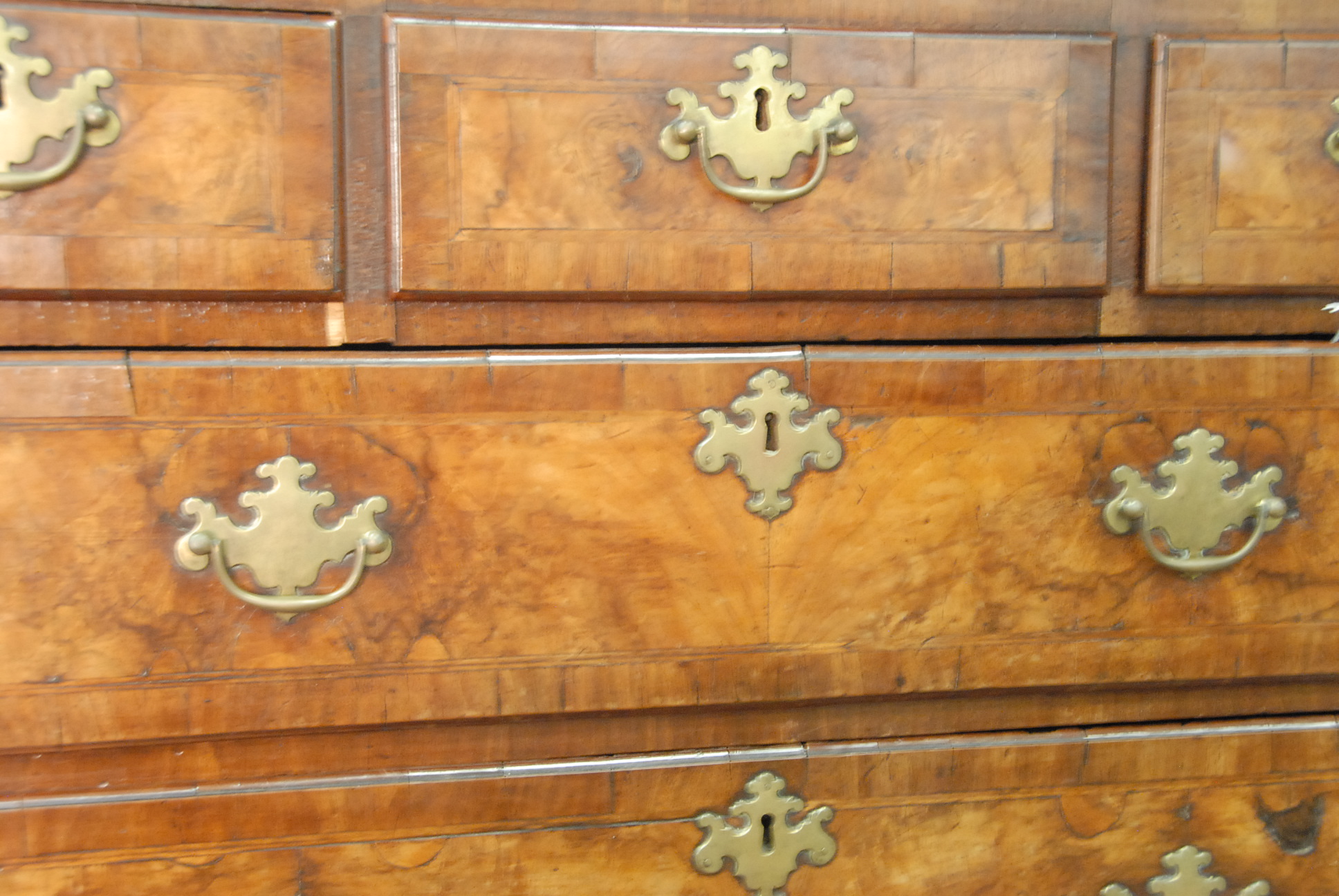 George II walnut and burl walnut chest on chest in two parts, original hardware.