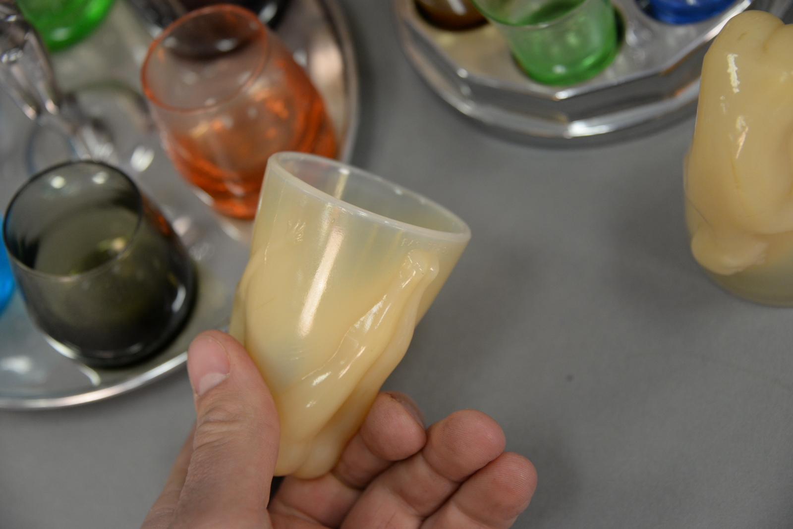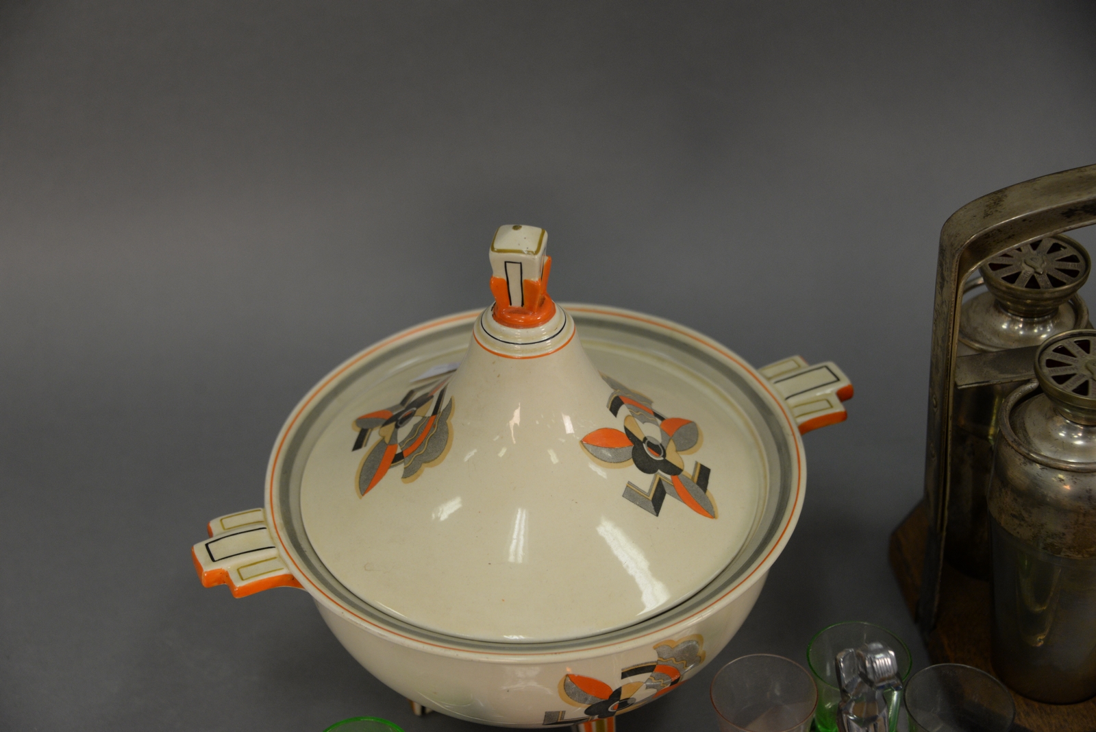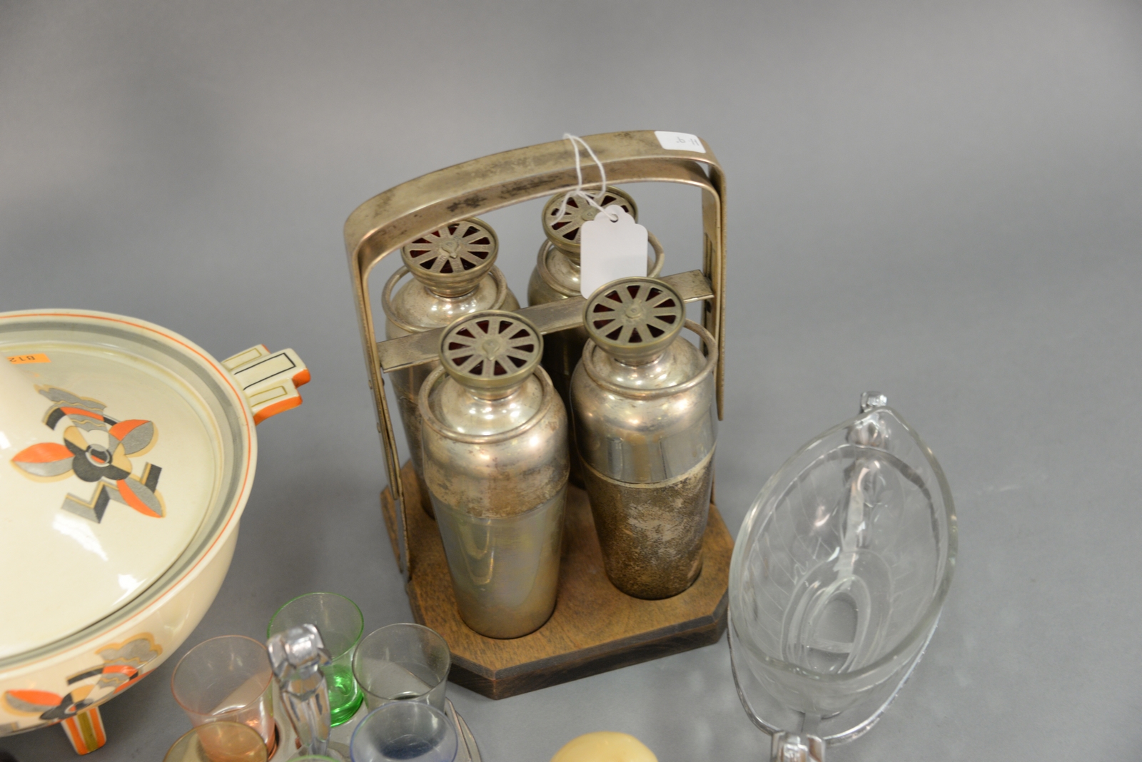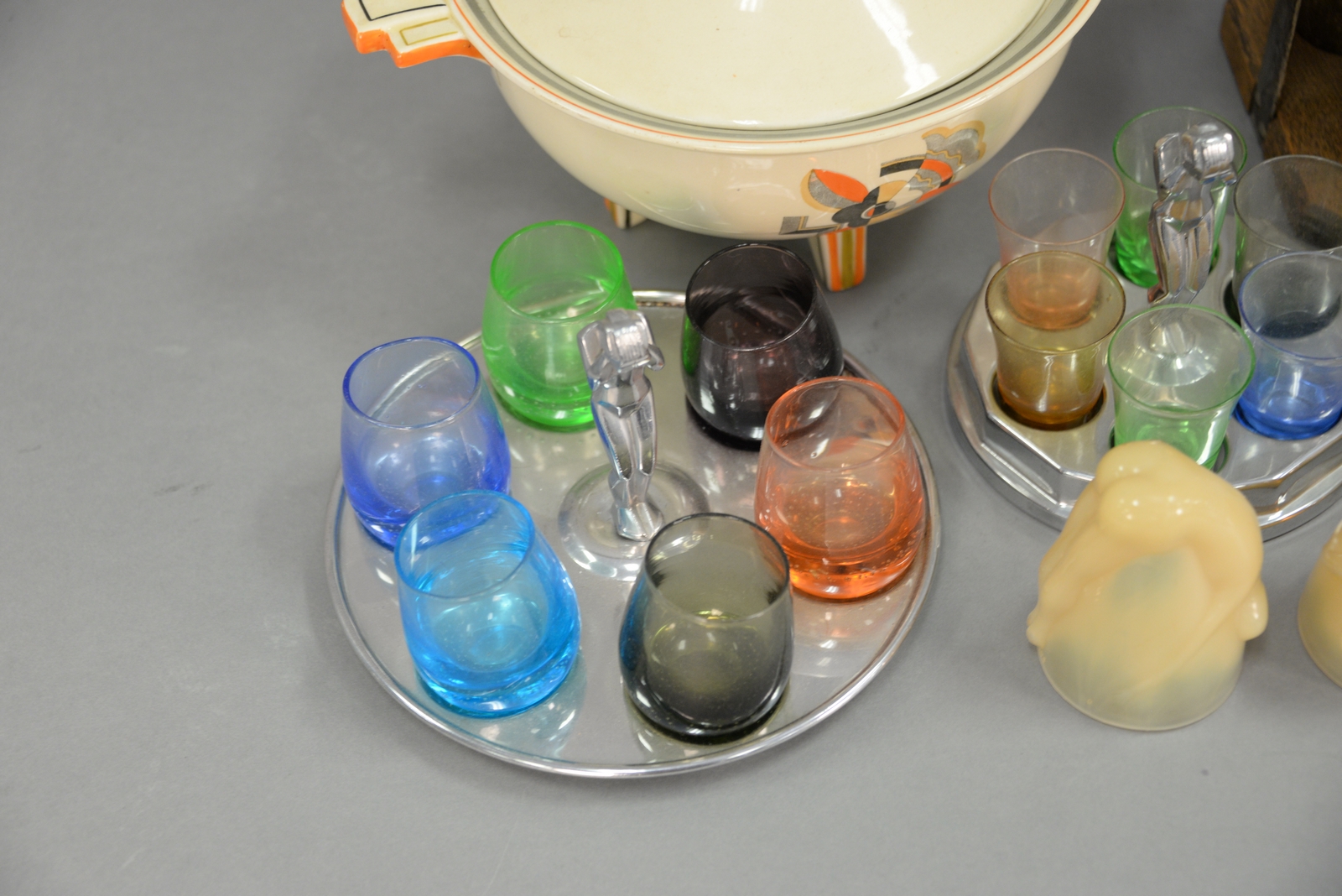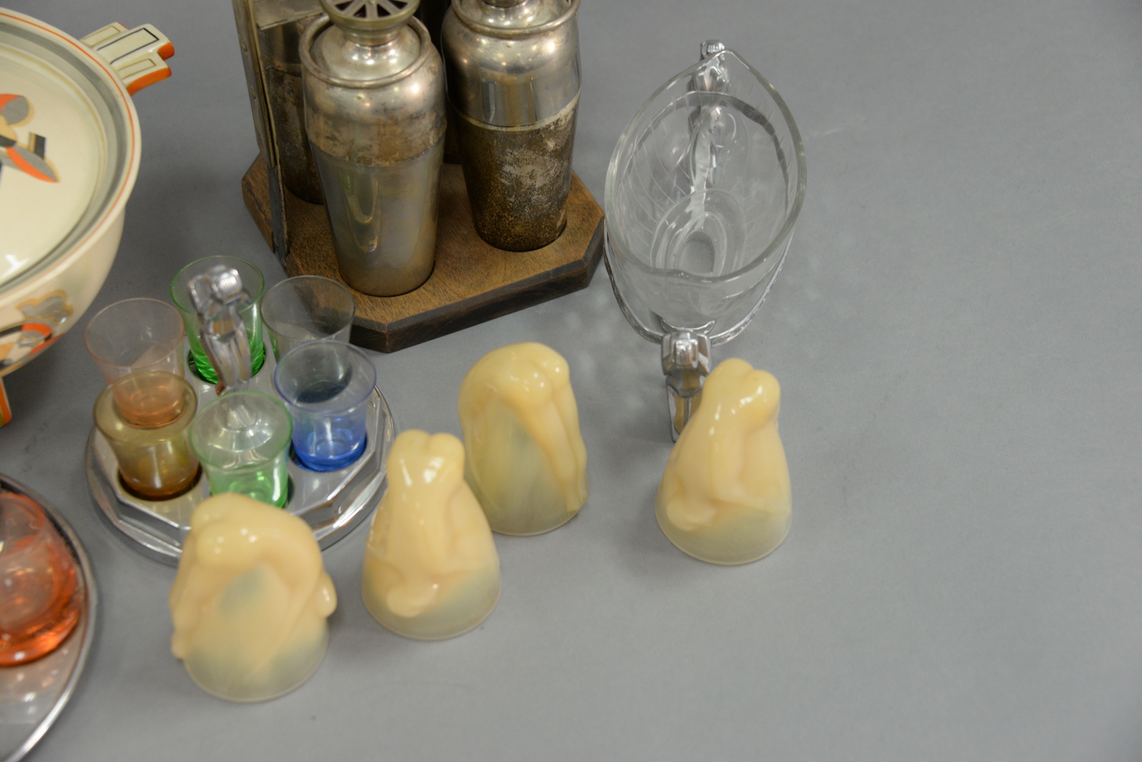 James Napier cocktail shaker set including two art nouveau shot glass trays with nude woman center, set of four art nouveau glasses with nude woman, and a modern Whieldon Chalon covered serving dish. 3 1/4in. to 9in.