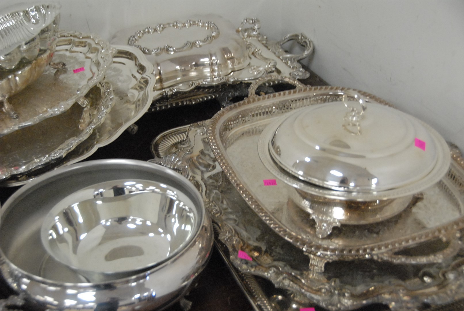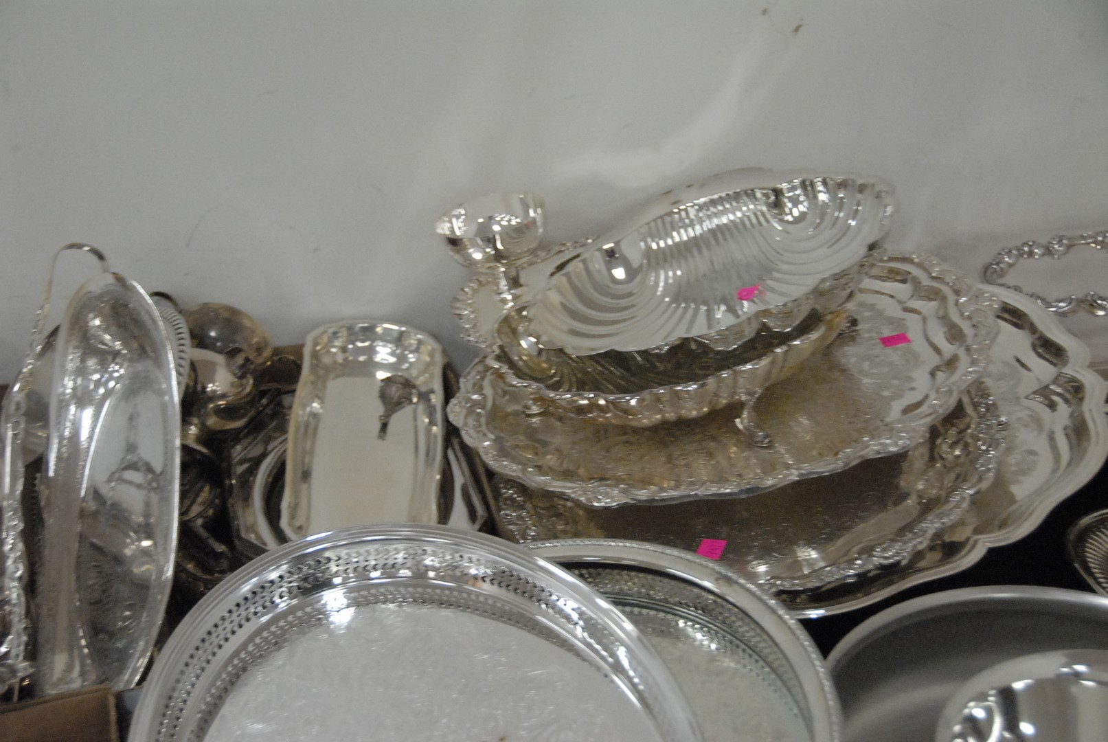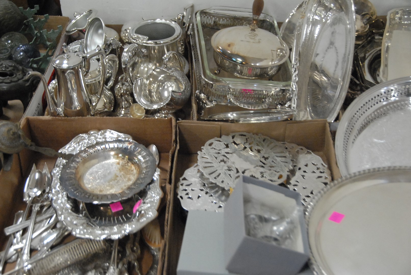Lot 59: Large silverplate group to include serving trays, bowls, center dishes, teapots, creamers, sugars, flatware, etc.