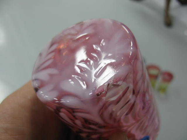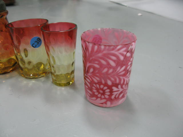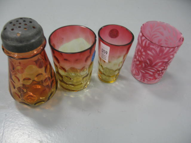 Lot of art glass to include two Amberina tumblers, one chipped, Amberina caster and art glass tumbler as is