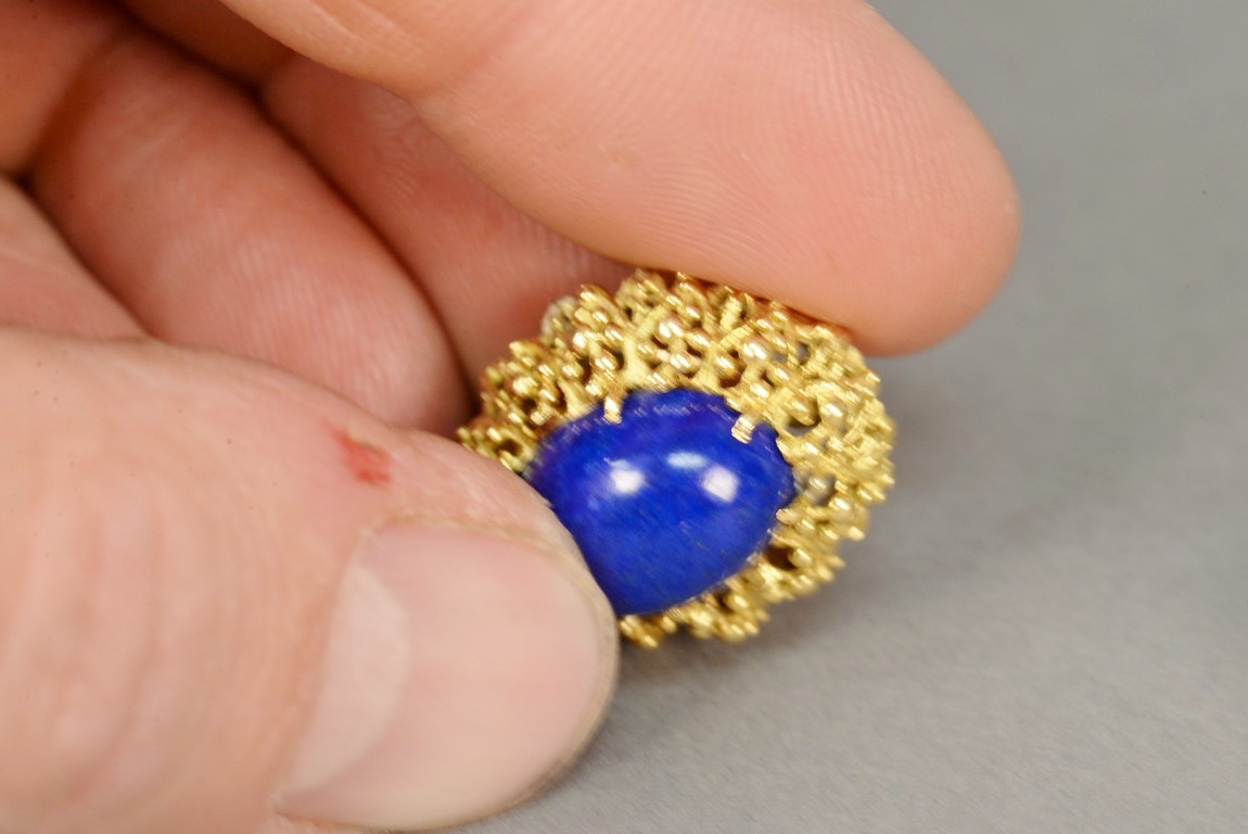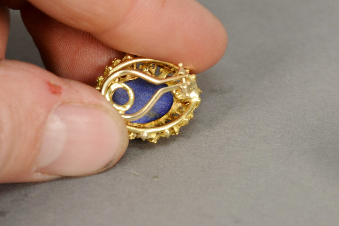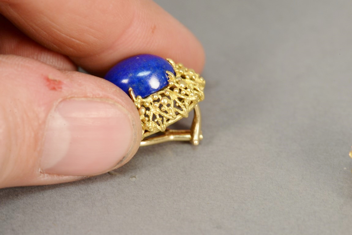 Lot 59: Pair of 14K gold and lapis lazuli earrings containing two oval cabochon cut lapis measuring 14x10mm. 12 grams total weight