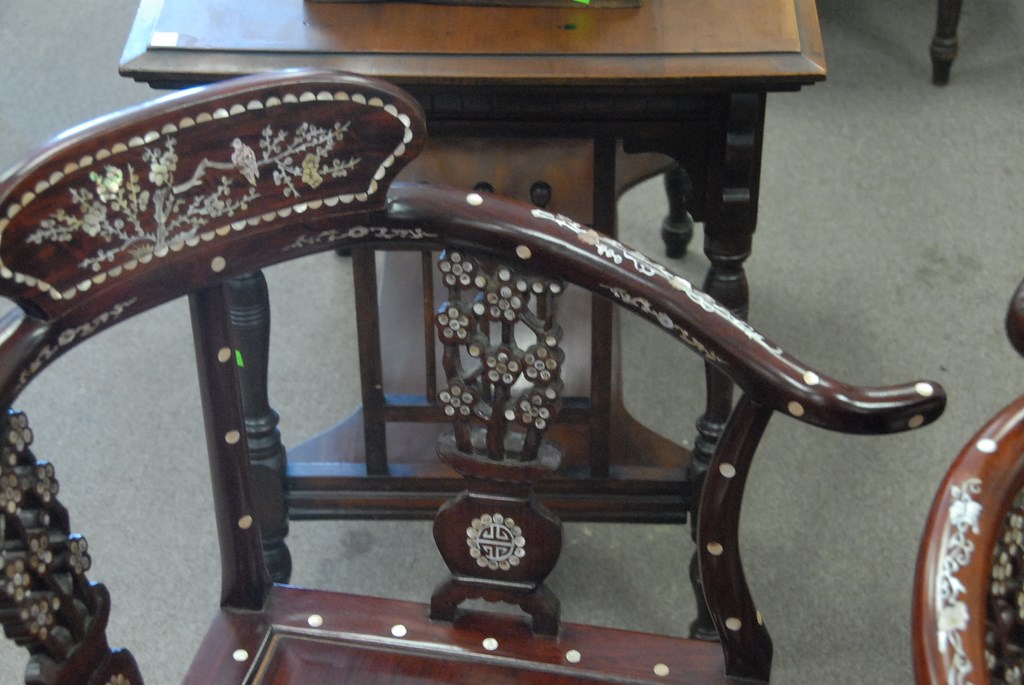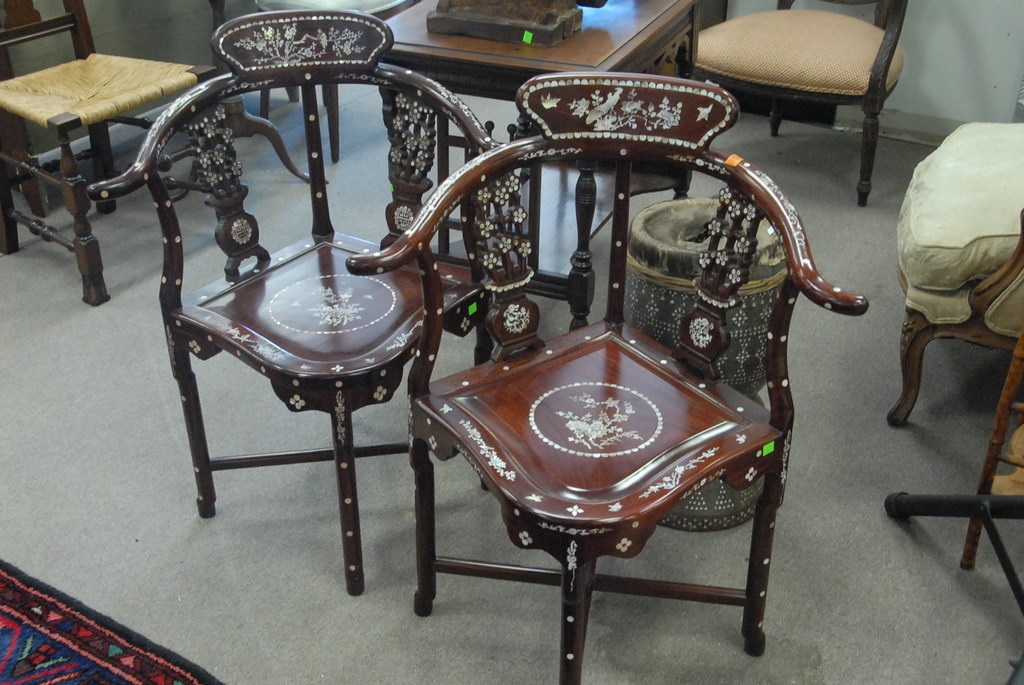 Pair of Chinese corner chairs with mother of pearl inlay.