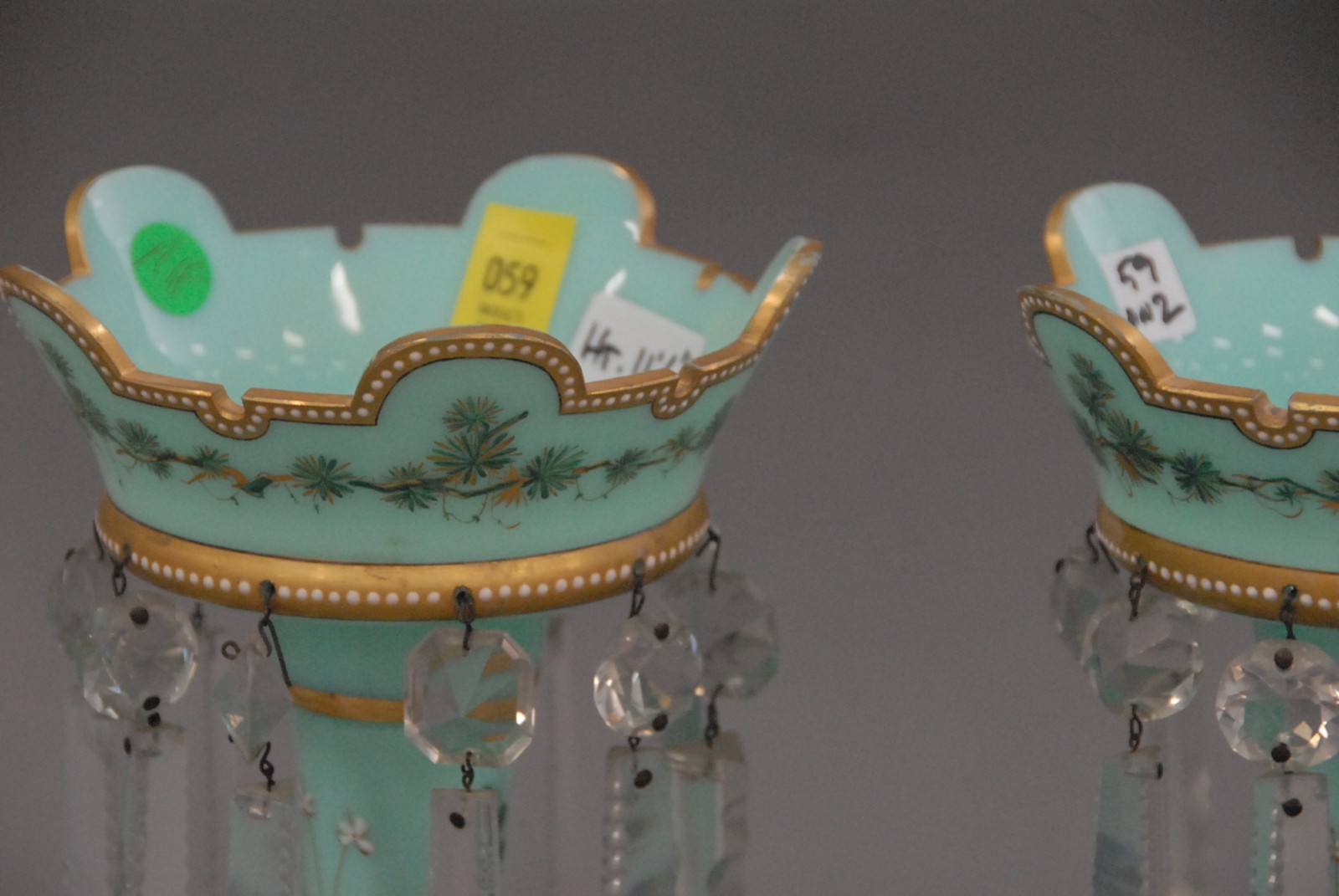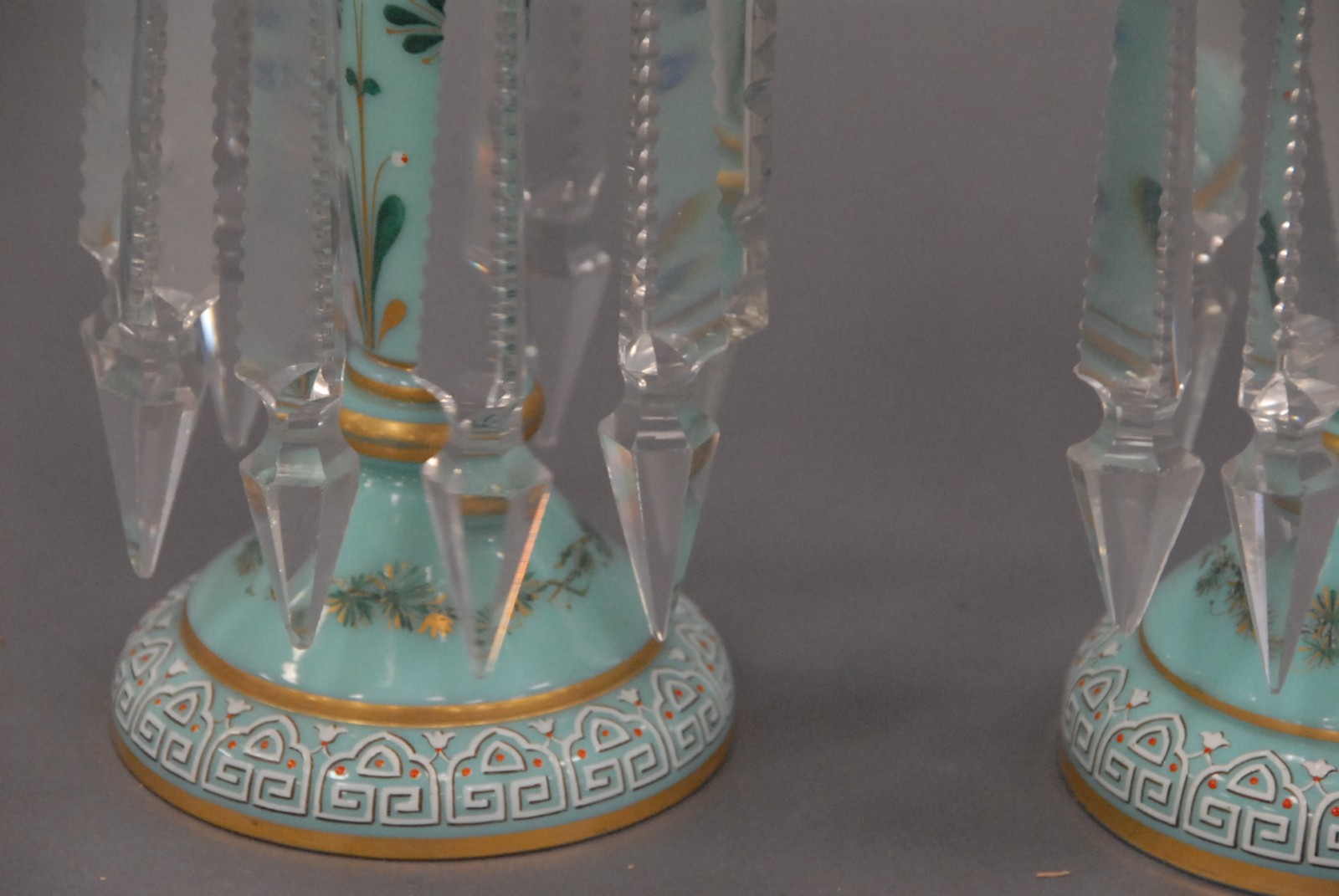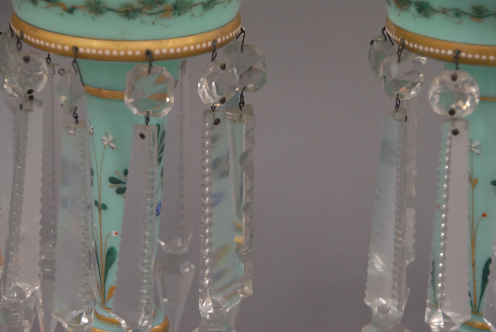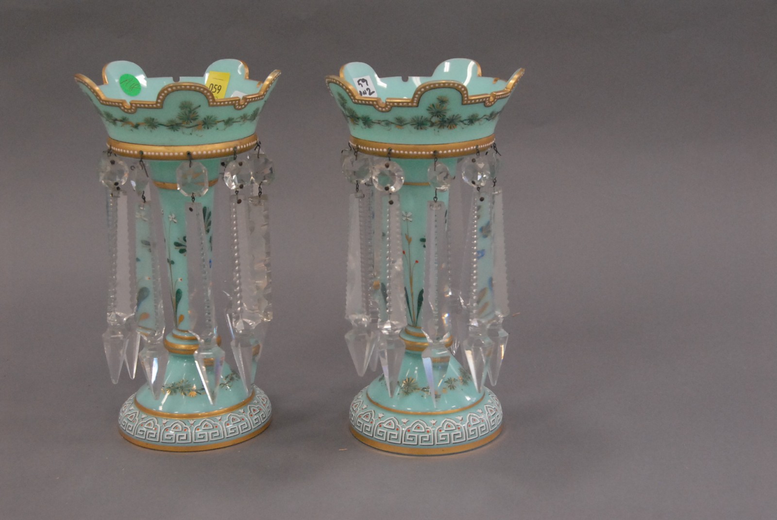 Pair of lusters with prisms & enamel decoration – 2 prisms are broken & 1 is missing