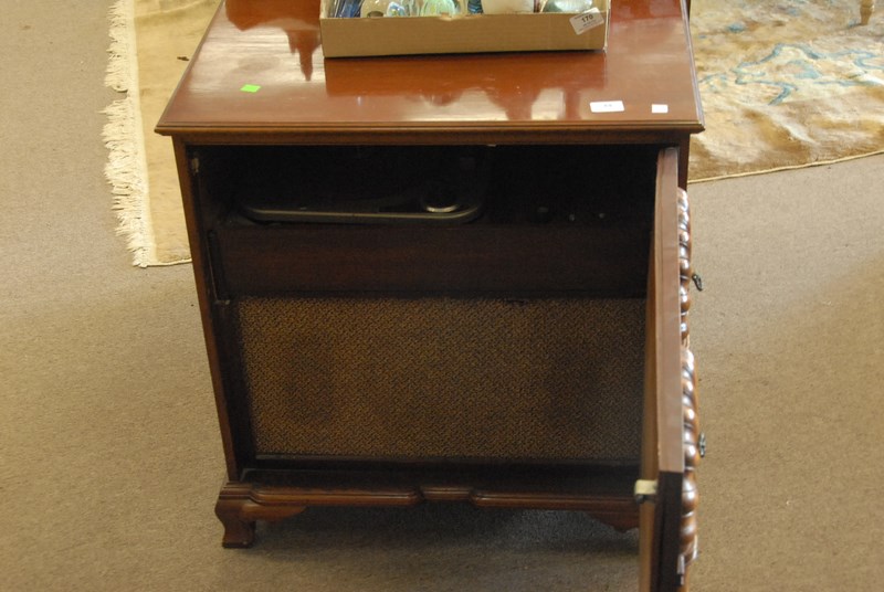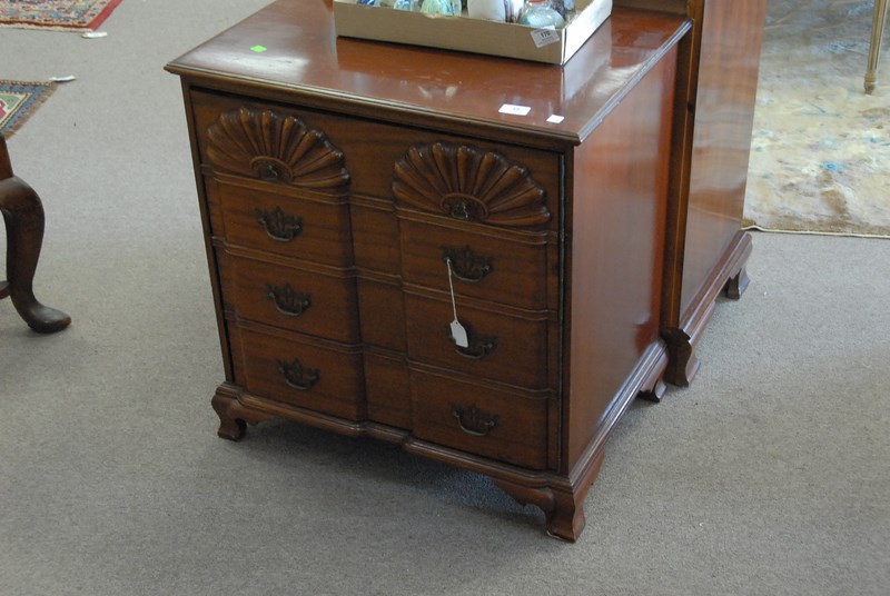 Lot 59: Pair of Margolis mahogany carved block front cabinets, one with built in stereo equipment. ht. 27in. wd. 26in. dp. 18in.