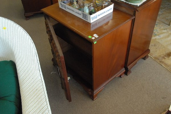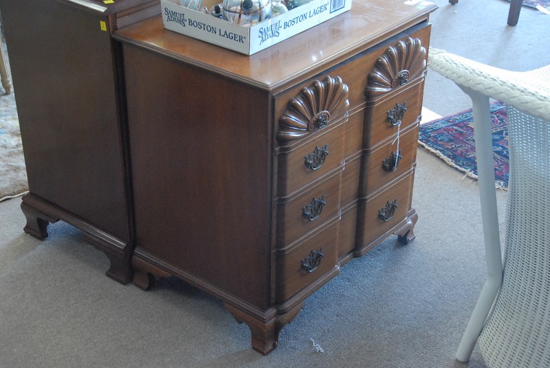 Pair of Margolis mahogany carved block front cabinets, one with built in stereo equipment. ht. 27in. wd. 26in. dp. 18in.
