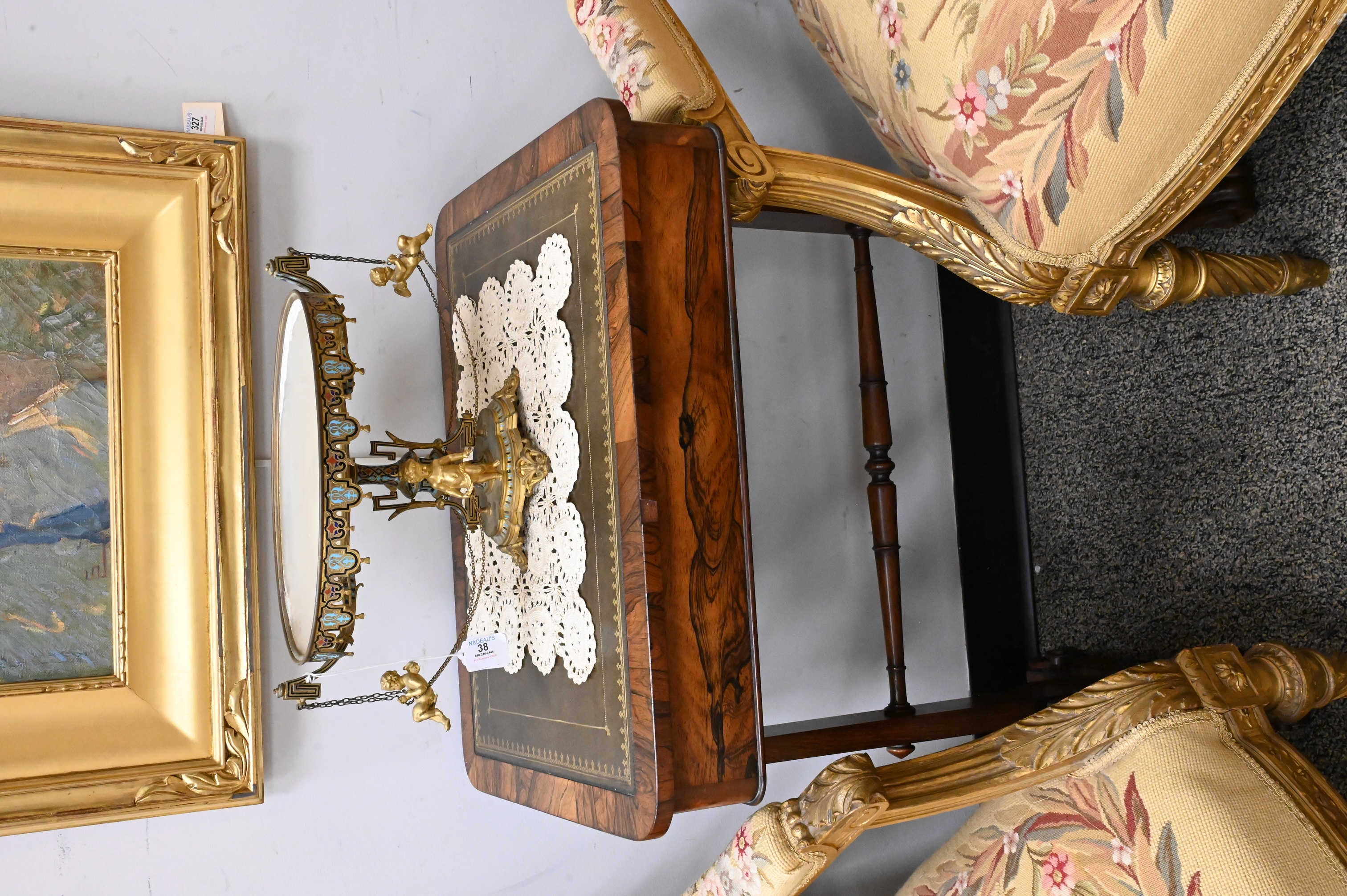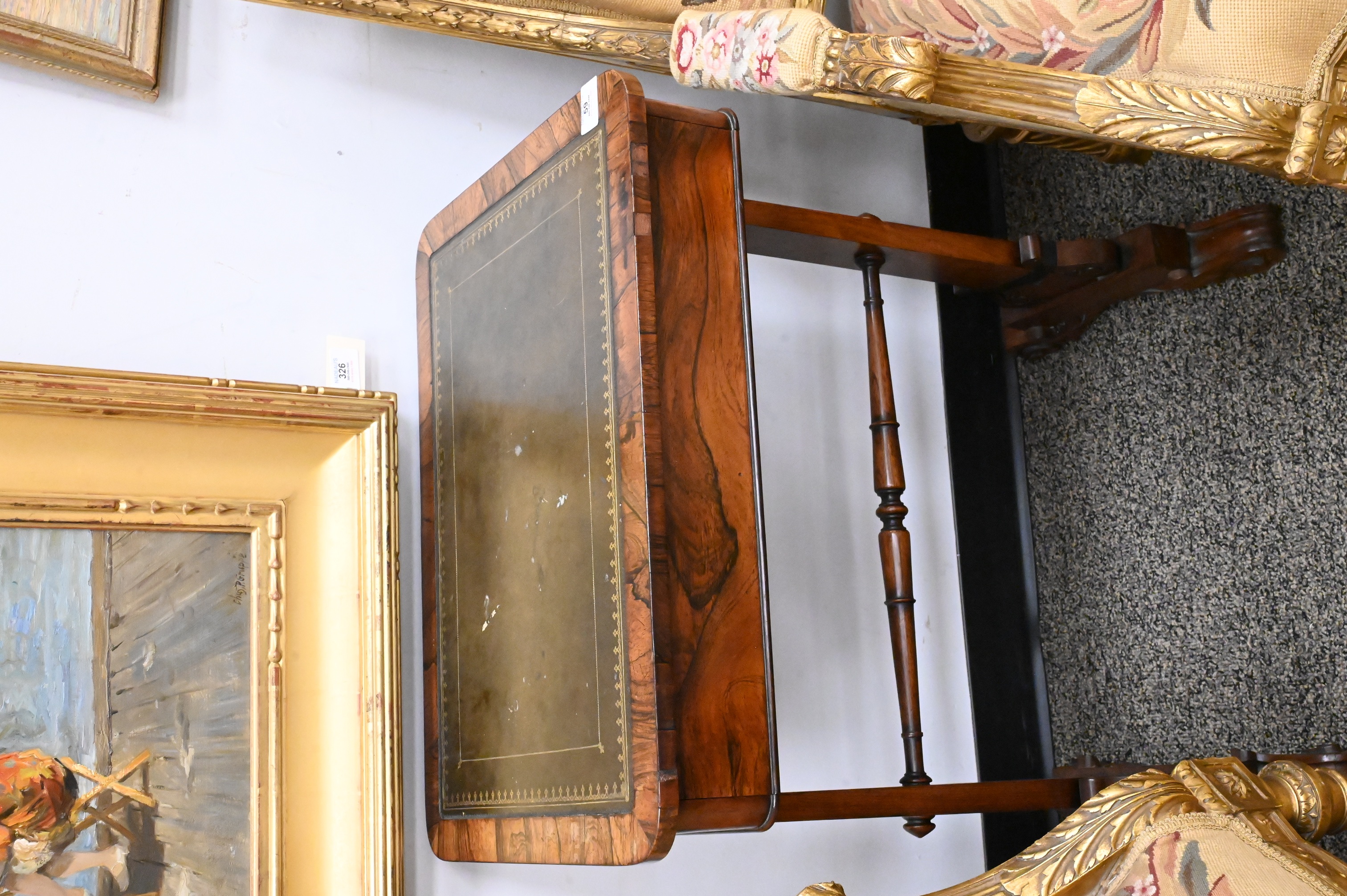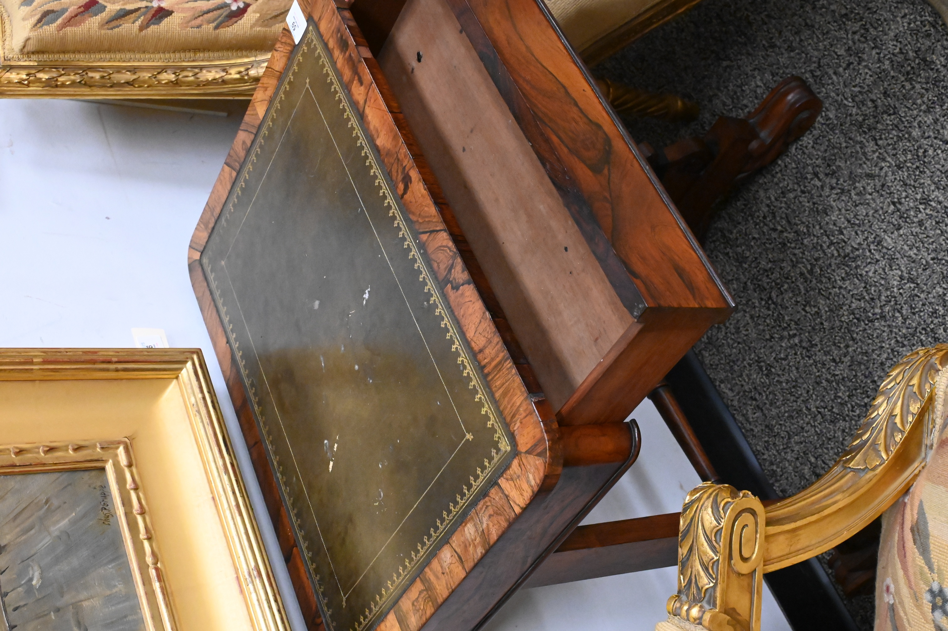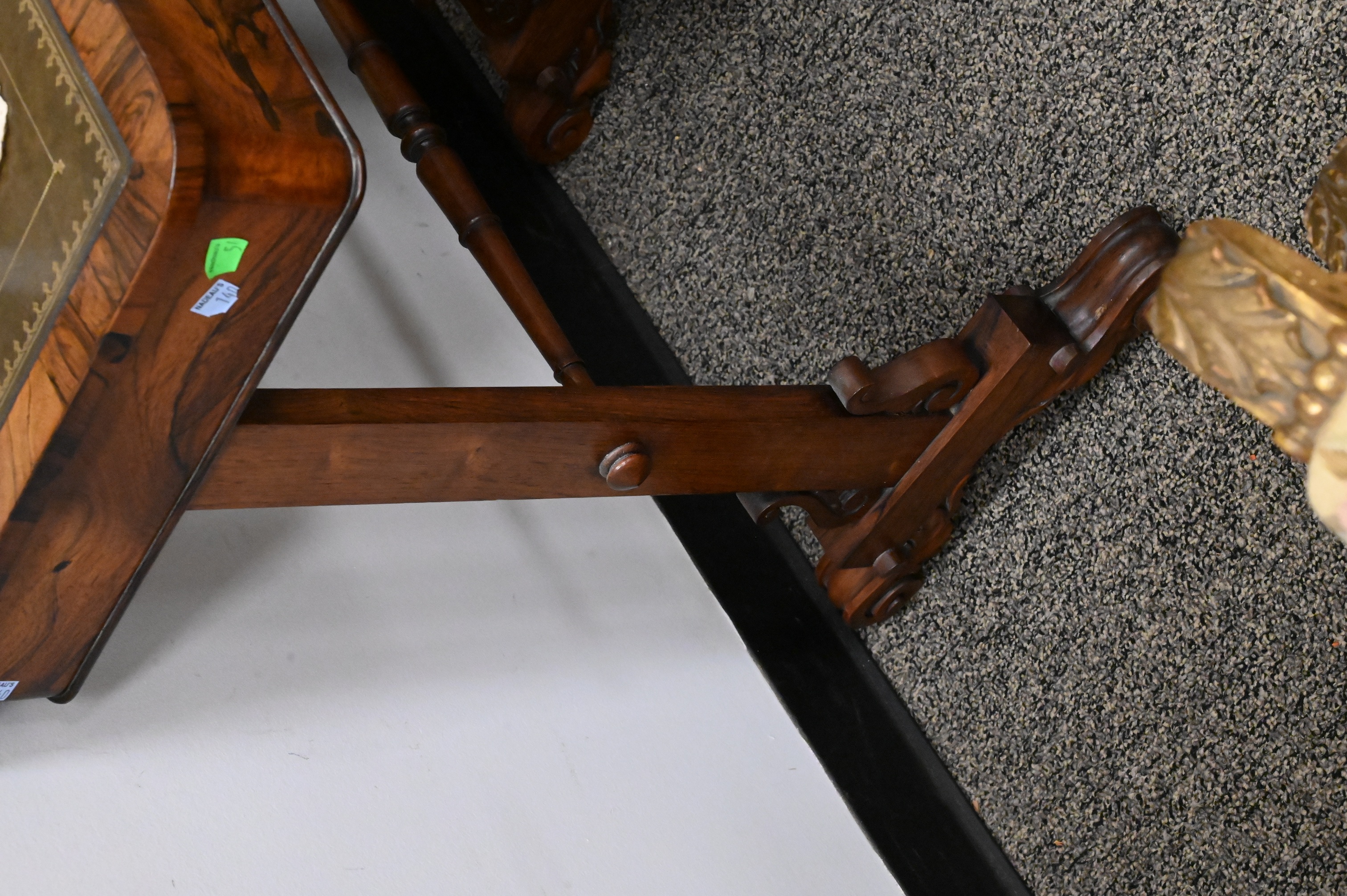 each having rectangular top inset with a tooled leather writing surface above a plain frieze fitted with a single drawer, raised on twin end supports joined by a turned stretcher and terminating in scrolled feet, early 19th century, does not include casters