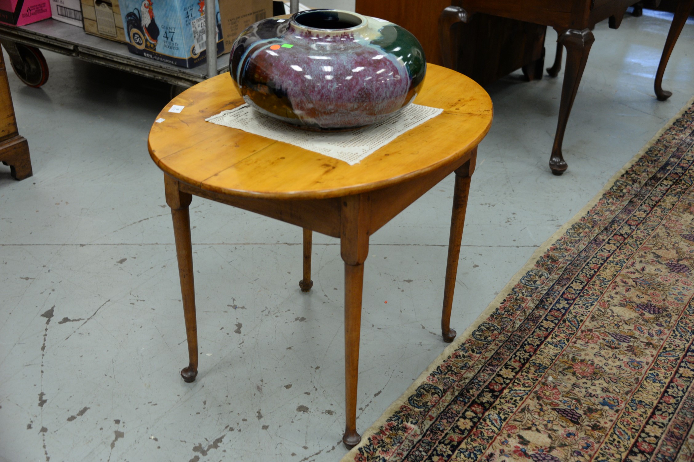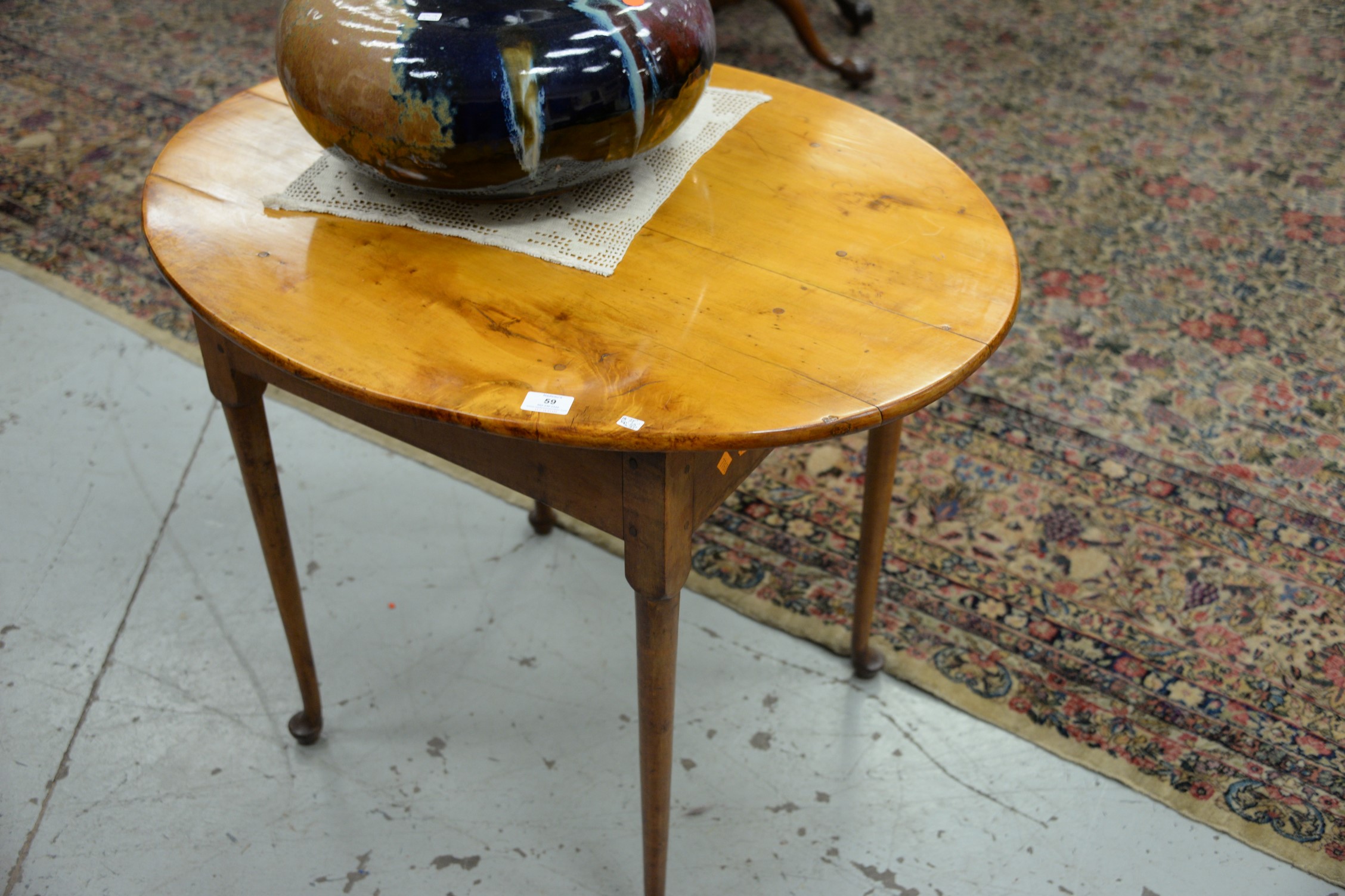 Lot 59: Queen Anne tea table having oval top on plain frieze set on turned legs ending in pad feet, New England circa 1740-1750. ht. 27 i…