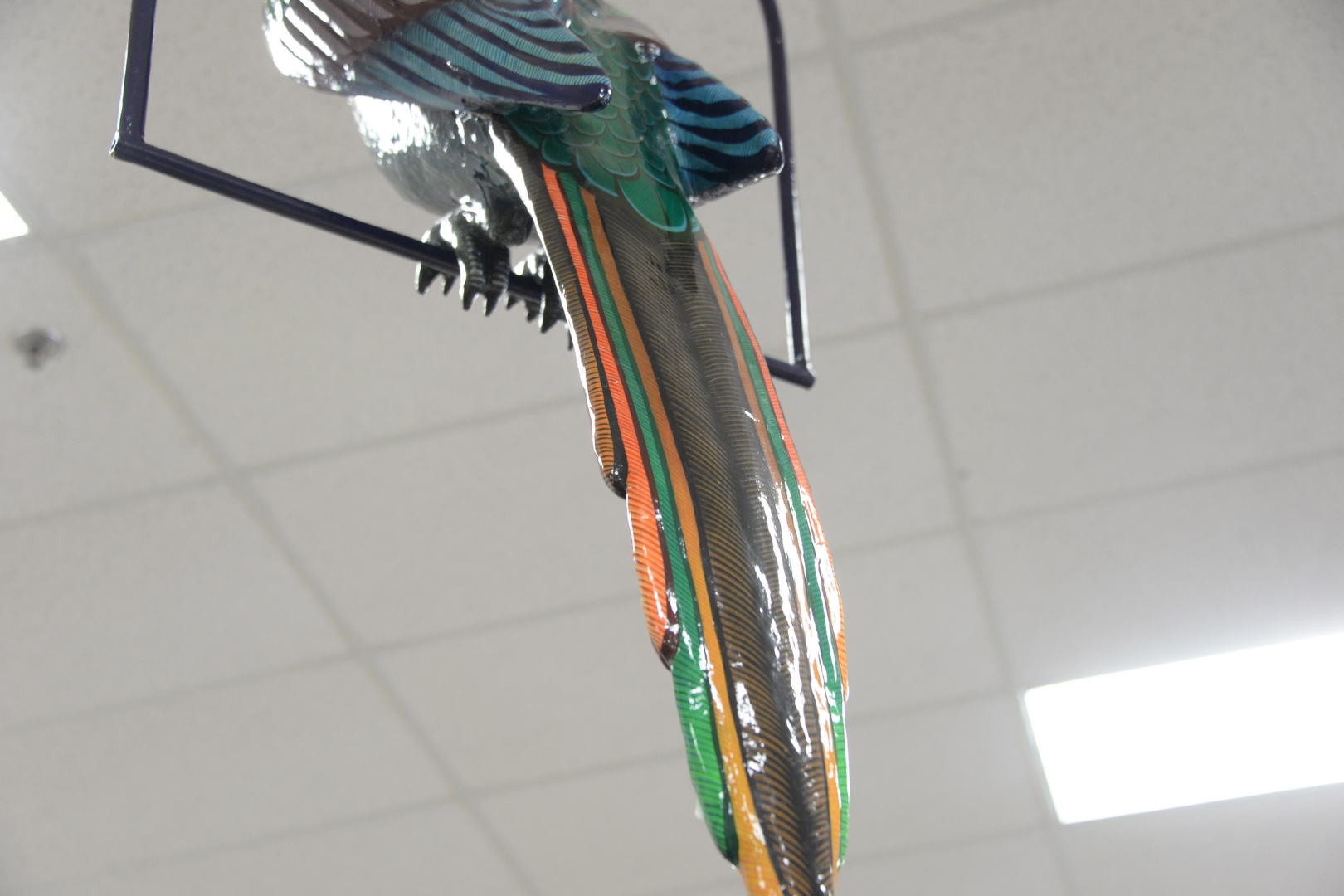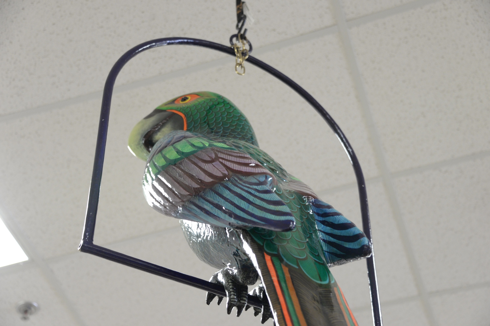 Lot 59: Sergio Bustamante (Mexican, b. 1949), large parrot on a swing, papier mache, signed and editioned on the neck “Sergio Bustamante 20/100”, bird height 56 inches, width 13 inches, depth 9 1/2 inches. Provenance: Estate of James Wadhams.