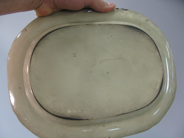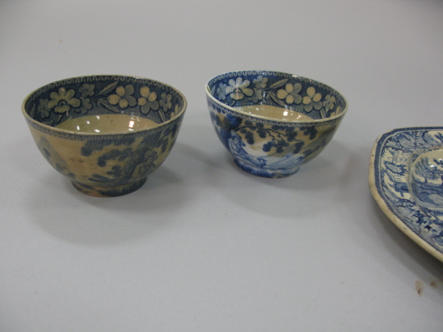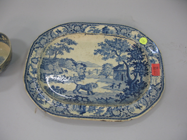 Three piece lot of Blue and White Staffordshire, two cups and a platter with a Lion scene