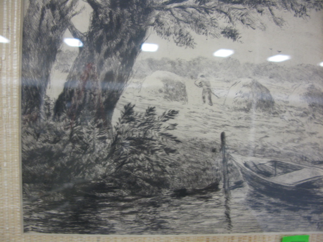 Three piece lot to include an etching of haystacks, a row boat, and two early portraits, one Boynemyster and one Sloan.