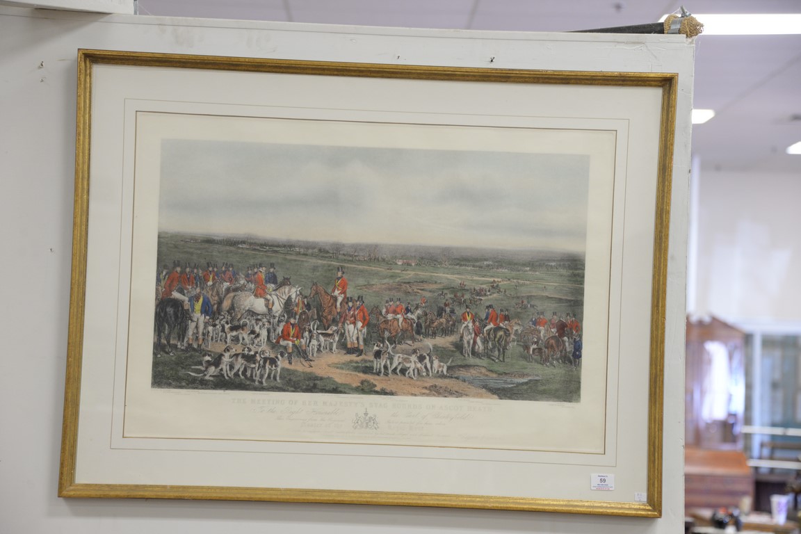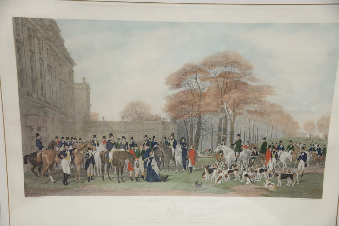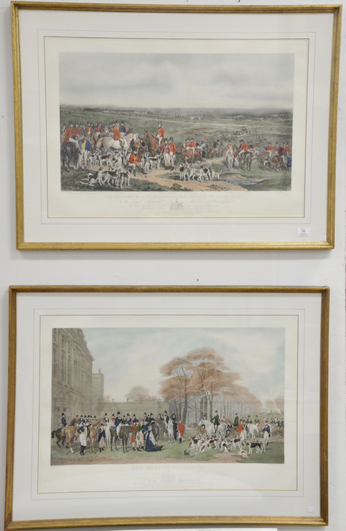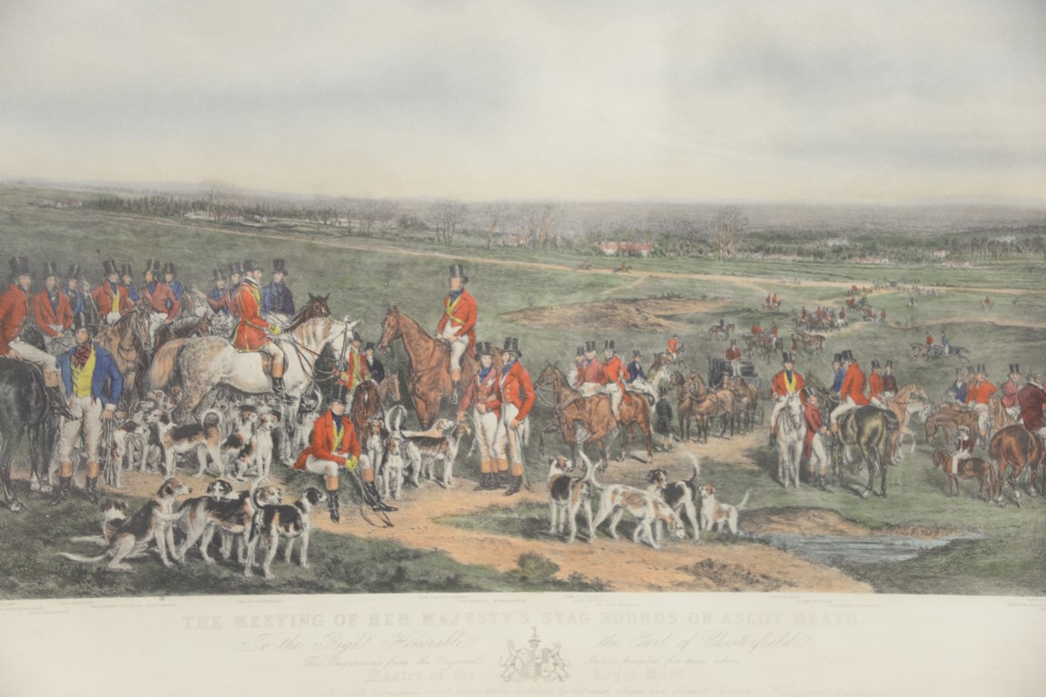 Three piece lot to include The Meet at Blagdon, an engraving after the painting by J.W. Snow, New Castle, engraved by Thomas Lurton, sight size 21 x 30 1/2 The Meet at Badminton, sporting print after a painting by William & Henry Barraud, engraved by William Giller, and The Meeting of Her Majesty’s Stag Hounds on Ascot Heath, a 19th century engraving by Bromley, painted by F. Grant. sight size 21 1/2 x 32 Provenance: Property from Credit Suisse’s Americana Collection