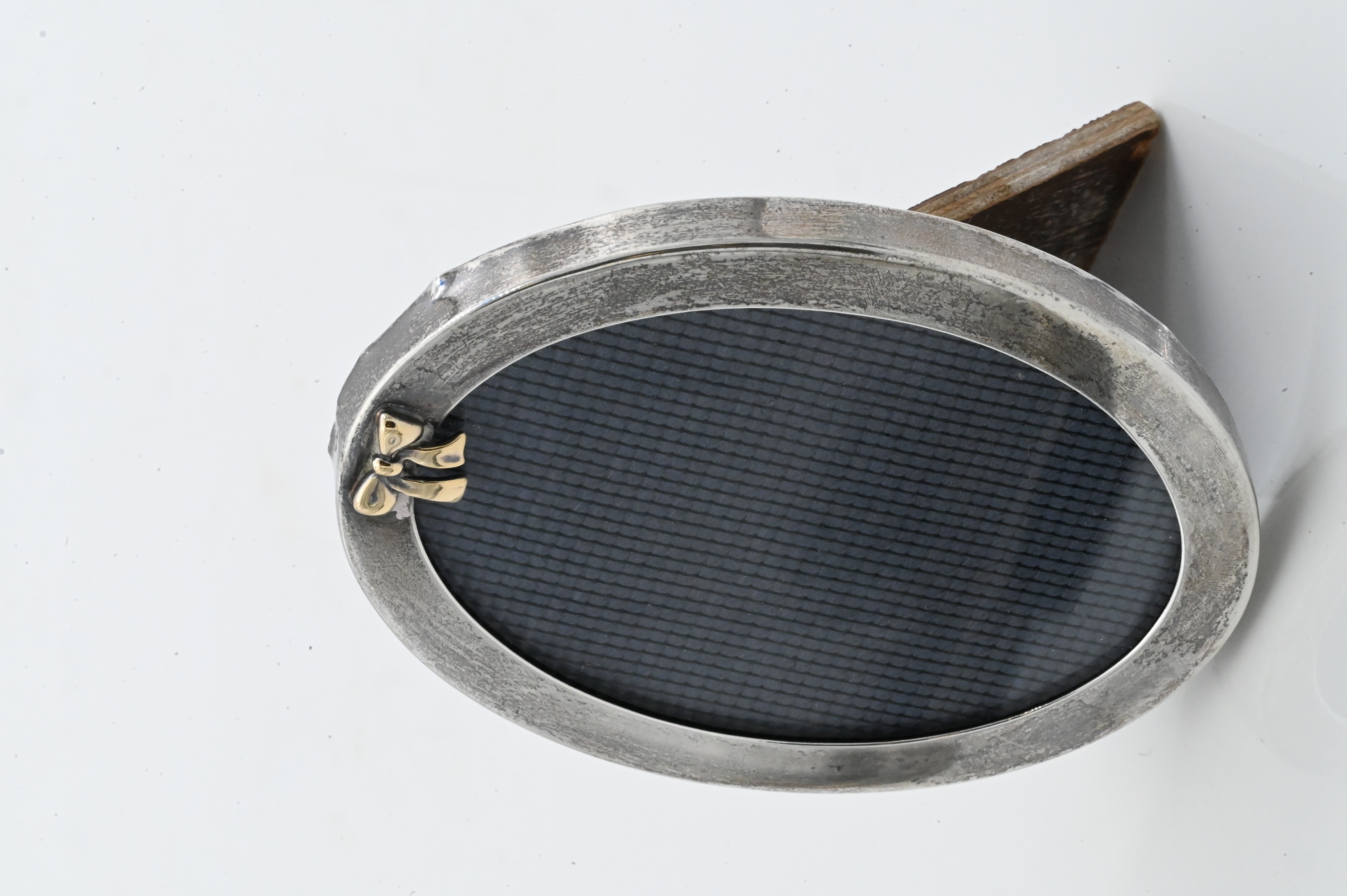 Elegant oval-form frame with polished sterling silver border surmounted by a tied ribbon and bow motif, fitted with original fabric backing and wood easel support. Marked Tiffany & Co. Sterling on reverse.