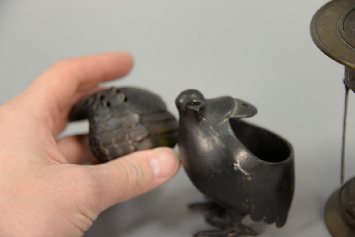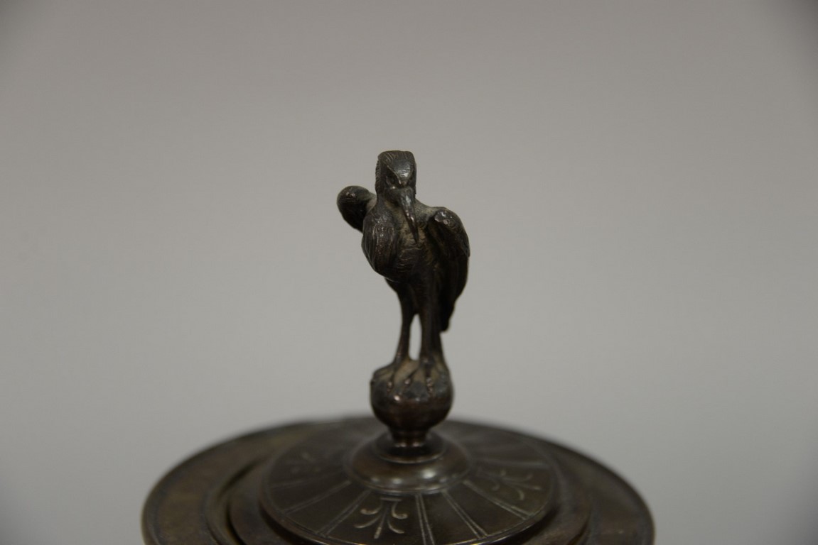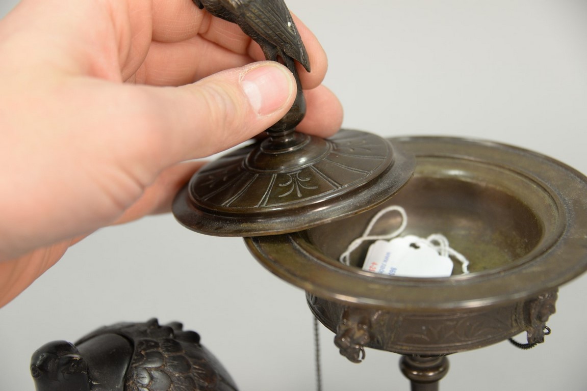 Lot 59: Two piece lot including bronze Victorian small urn with bird atop and a small bird. ht. 3 1/2 in. to ht. 8 in.