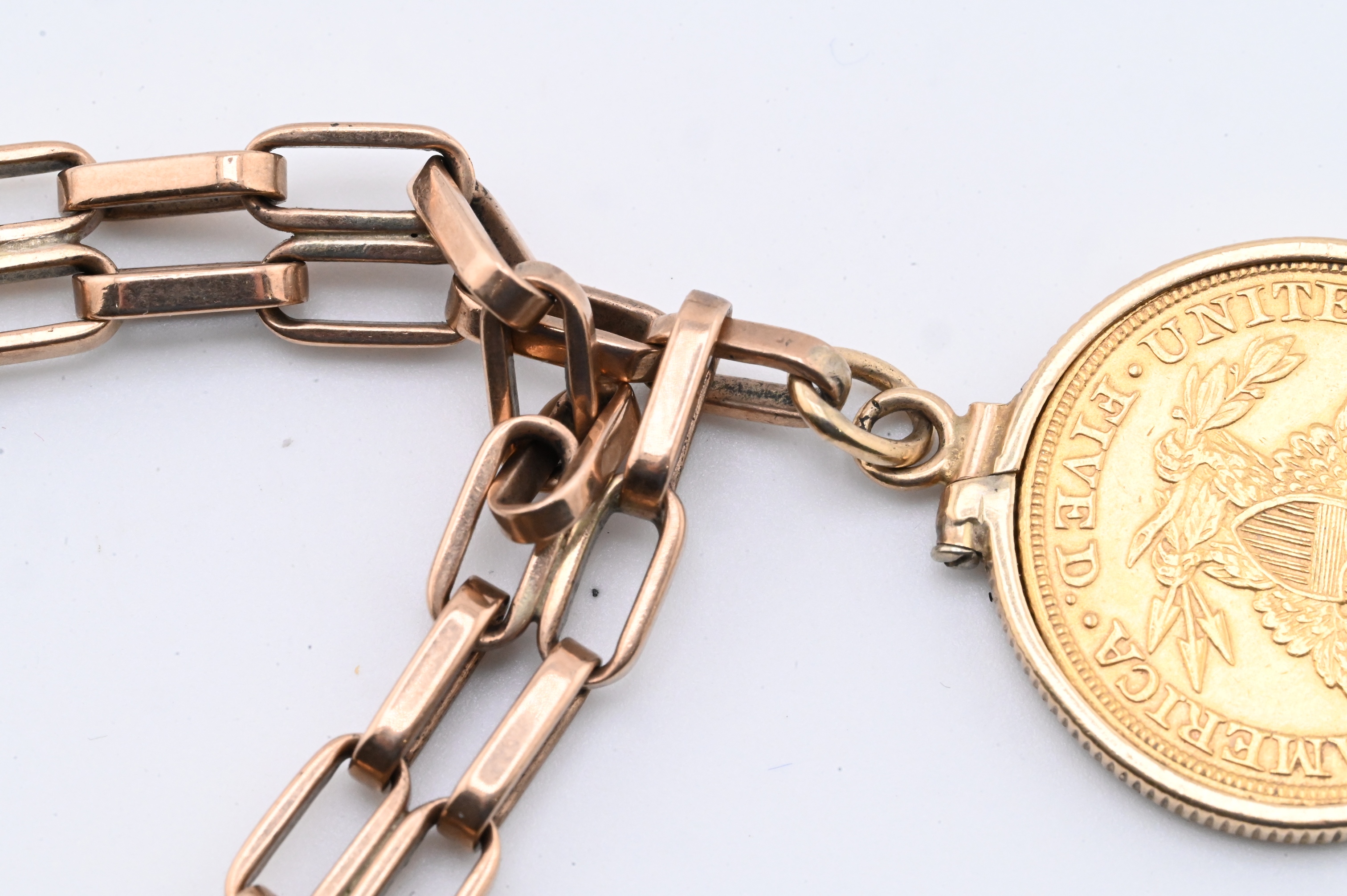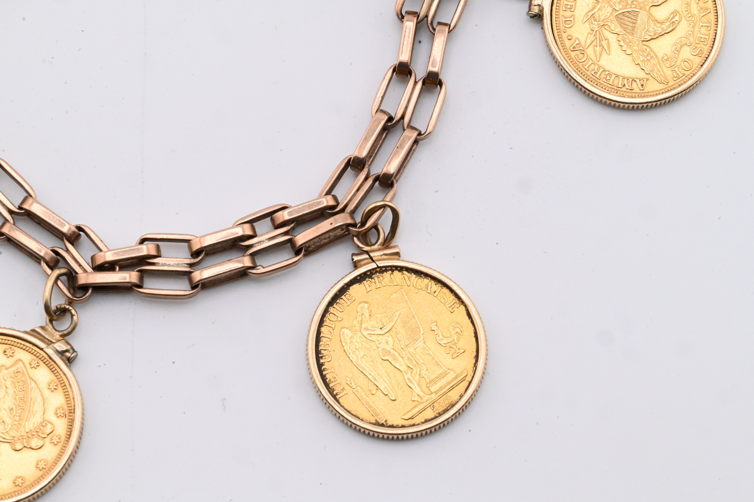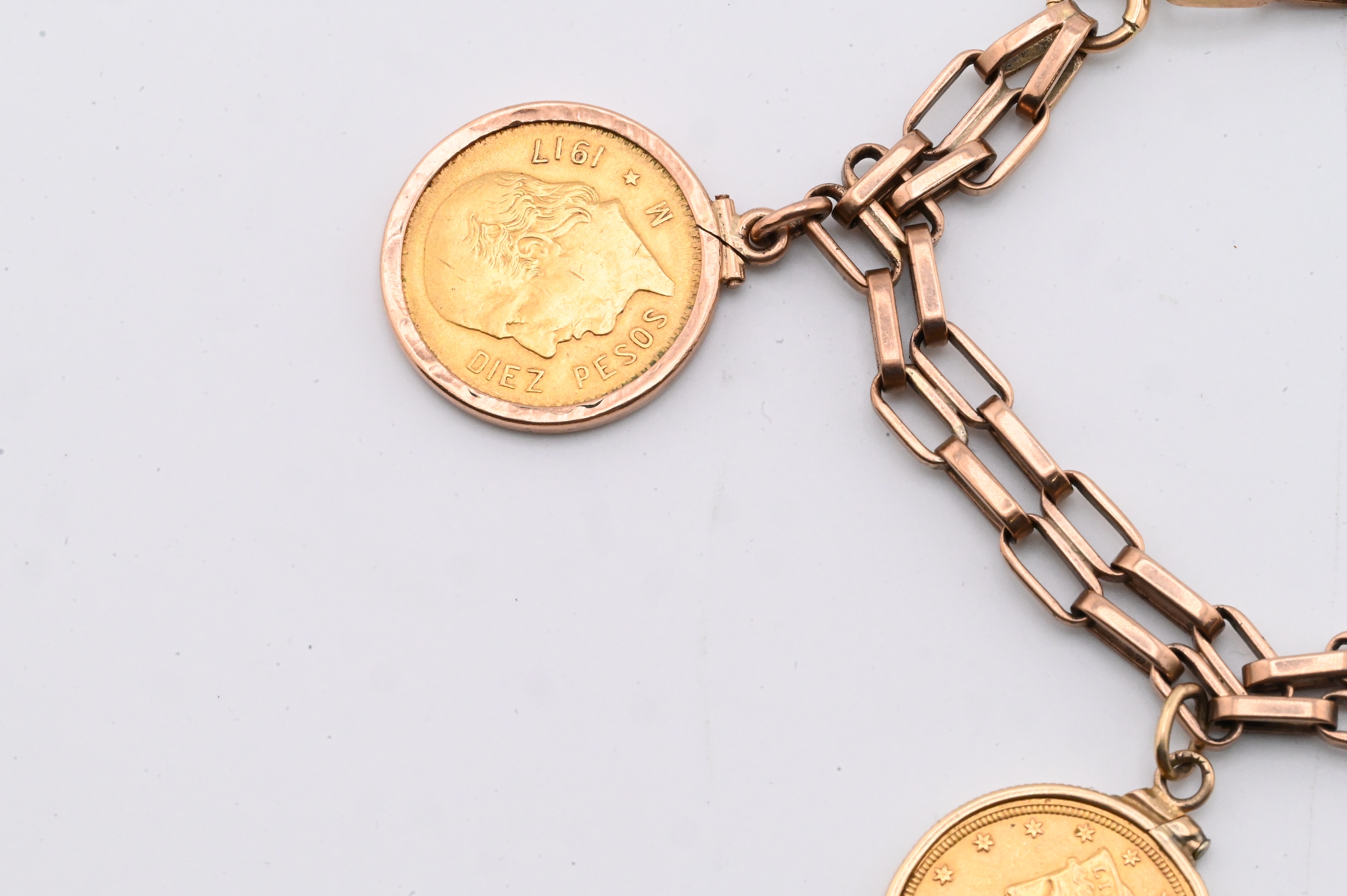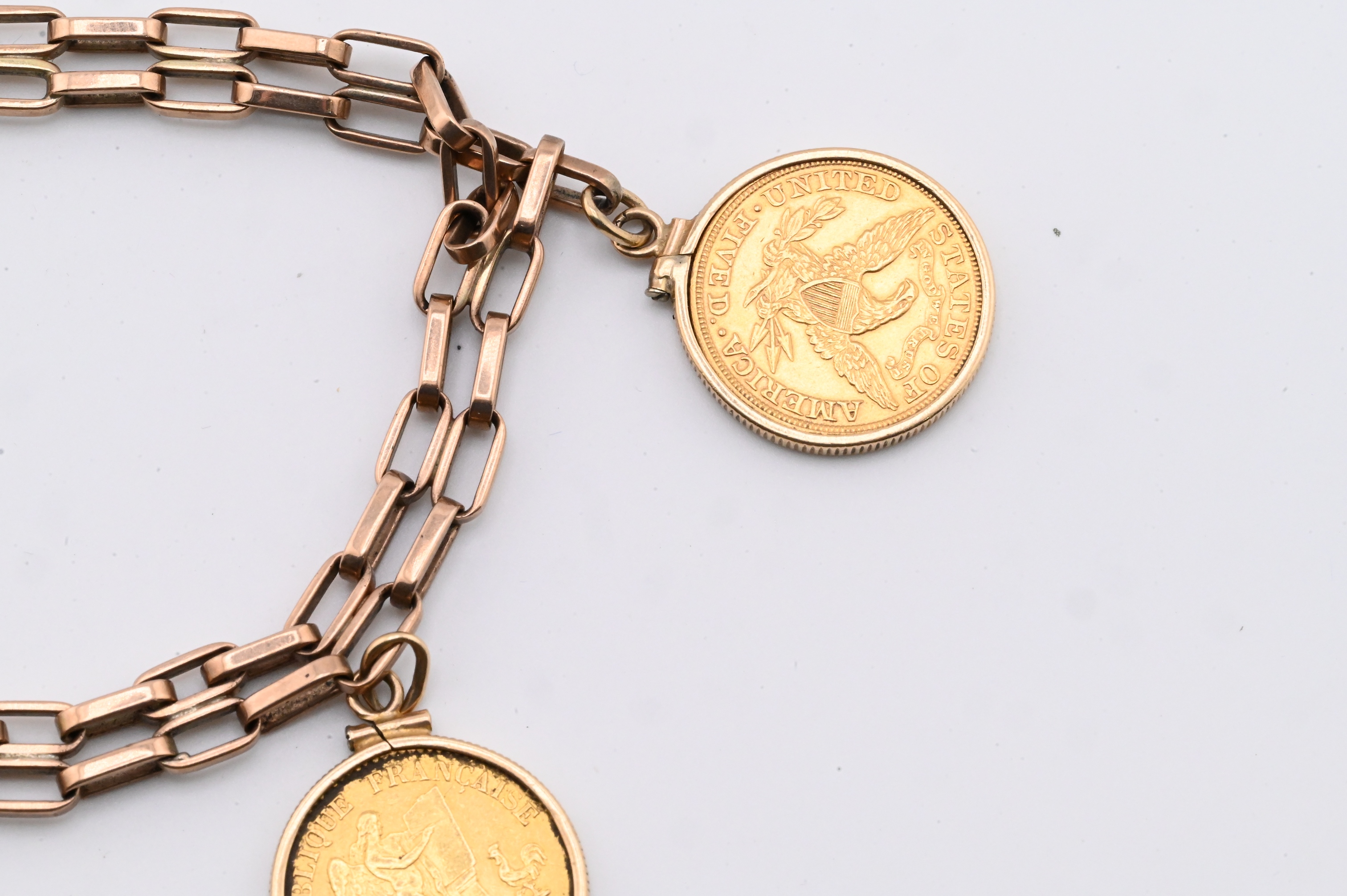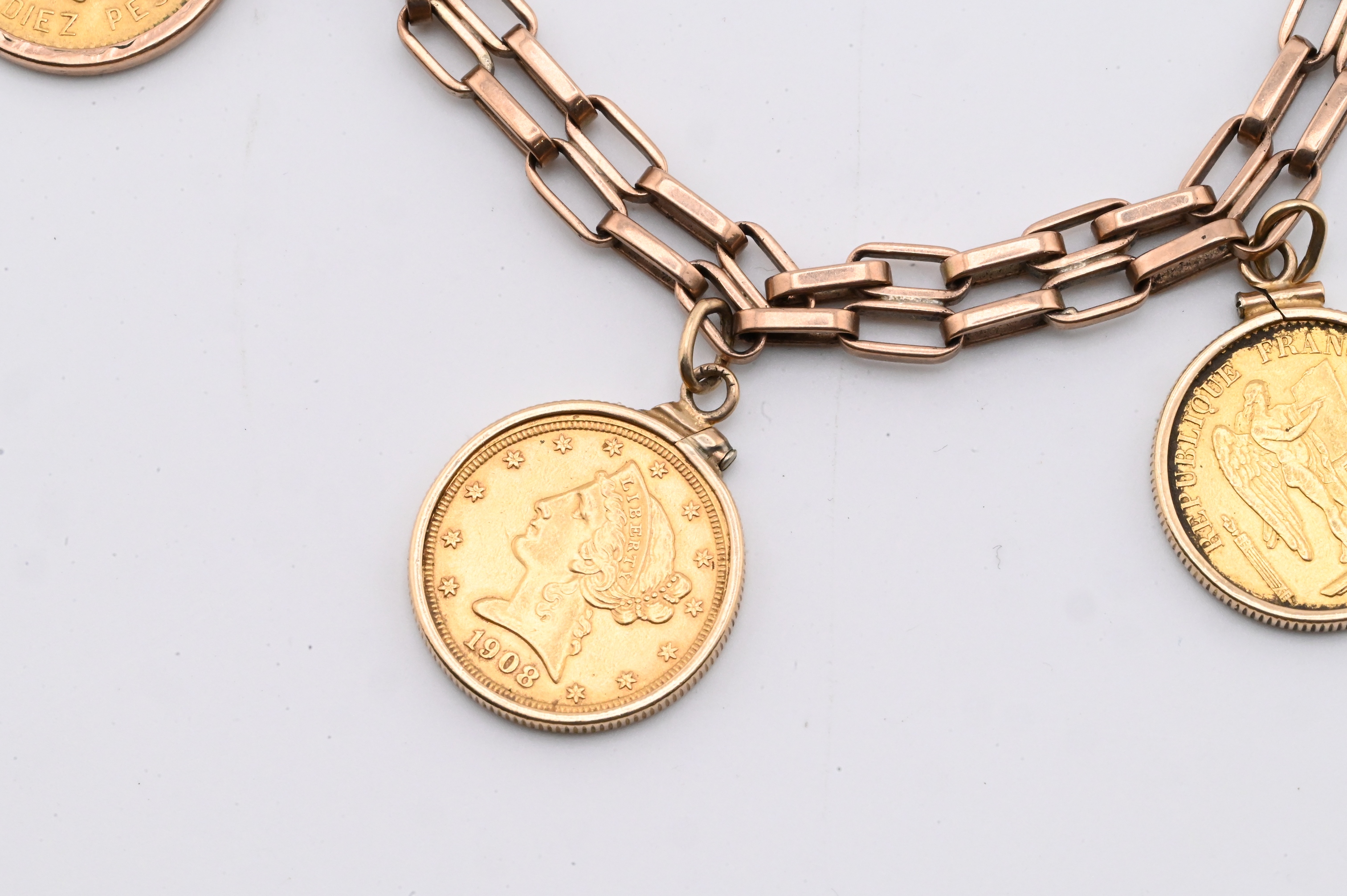 composed of two 1908 U.S. $5 Liberty Head coins, one 1917 Mexican 10 Pesos coin, and one 1878 French 20 Francs coin, each suspended from a double-link rose gold bracelet