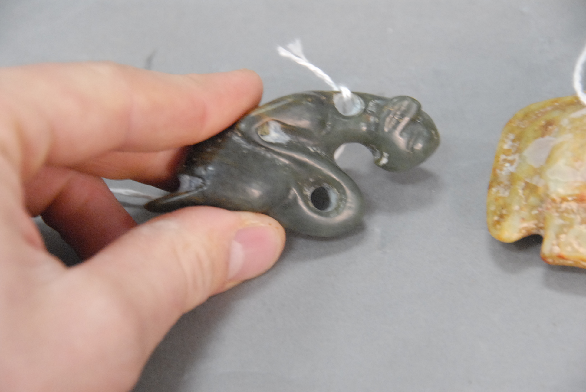 Carved green jade bat along with a carved stone celadon, celadon has a russet colored pendant.