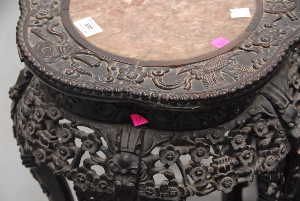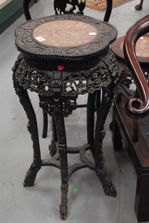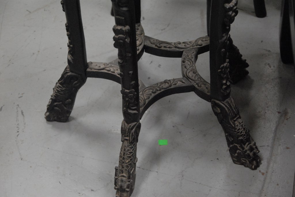 Lot 590: Chinese teakwood carved tall stand with inset rouge marble set on dragon carved feet. ht. 33in. dia. 16in.