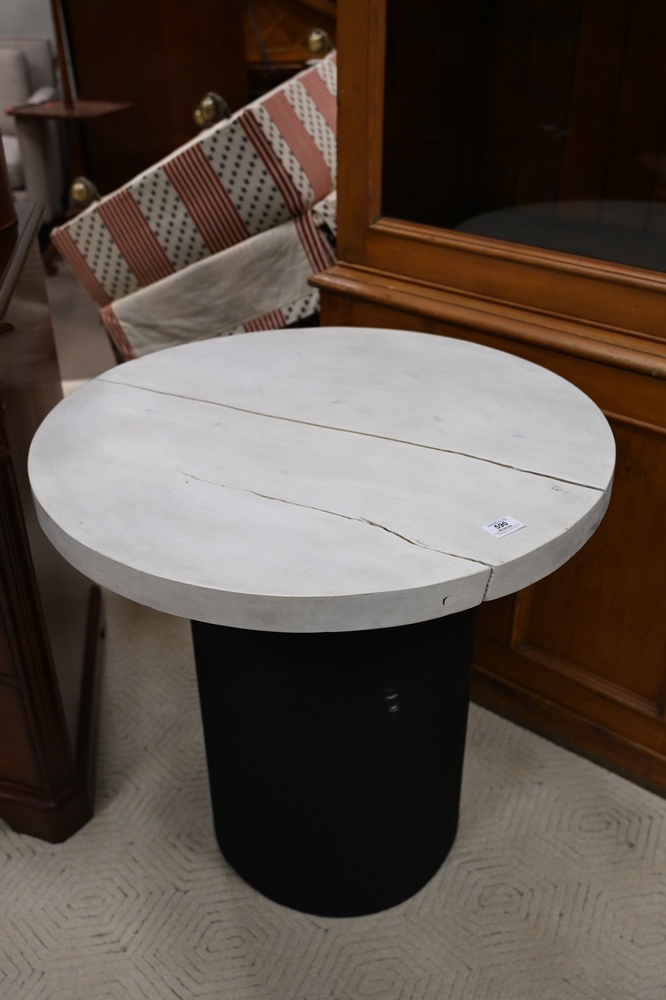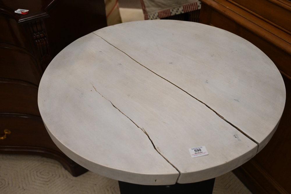 Lot 590: Contemporary Pedestal Table, having revolving top, height 29 1/2 inches, diameter 28 inches, top with splits.