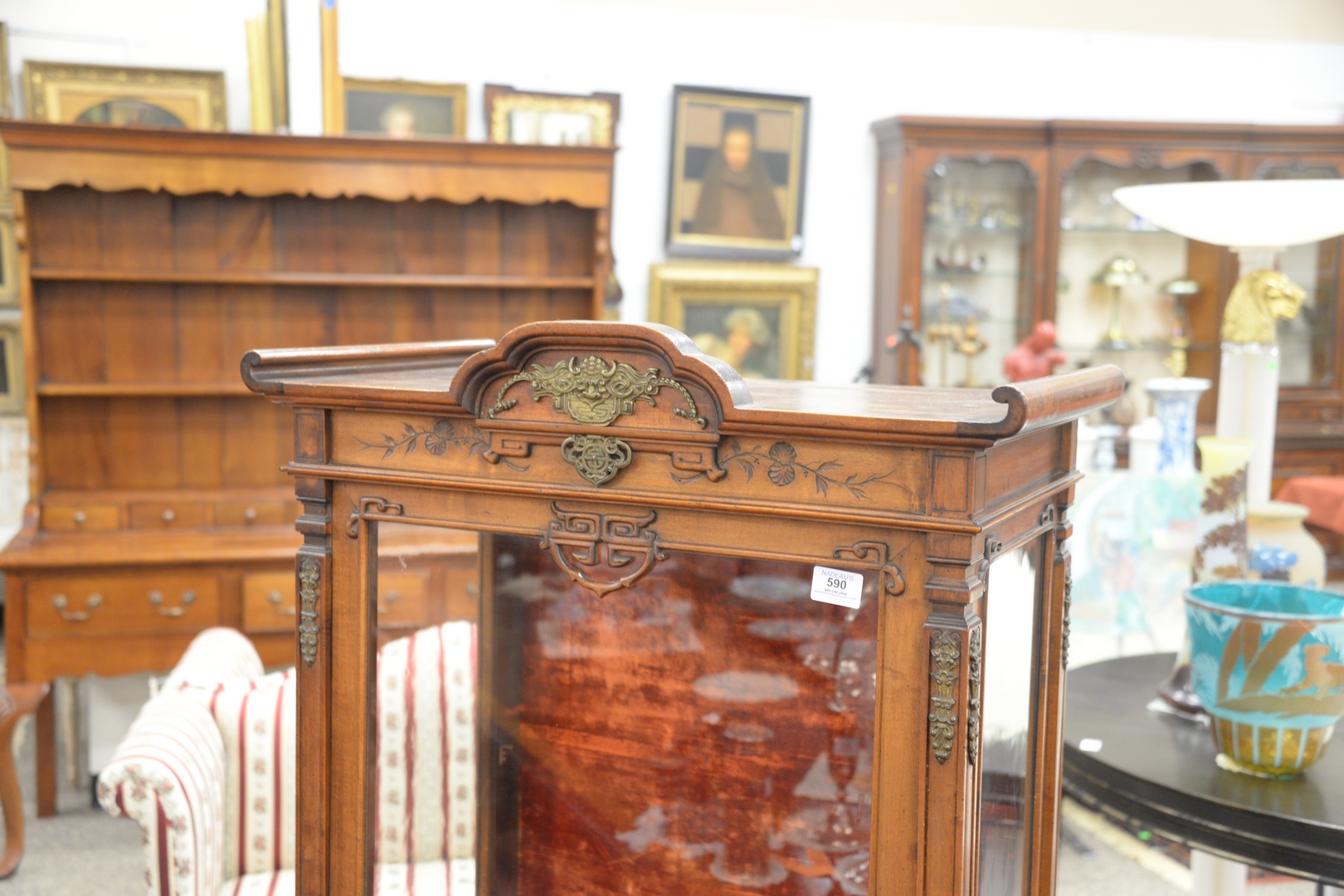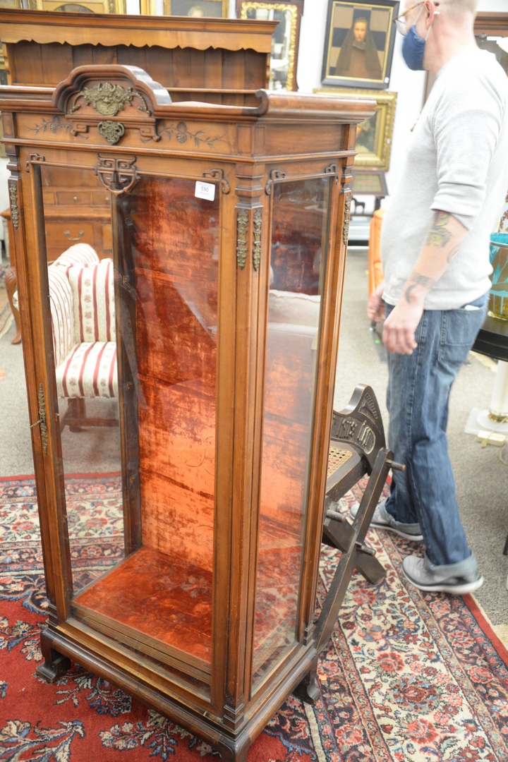 Lot 590: Continental Style Vitrine, having brass mounts, interior back with velour, height 58 inches, width 26 1/2 inches.