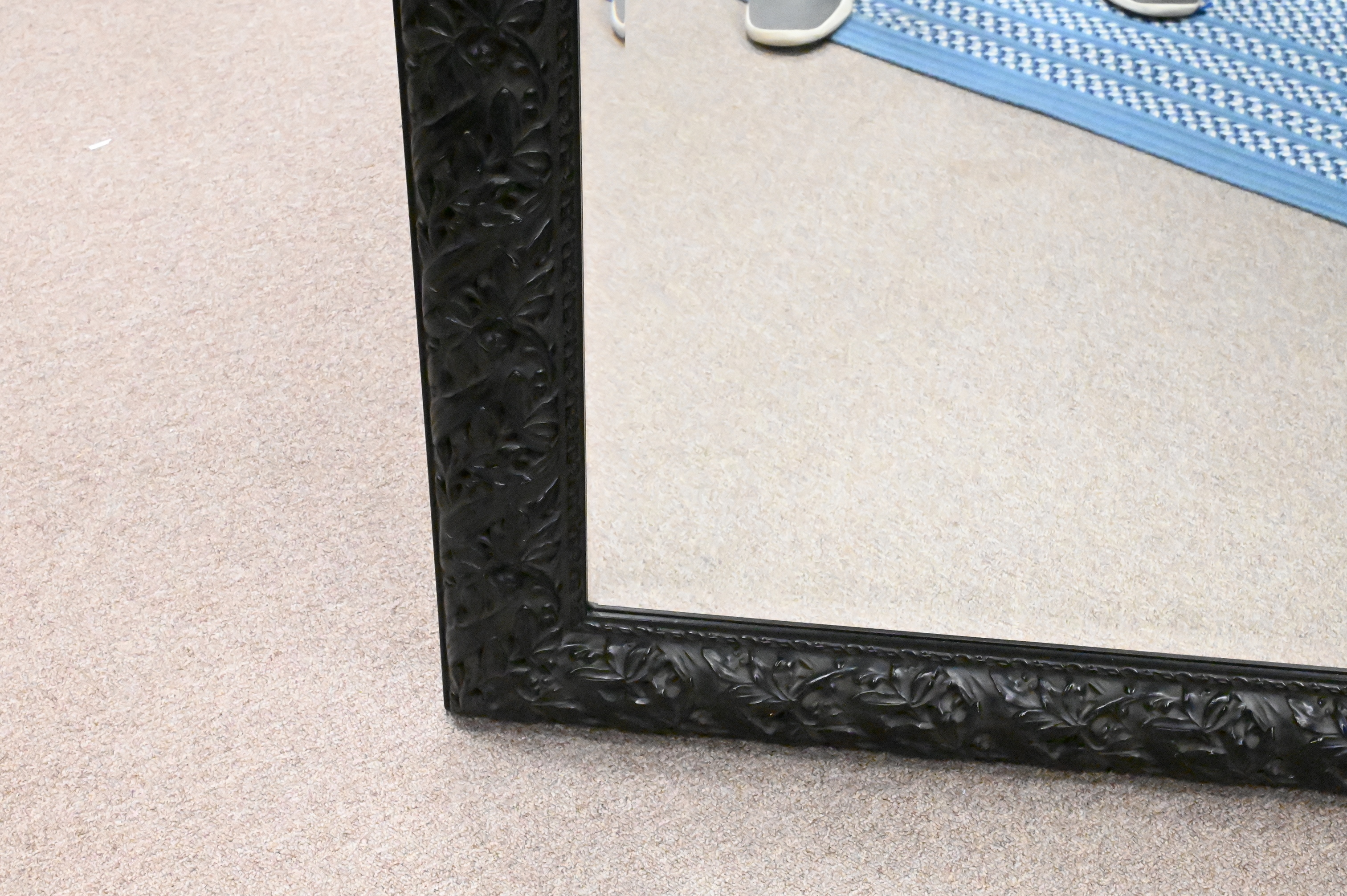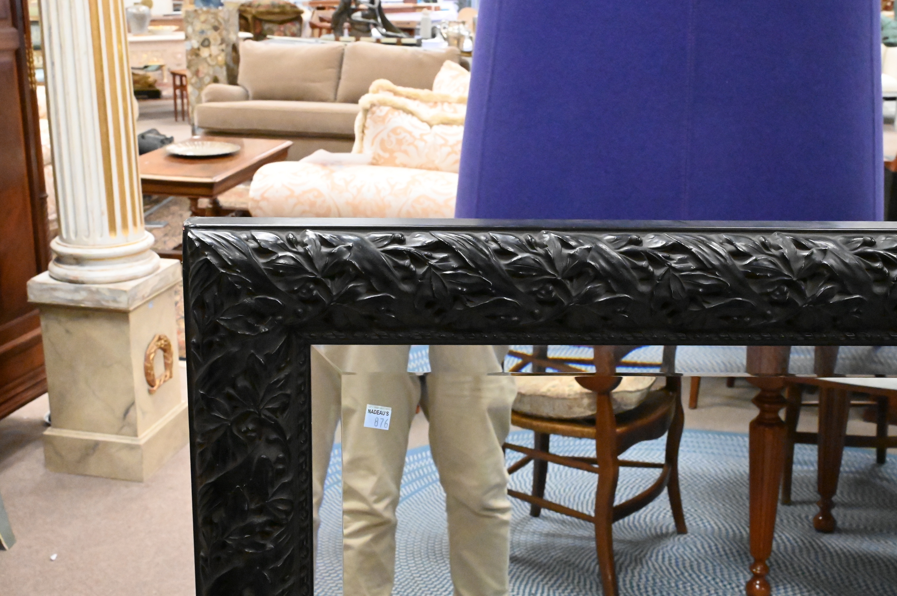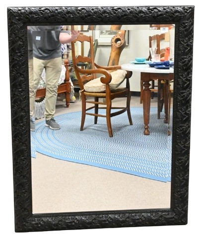 rectangular beveled glass mirror having carved and ebonized berry and leaf motif frame, label on verso
