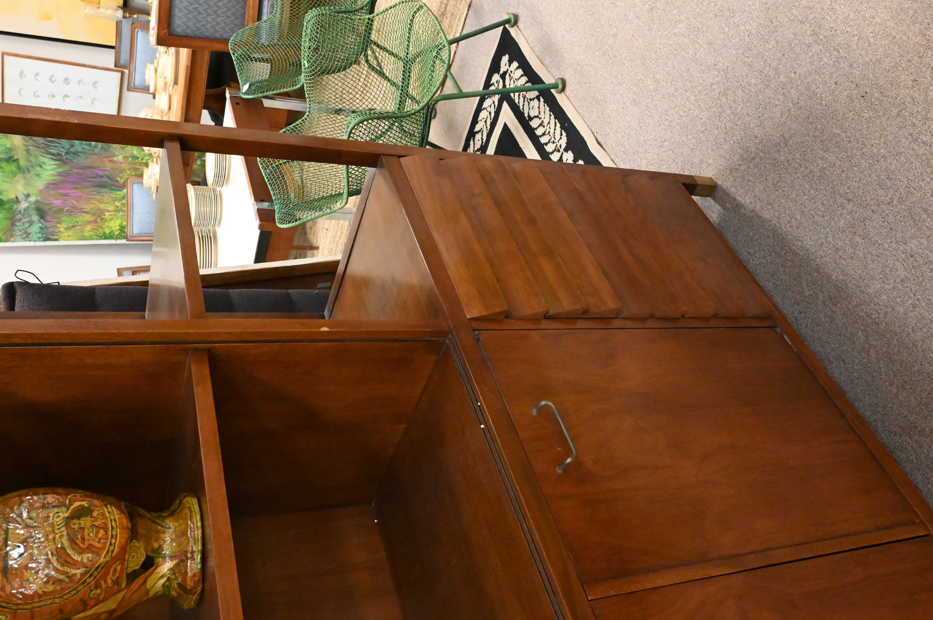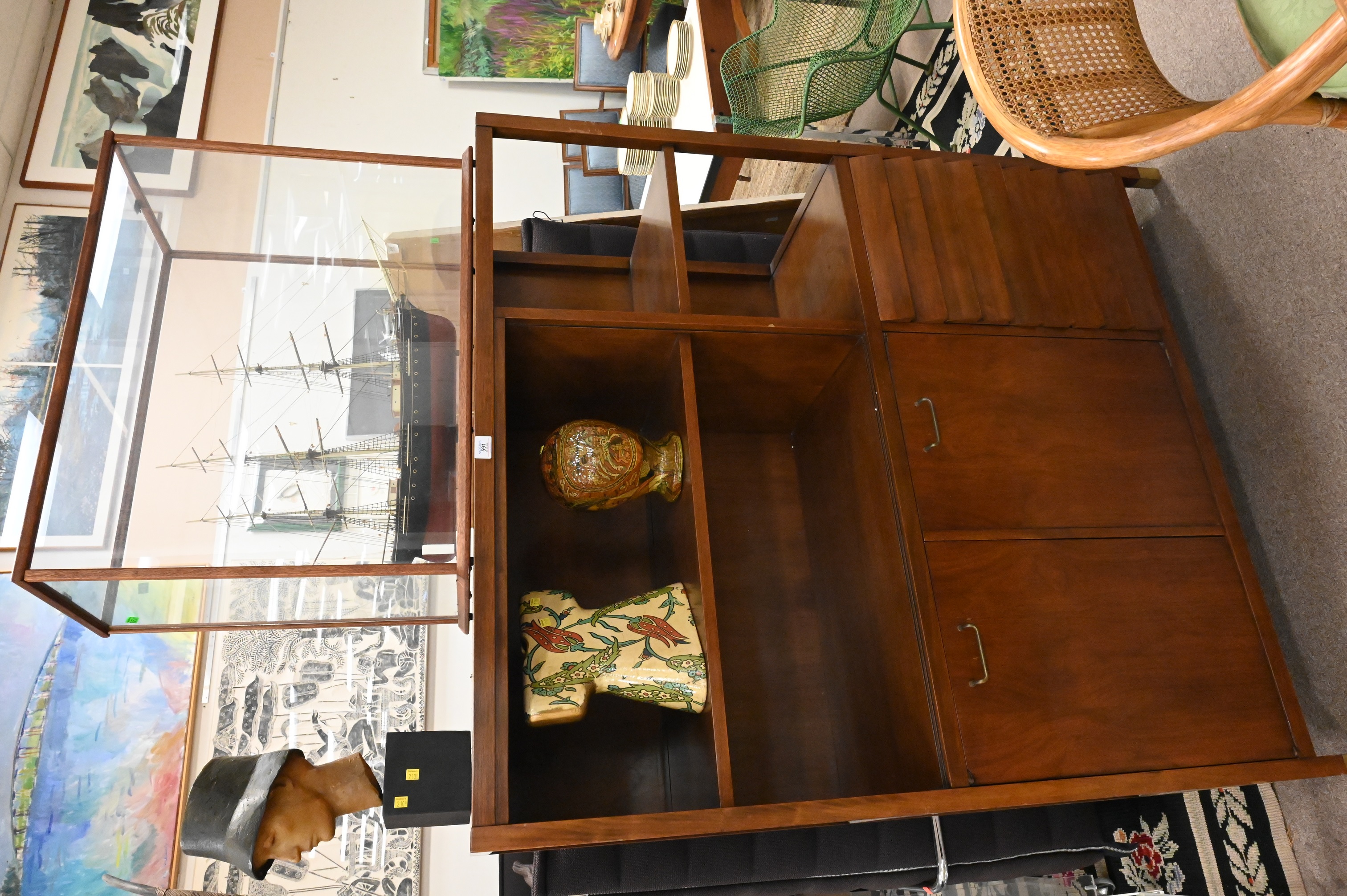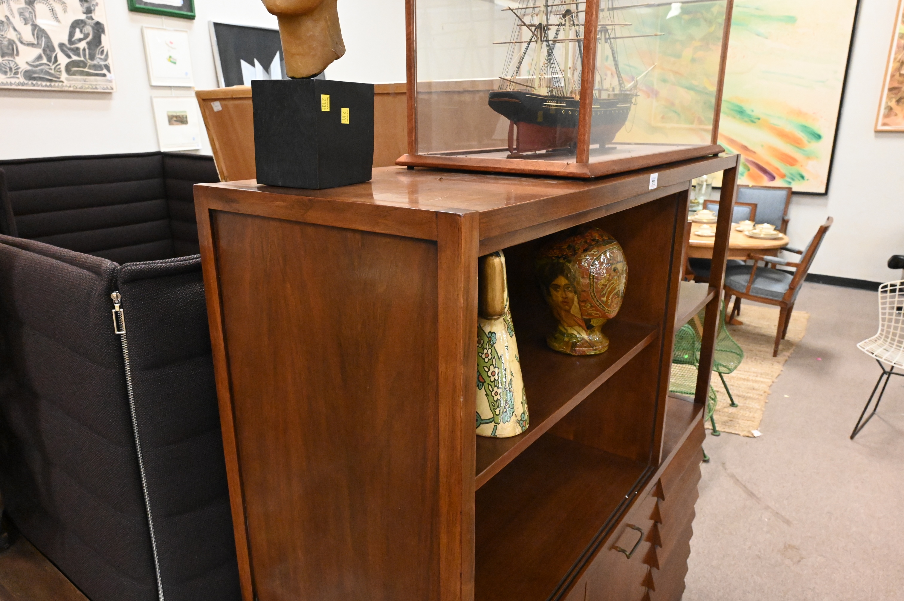 having open shelving over two doors and a stack of four drawers ending in brass capped feet