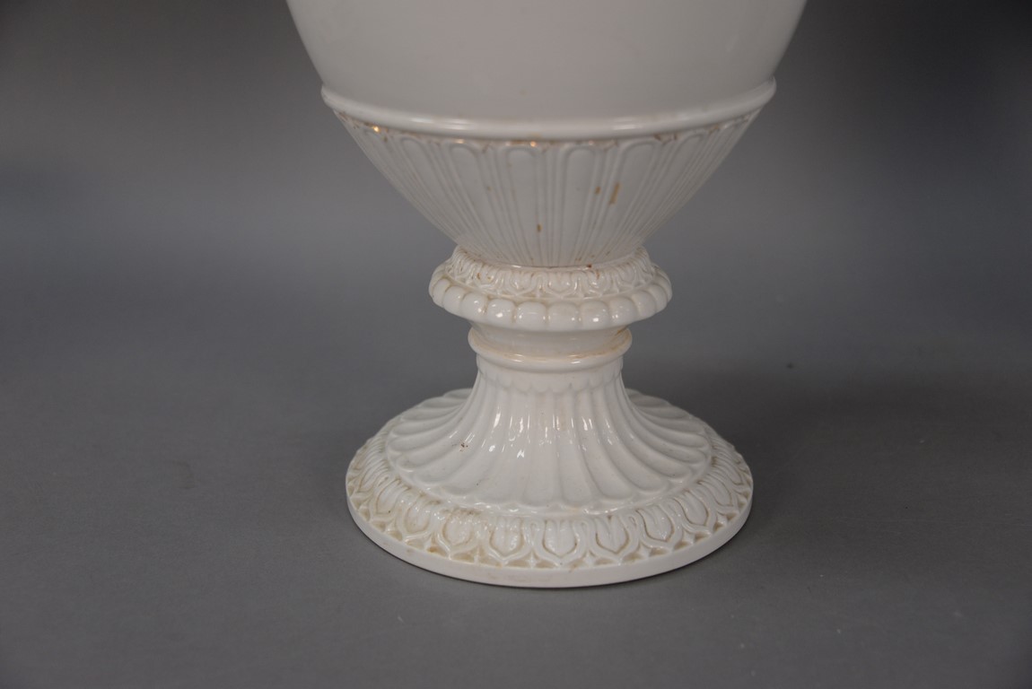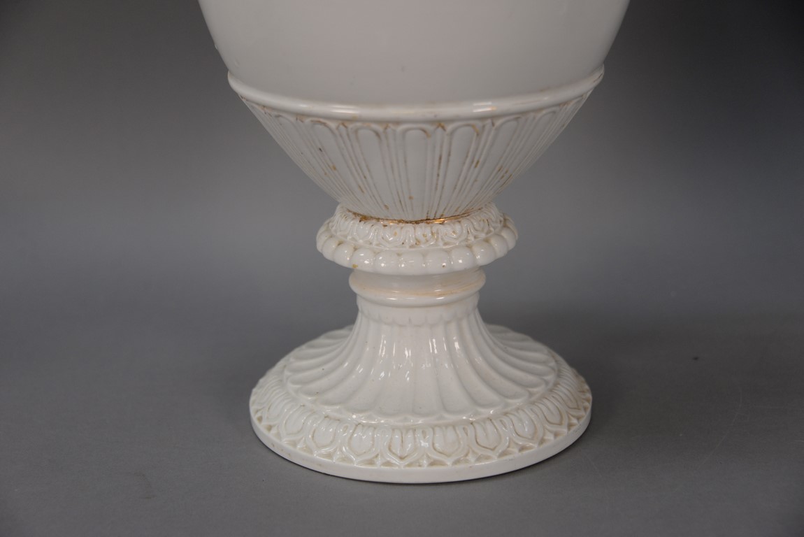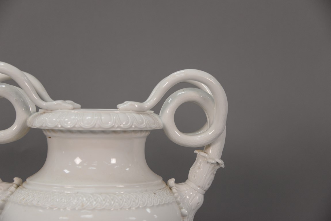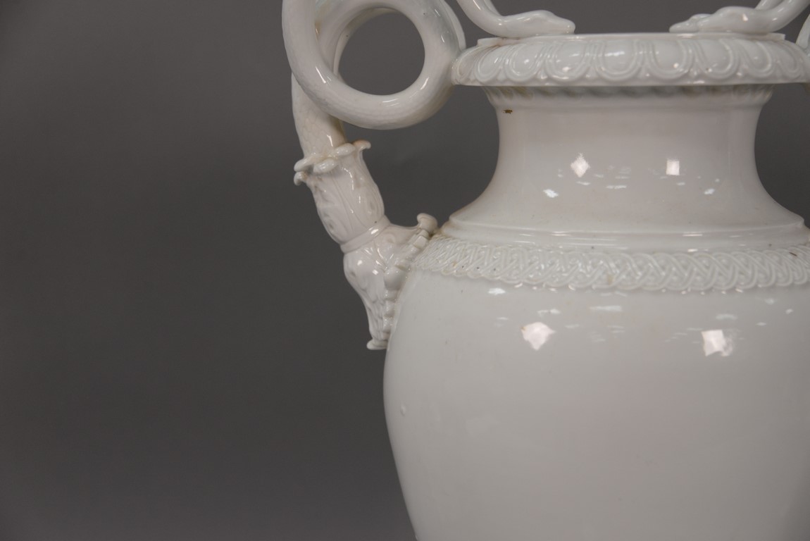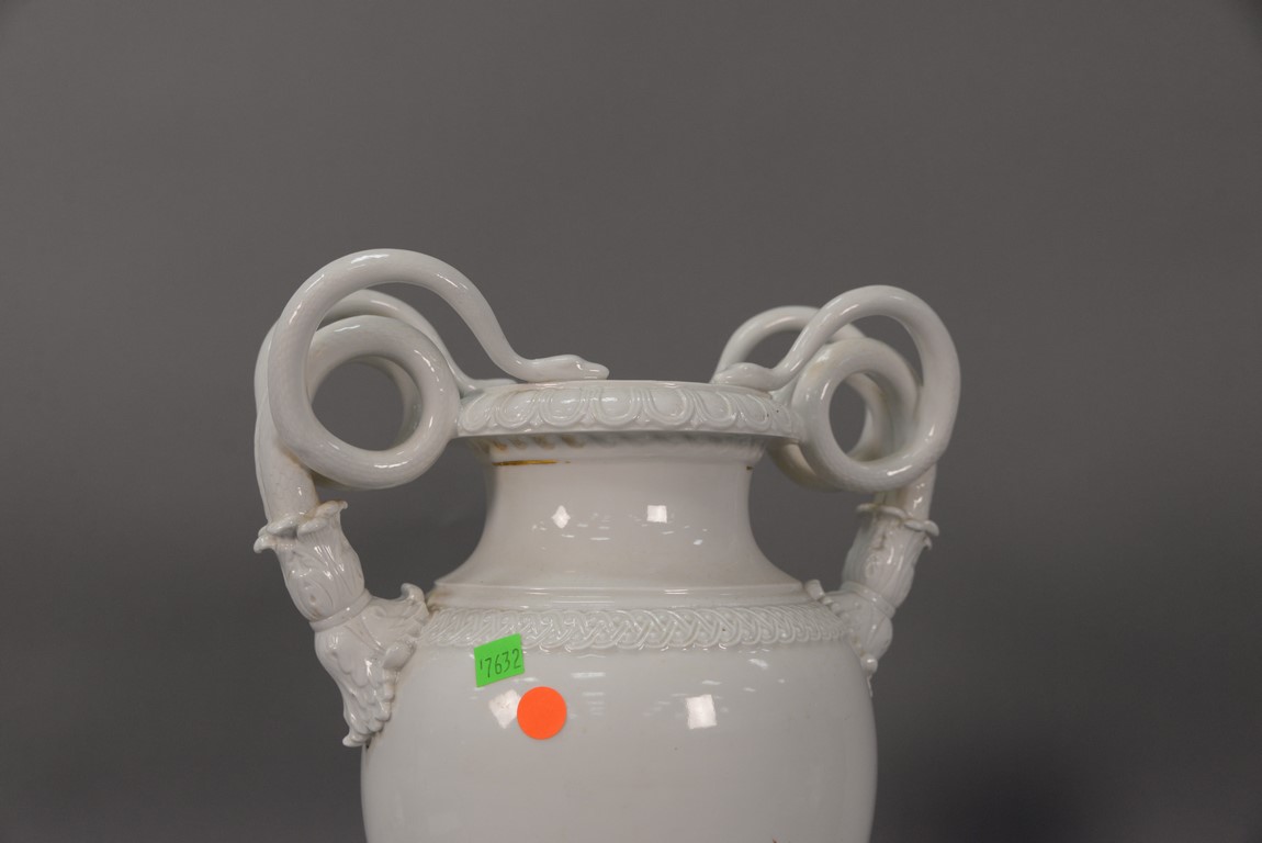 Meissen white porcelain urn with serpent handles. ht. 19 in.