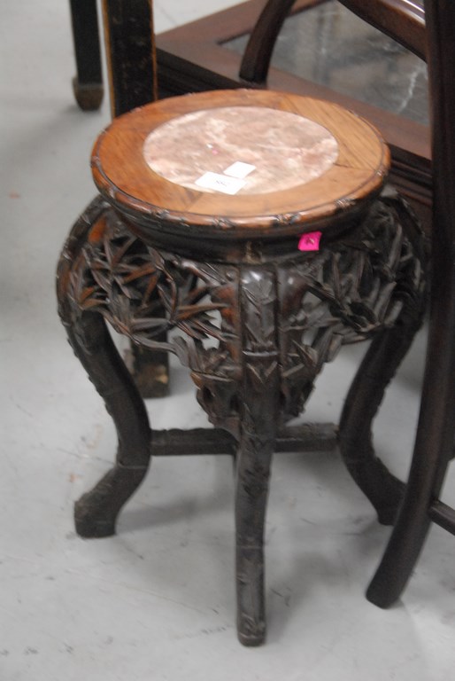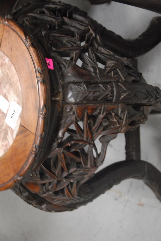 Lot 592: Chinese teakwood low stand, round top with inset marble on scrolled legs. ht. 18 1/2in. dia. 11in.