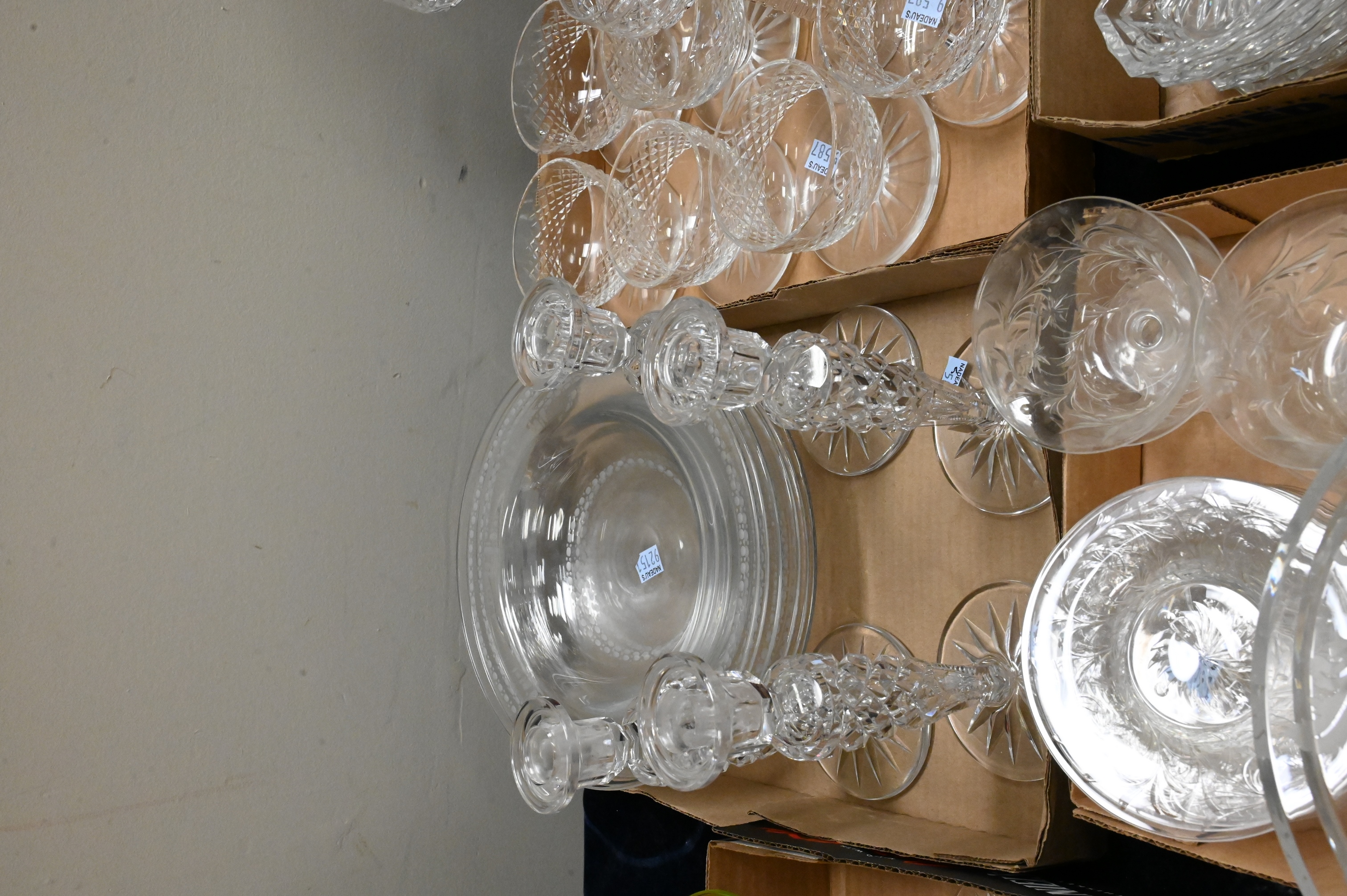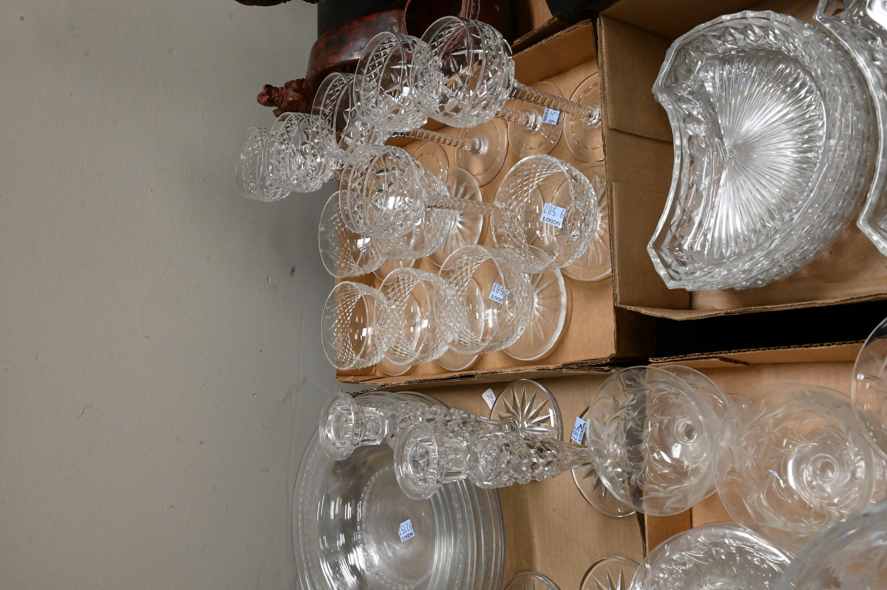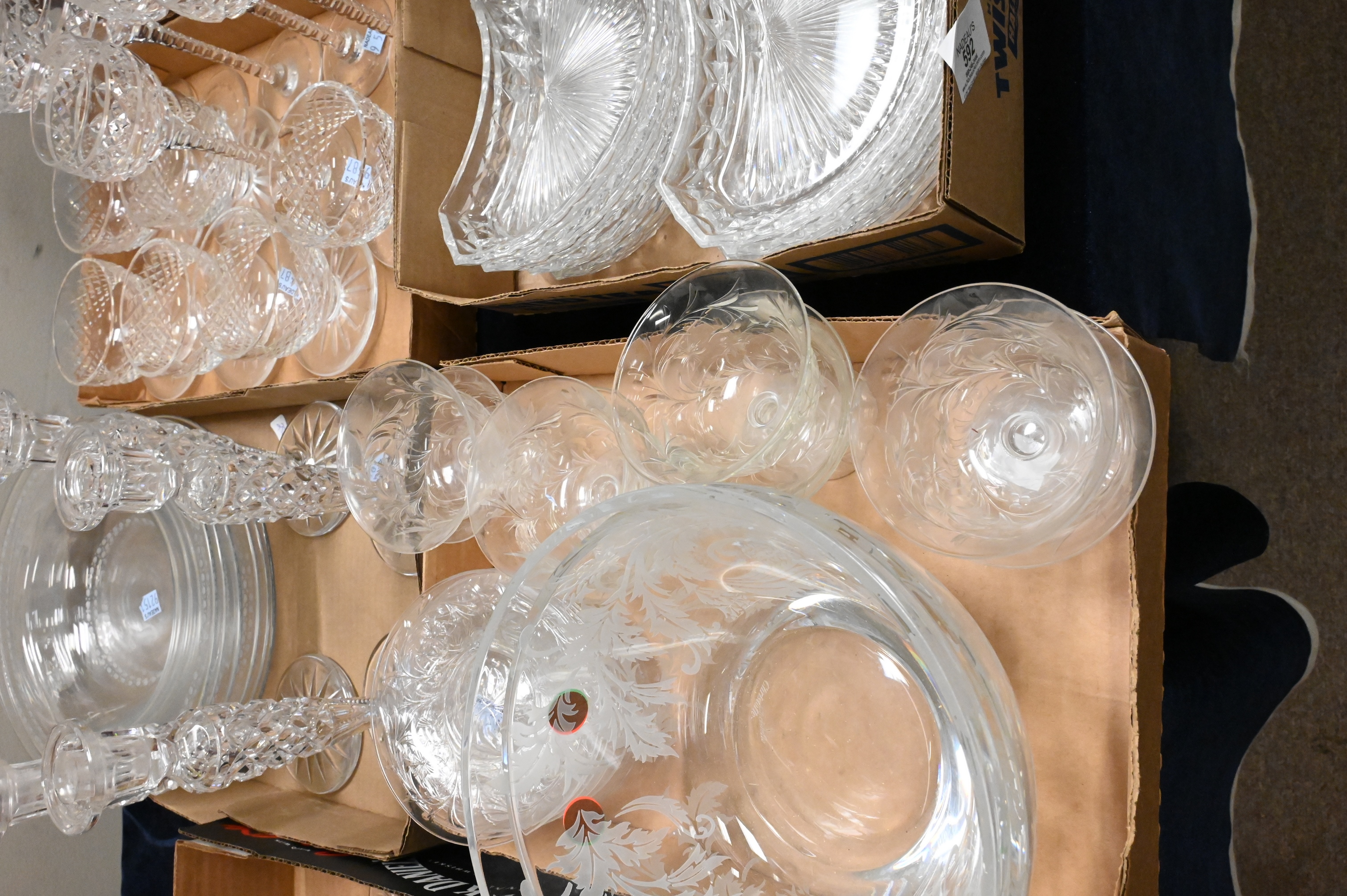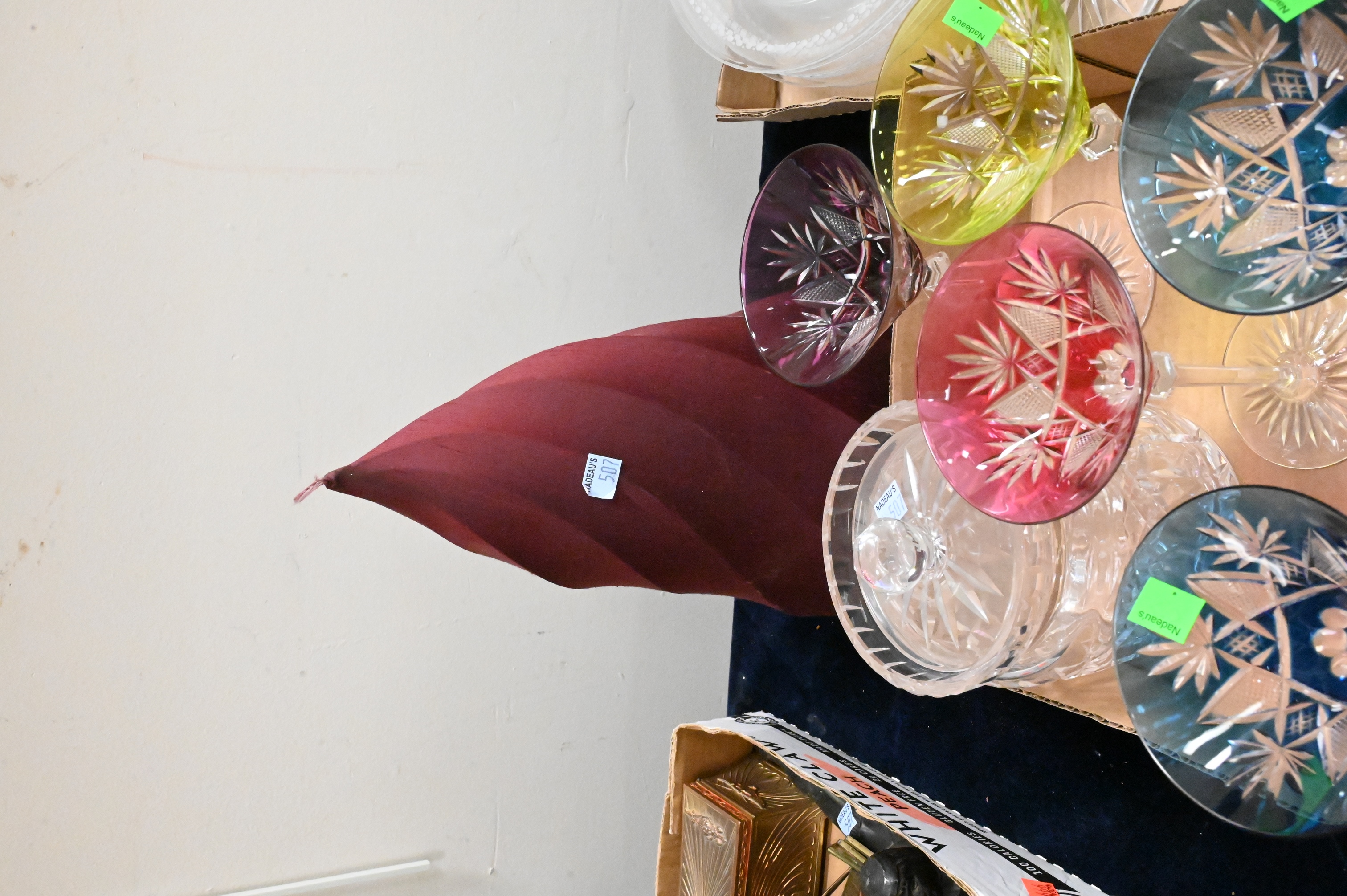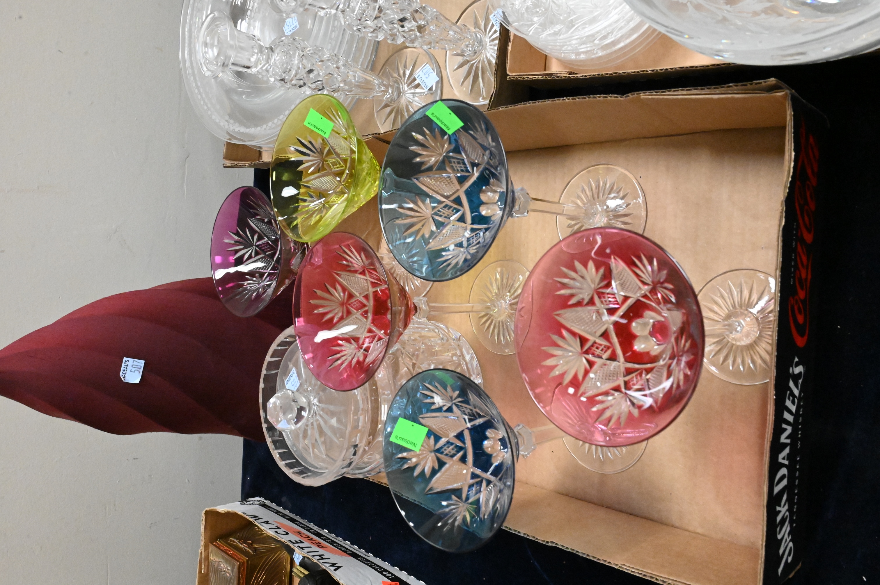 to include two etched Christofle bowls, Hawkes etched sherberts and saucers, Stuart stems, Waterford sherberts, Libbey bowls, Val St. Lambert cut glass crescent dishes, six colored Val St. Lambert style cocktail glasses (unsigned)