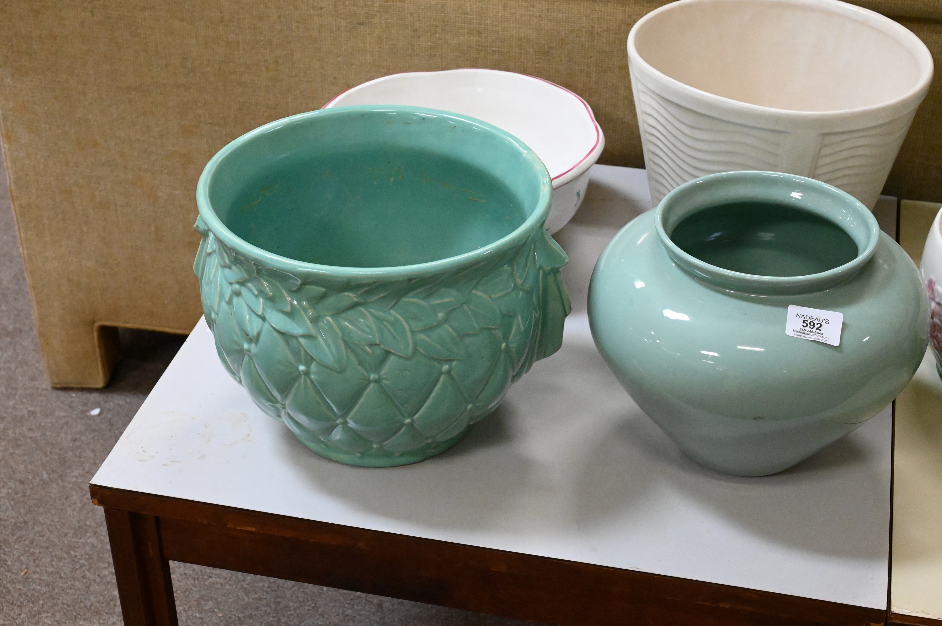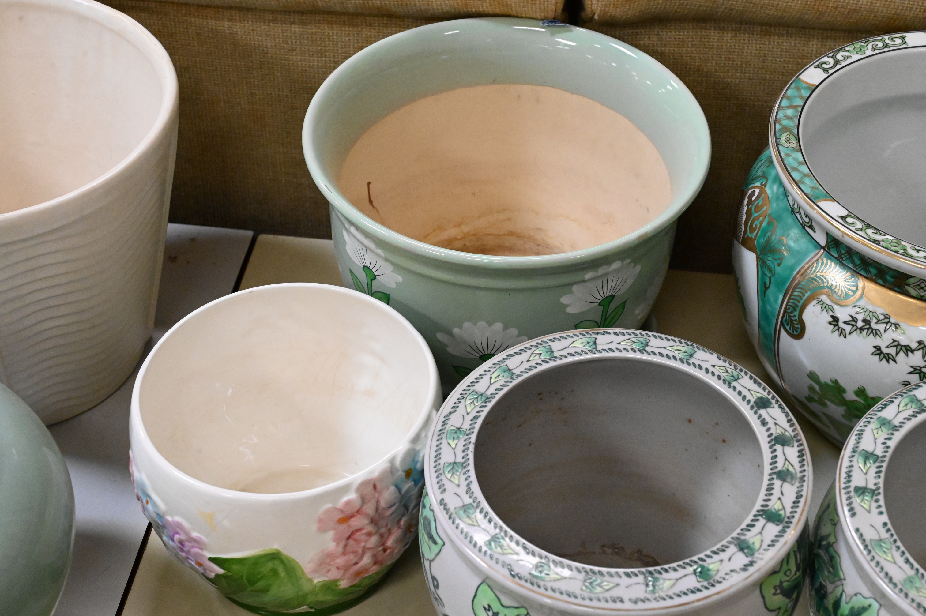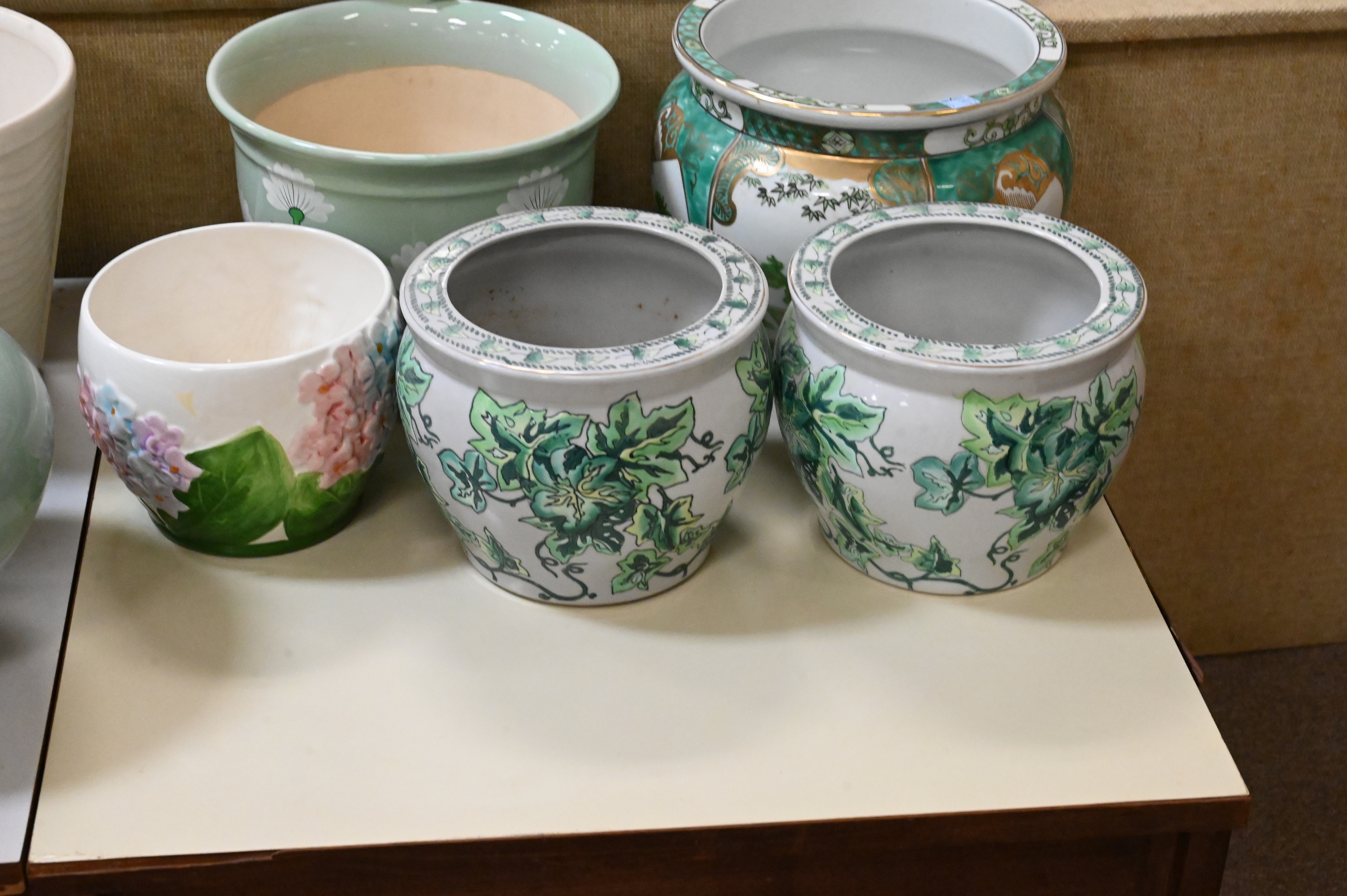McCoy ceramics, Gold Imari baluster form green and gilt, pair of ivy motif planters, French jardiniere etc…