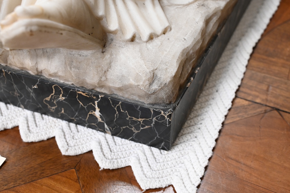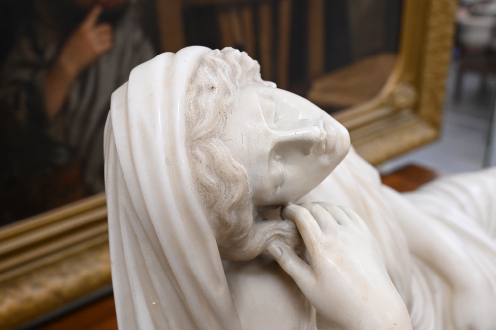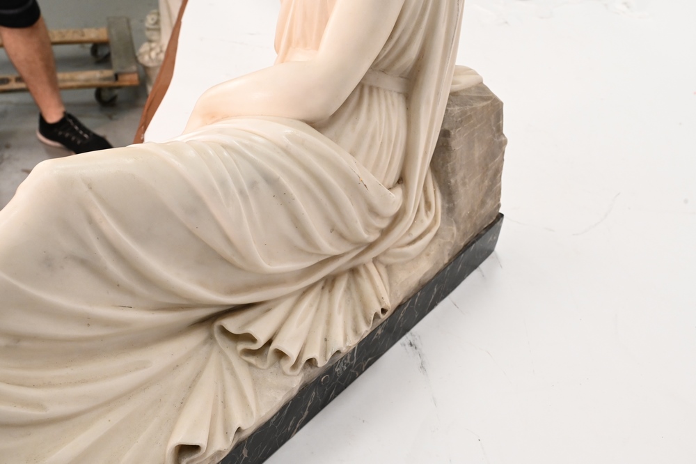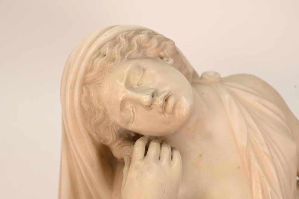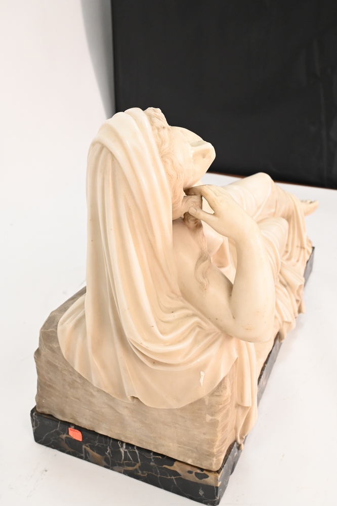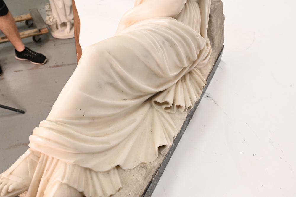 Lot 592: Large White Marble Sculpture of a Partially Clad Reclining Woman, on granite base, height 20 inches, length 28 inches, (repaired han…