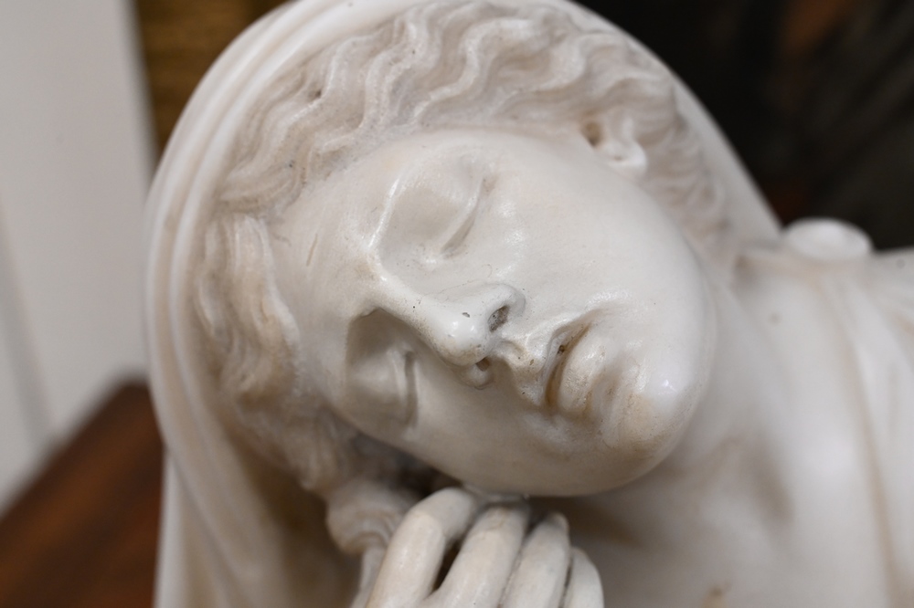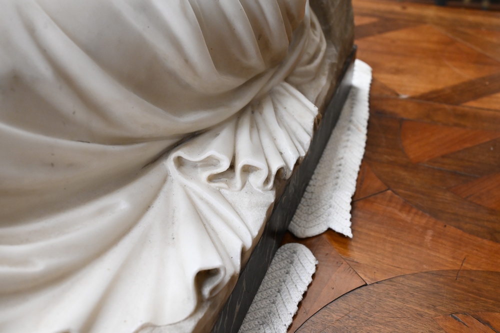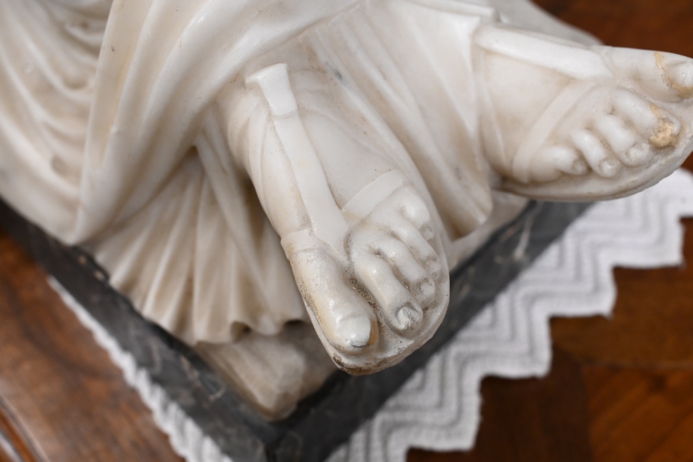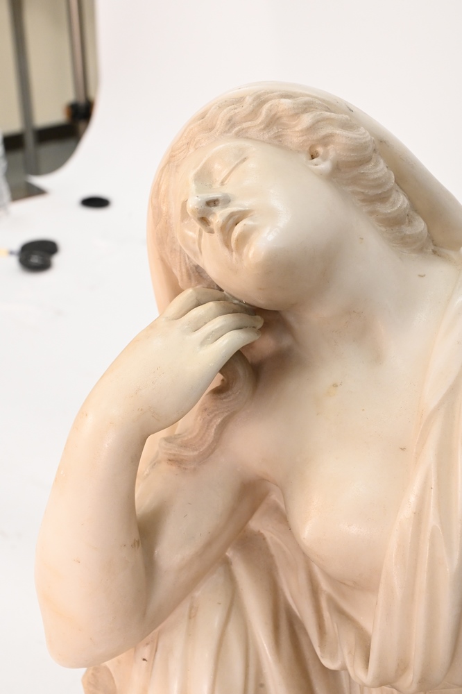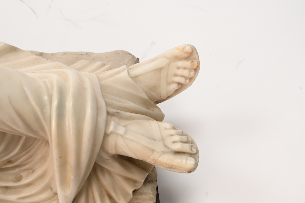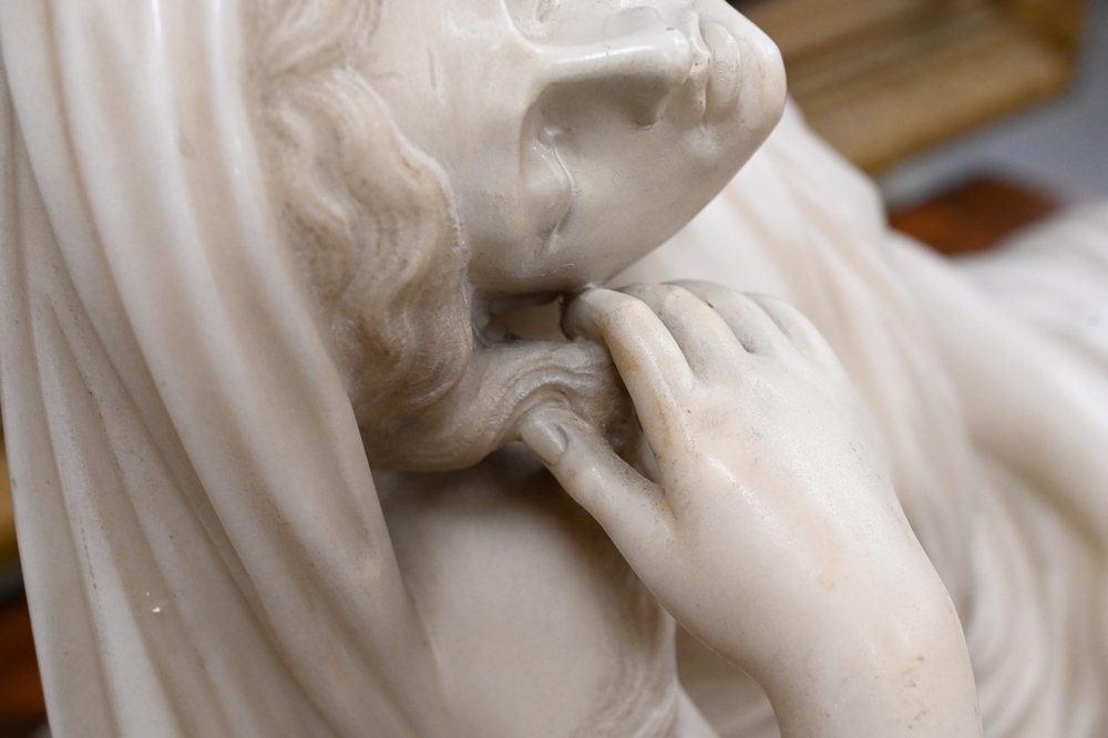Lot 592: Large White Marble Sculpture of a Partially Clad Reclining Woman, on granite base, height 20 inches, length 28 inches, (repaired han…
