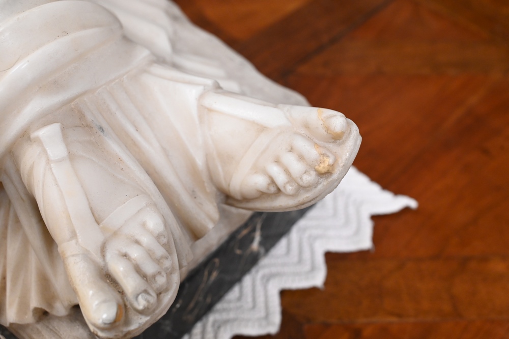 Large White Marble Sculpture of a Partially Clad Reclining Woman, on granite base, height 20 inches, length 28 inches, (repaired hand, face and toes).