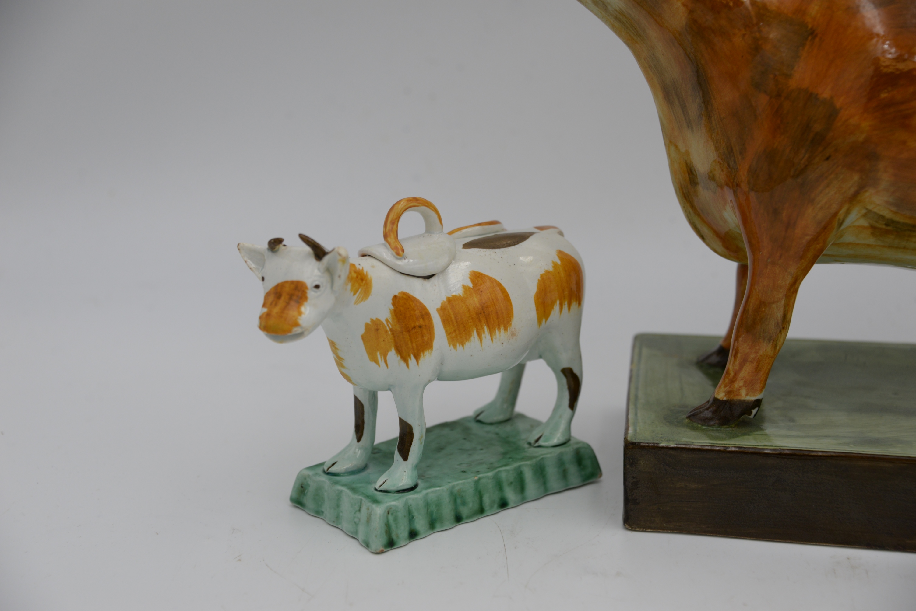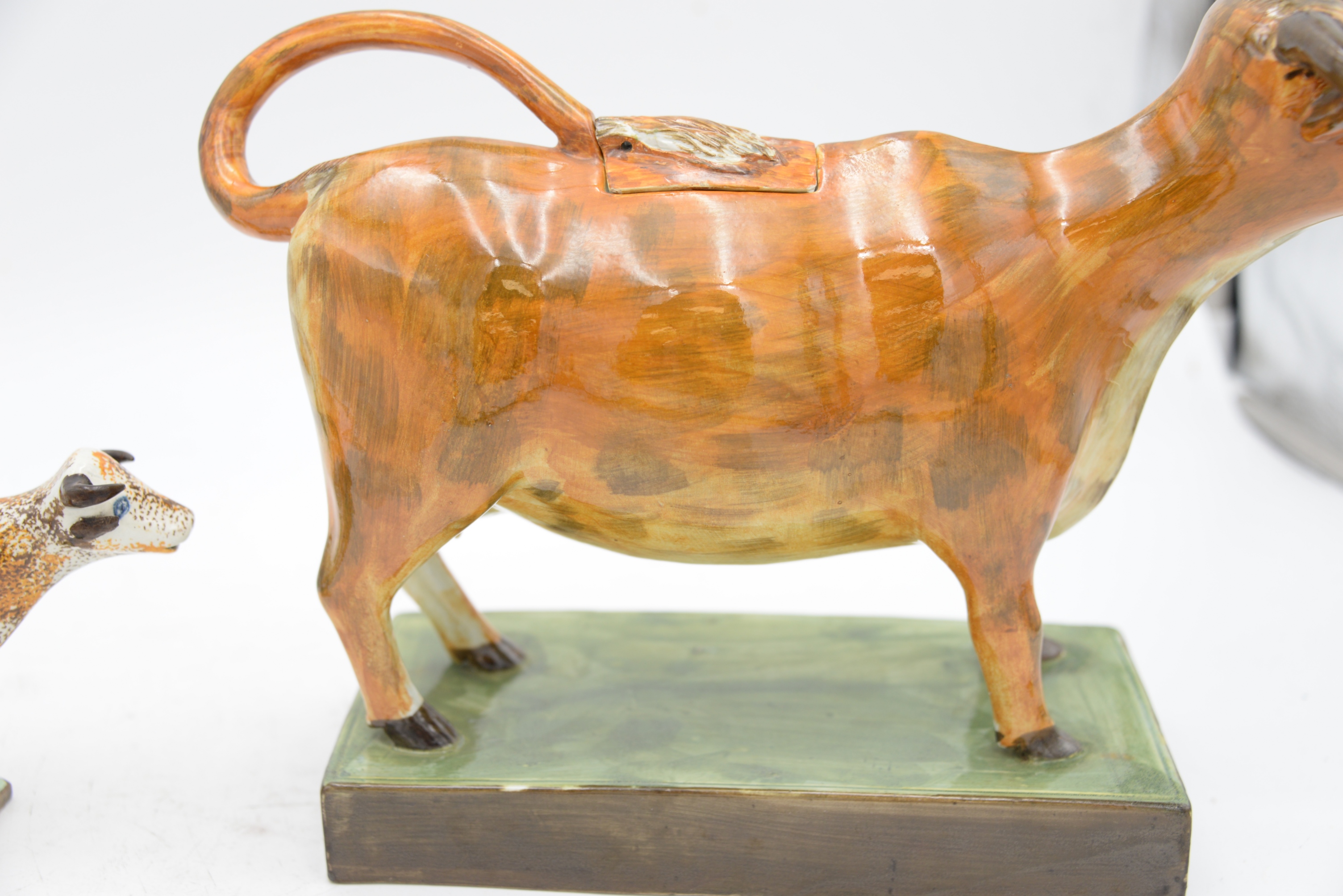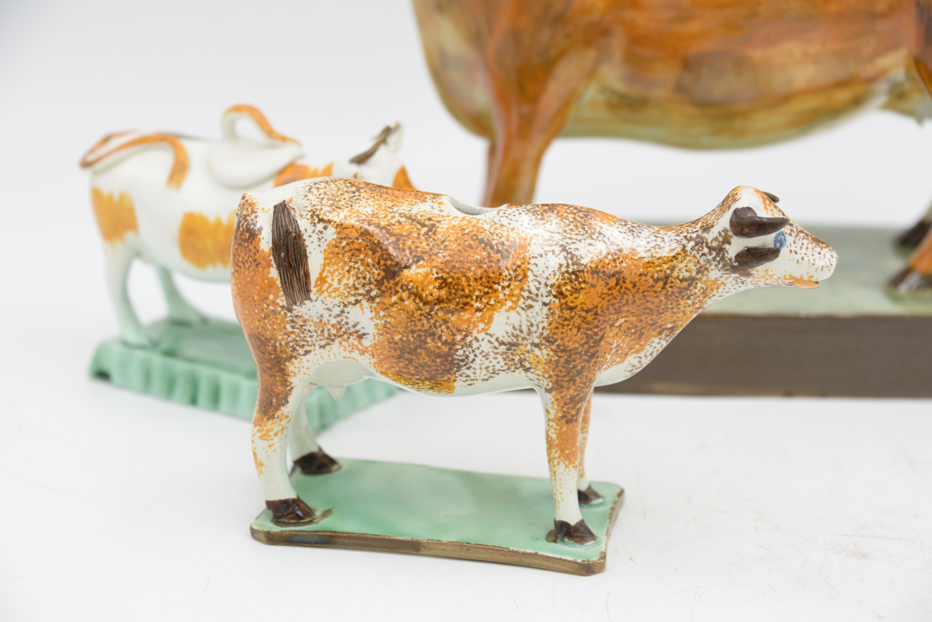 Three English Staffordshire Pearlware Cow Creamers, to include one spongeware cow with blue eyes (broken tail and repaired ear), DM & P Monheim label on reverse, height 4 1/2 inches; orange and brown spotted cow with lid (repaired horn and tail), height 4 1/4 inches; along with large orange cow with lid (repaired horns, tail and base), height 9 1/2 inches.
