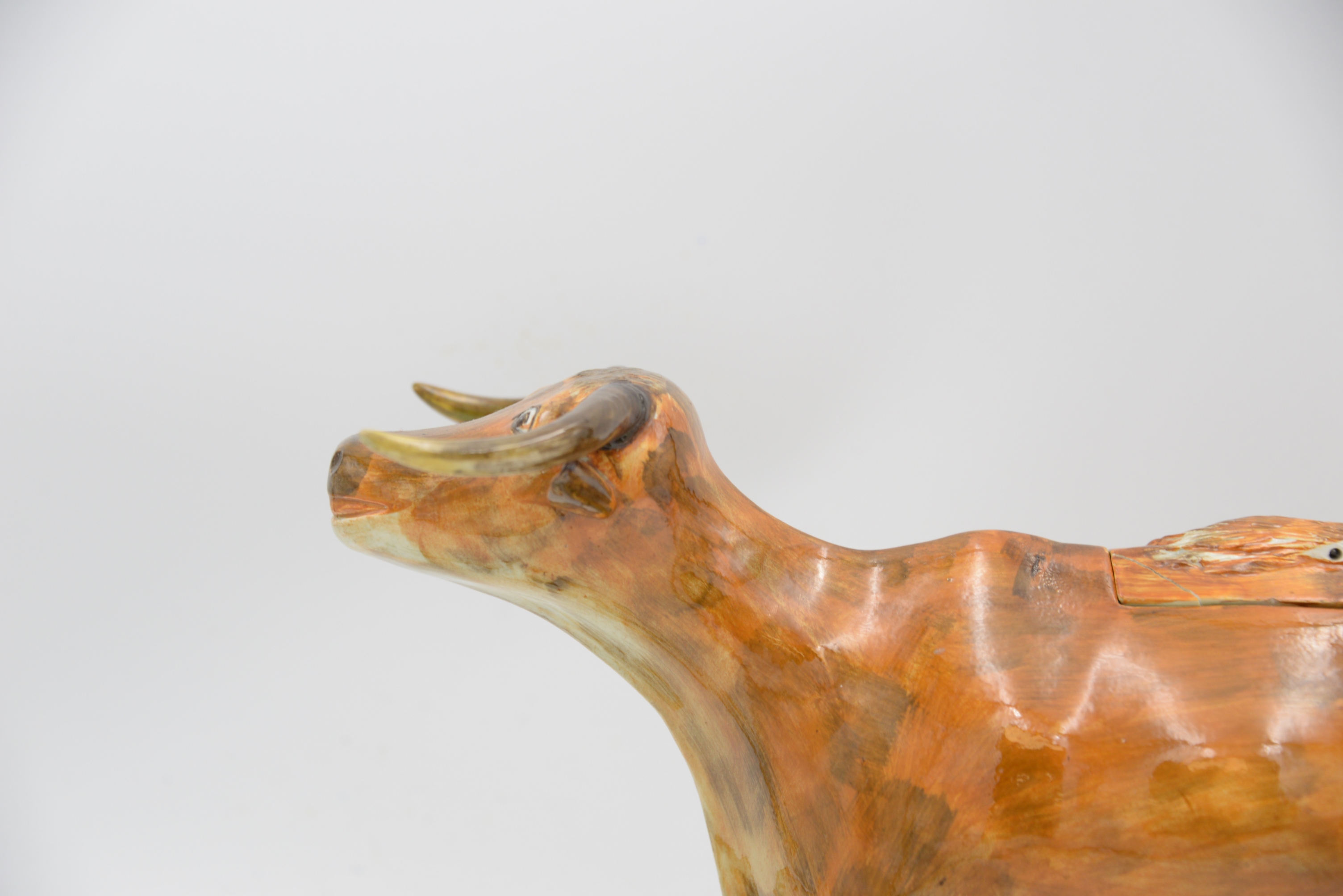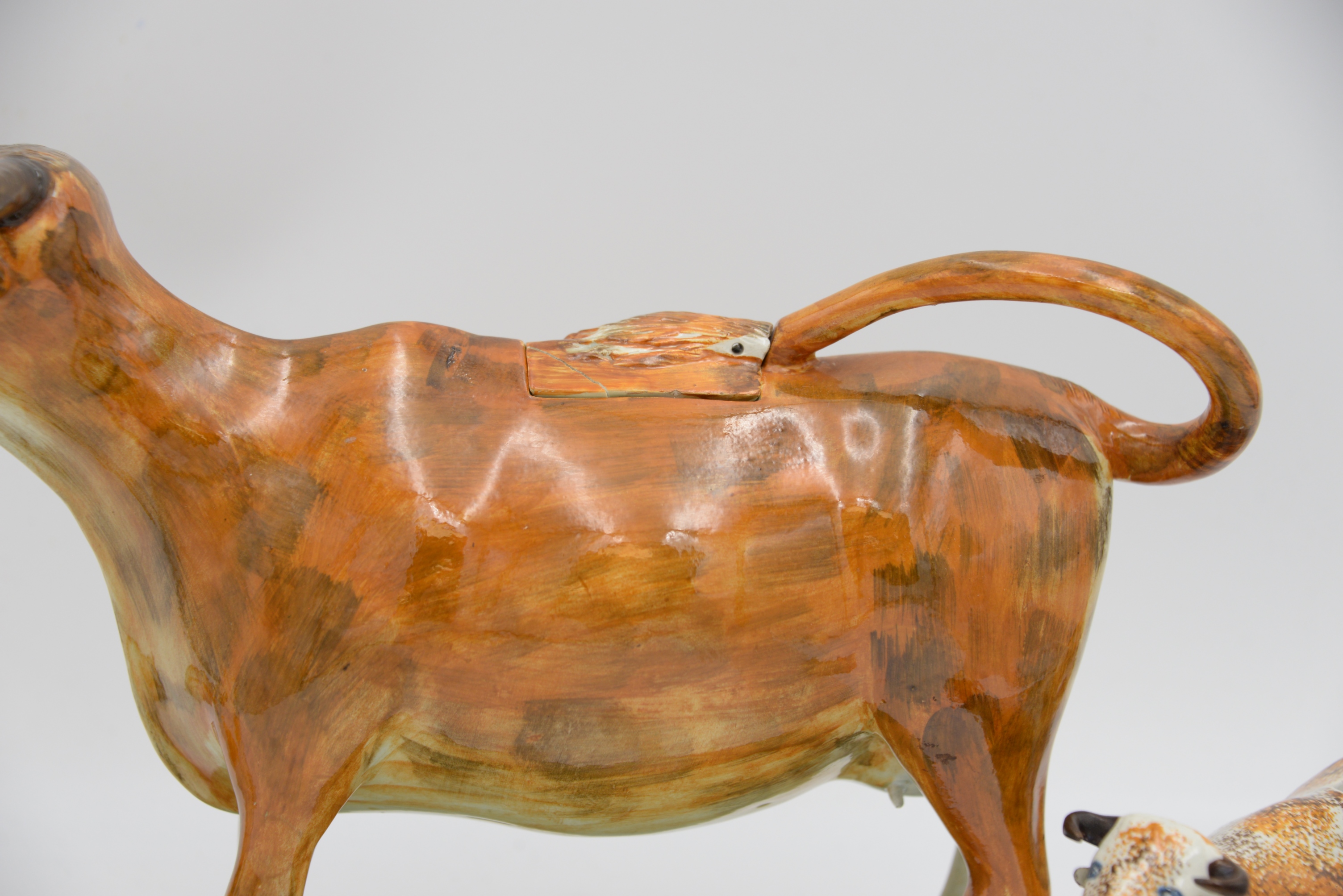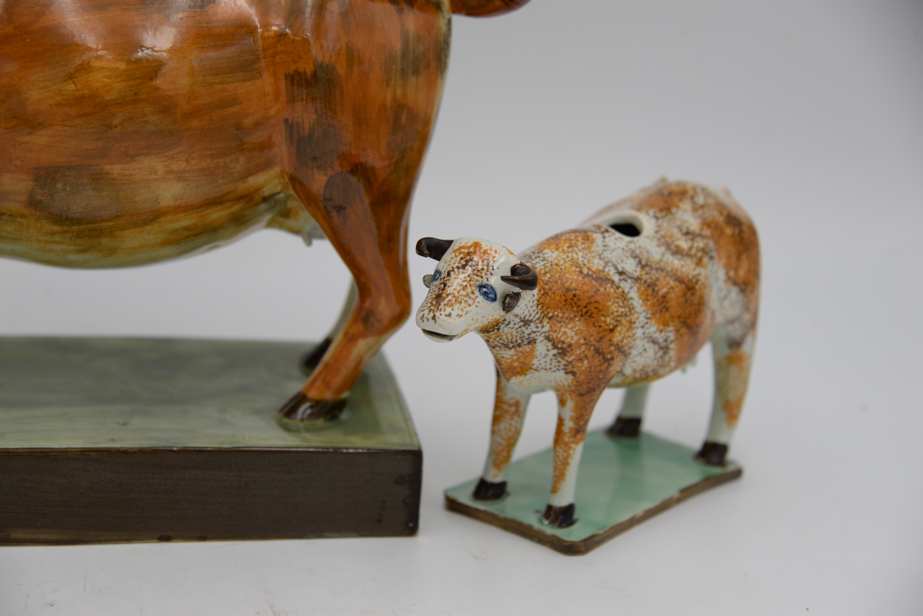 Three English Staffordshire Pearlware Cow Creamers, to include one spongeware cow with blue eyes (broken tail and repaired ear), DM & P Monheim label on reverse, height 4 1/2 inches; orange and brown spotted cow with lid (repaired horn and tail), height 4 1/4 inches; along with large orange cow with lid (repaired horns, tail and base), height 9 1/2 inches.