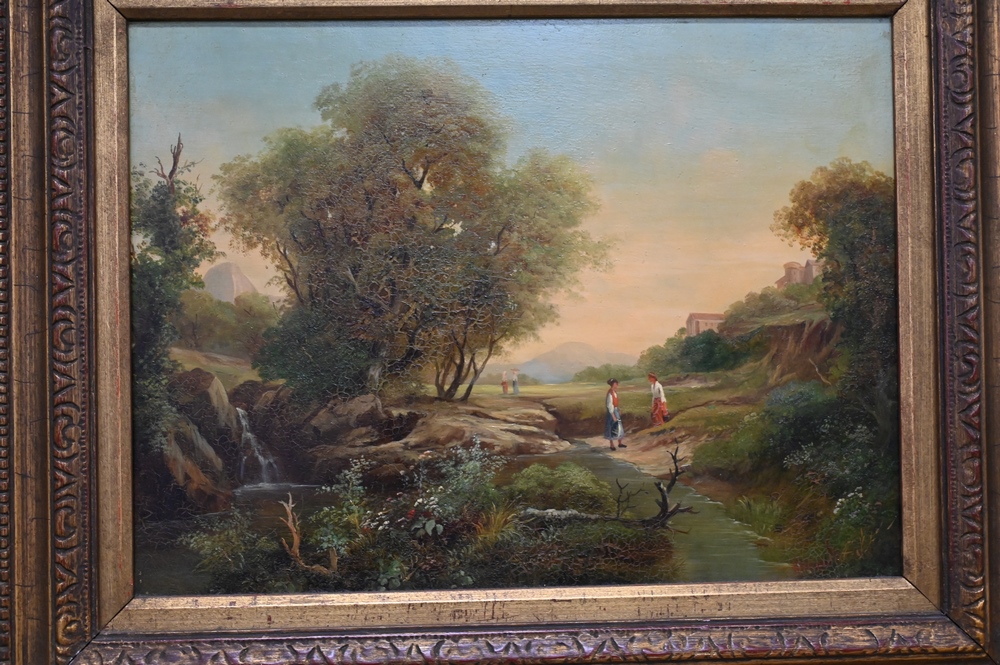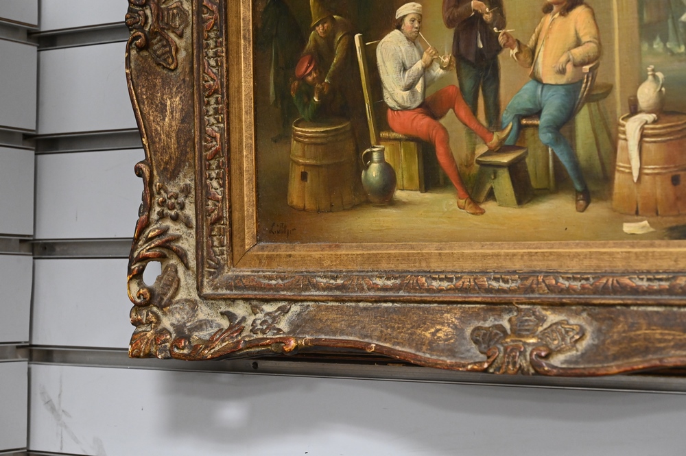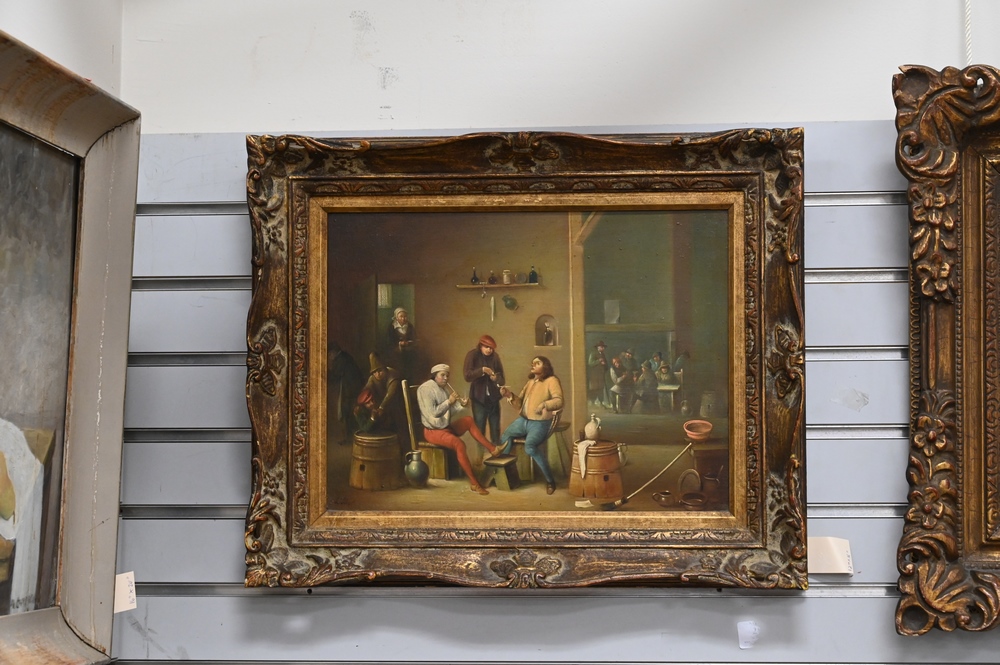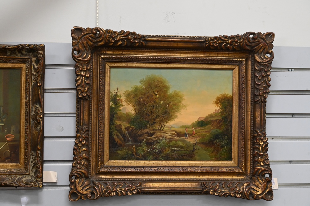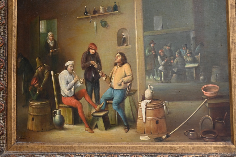 Two Dutch Paintings, interior Dutch scene of men smoking pipes, oil on board, signed lower left illegibly, 12″ x 16″; Dutch landscape with castle and figures, signed illegibly, 13.5″ x 17″.