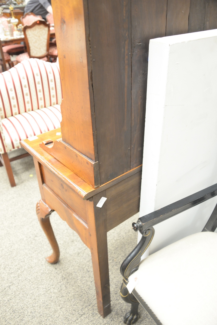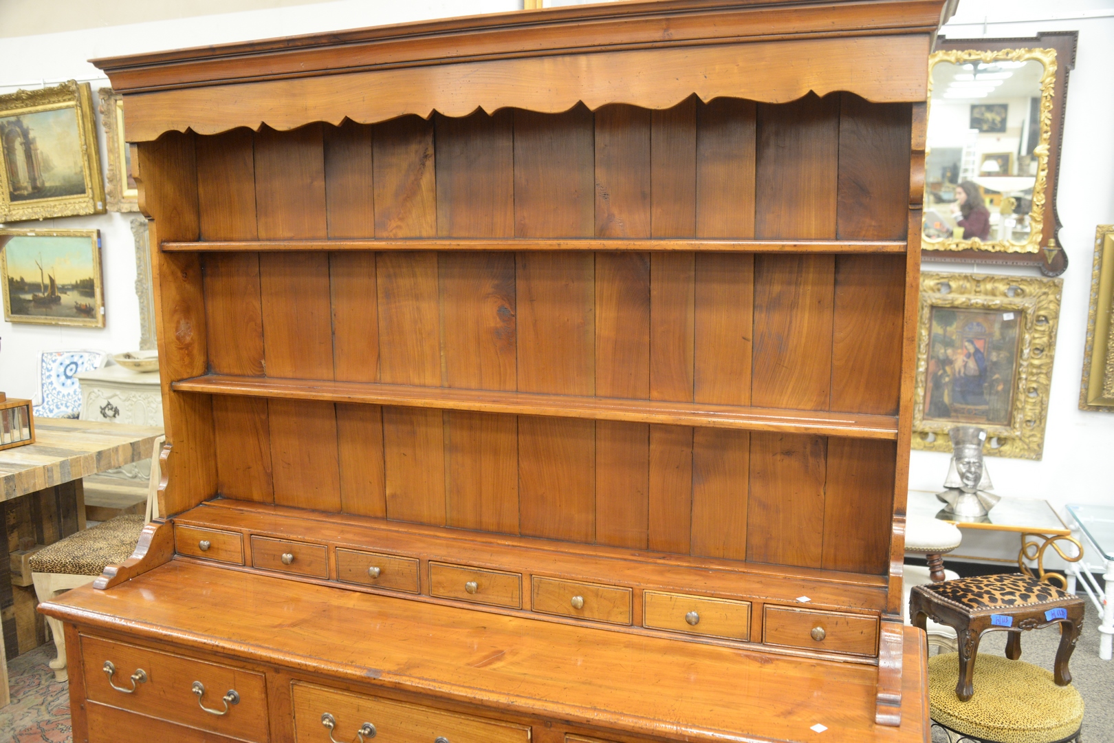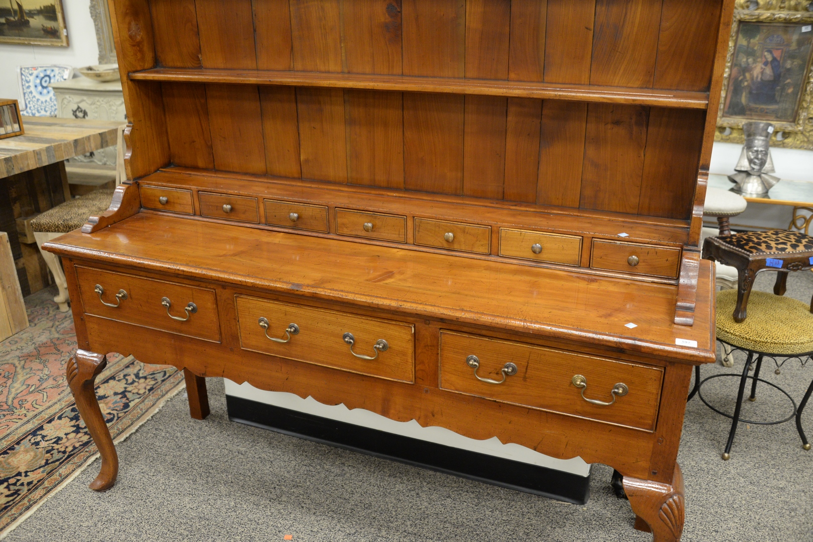 Lot 592: Two Part Welch Cupboard having open shelving over seven drawers sitting on base of three drawers and shell carved legs, height 75 in…