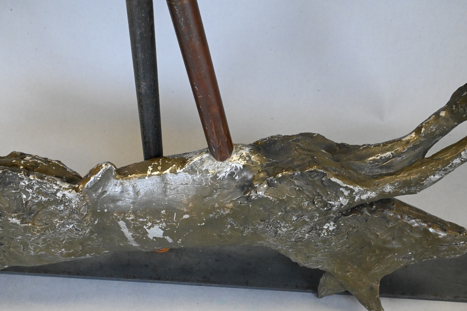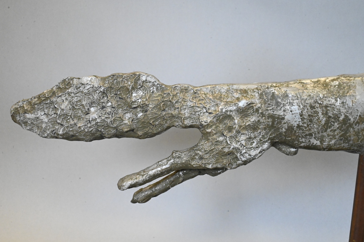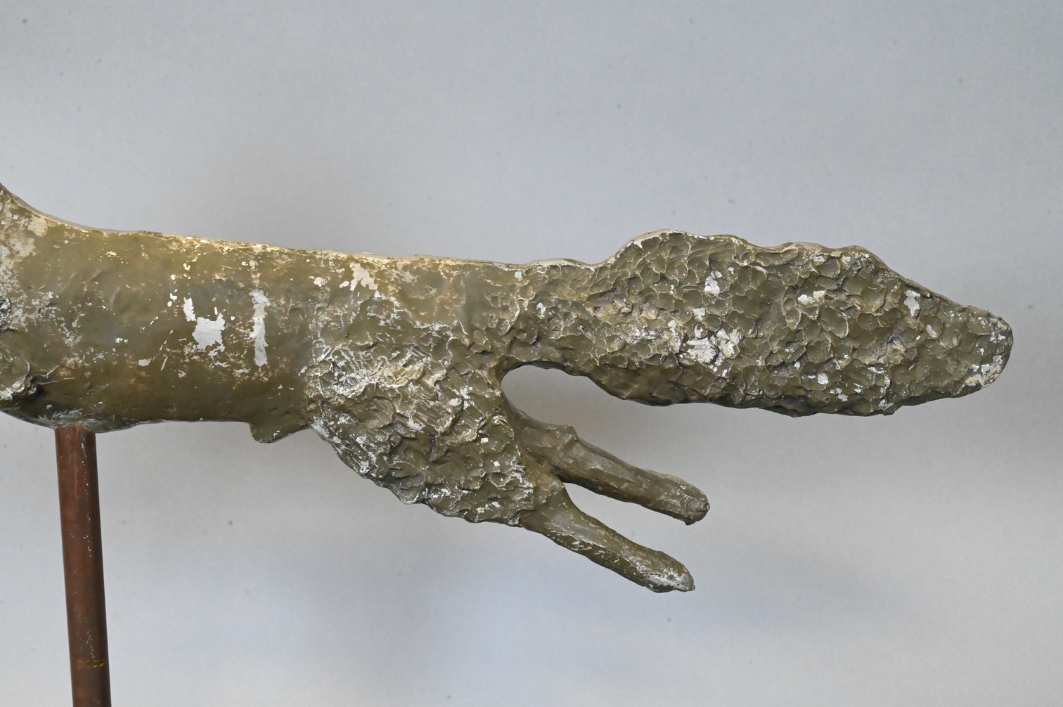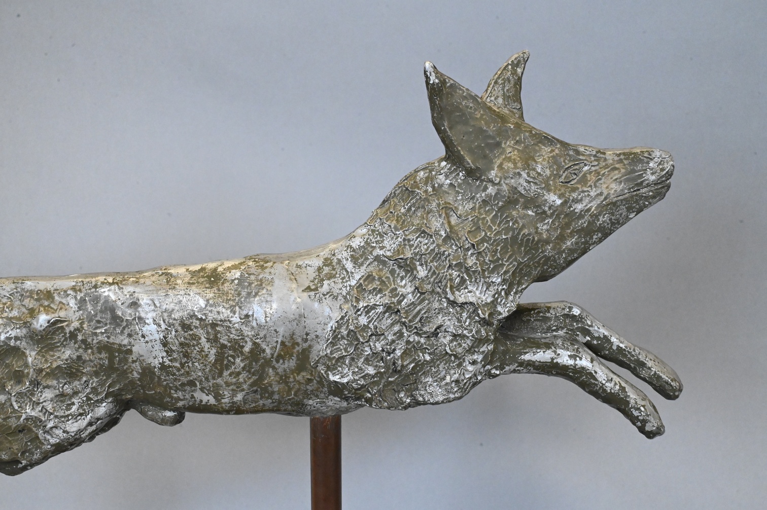 A leaping fox weathervane, cast body with detailed fur modeling, mounted on a later museum stand. Patinated surface with traces of old weathering, originally designed for rooftop display.