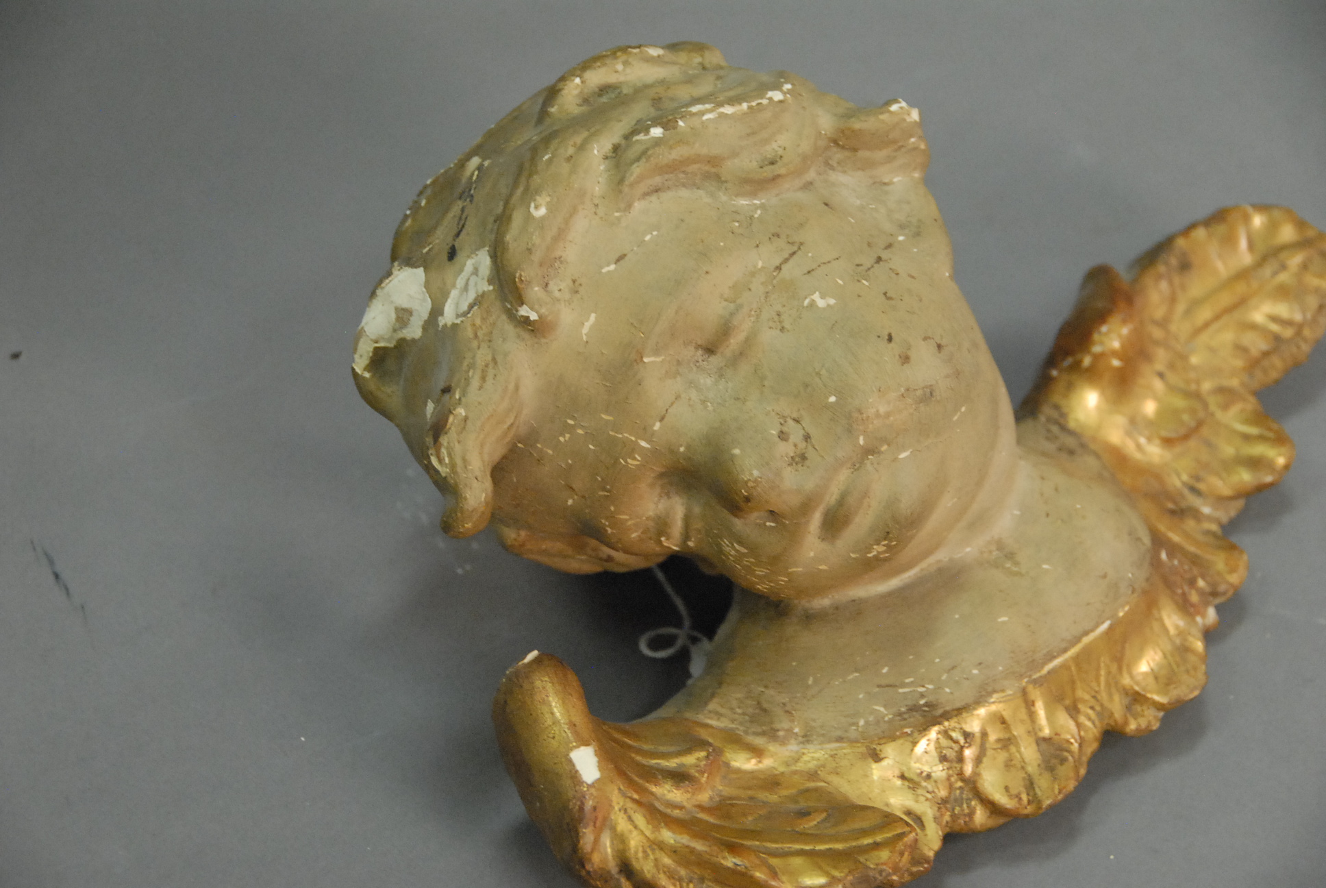 Carved wood putti head with shoulder feathers, early to mid-19th century. ht. 8 1/2in.