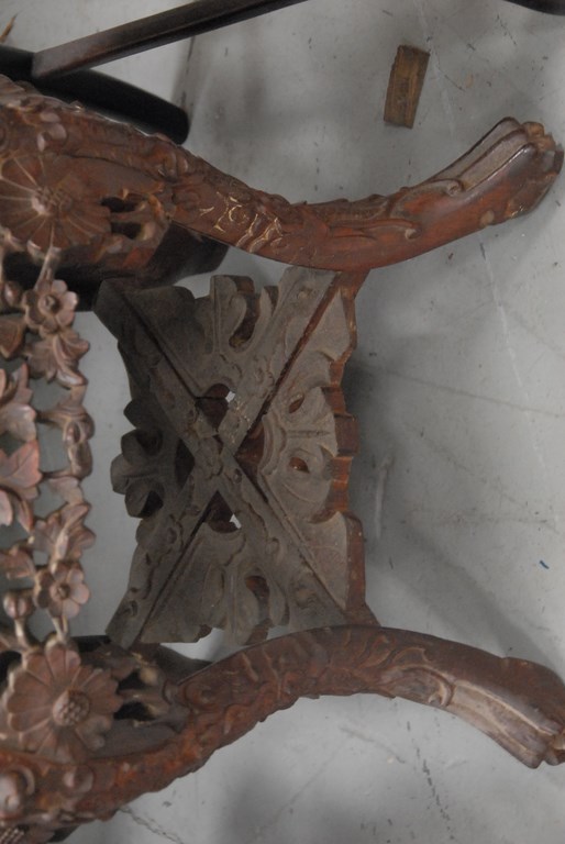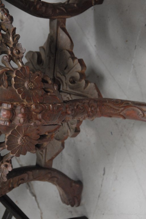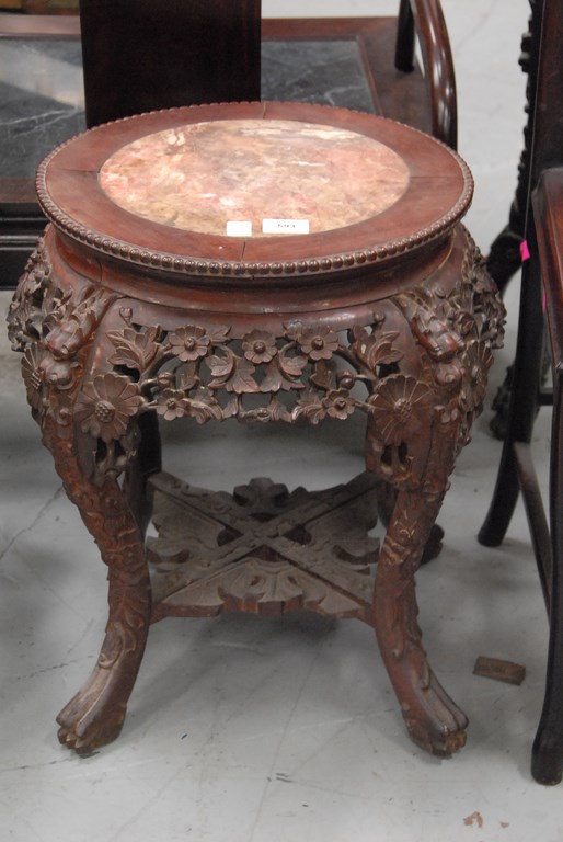 Chinese carved teakwood low stand with round inset marble. ht. 19in. dia. 15in.