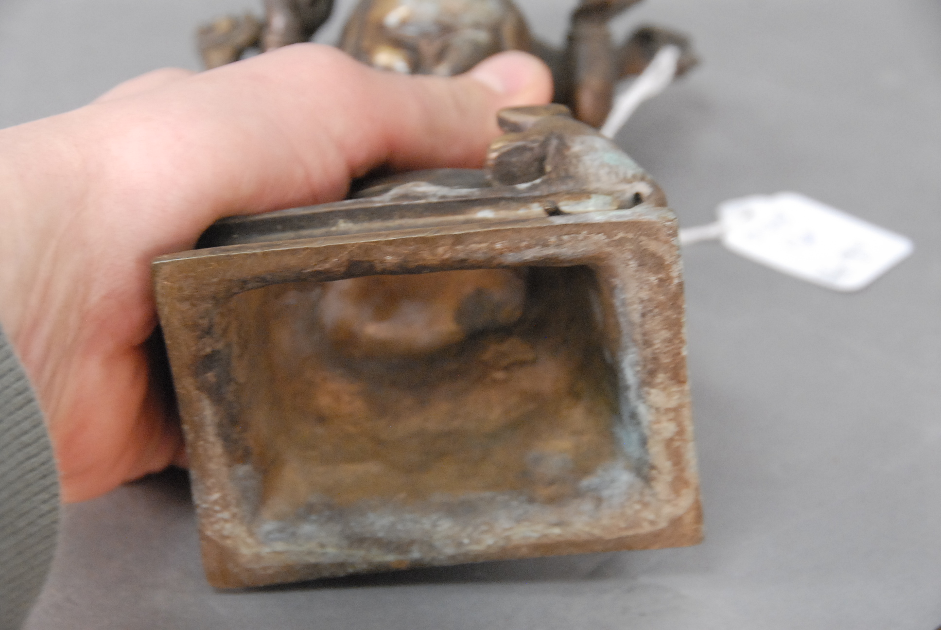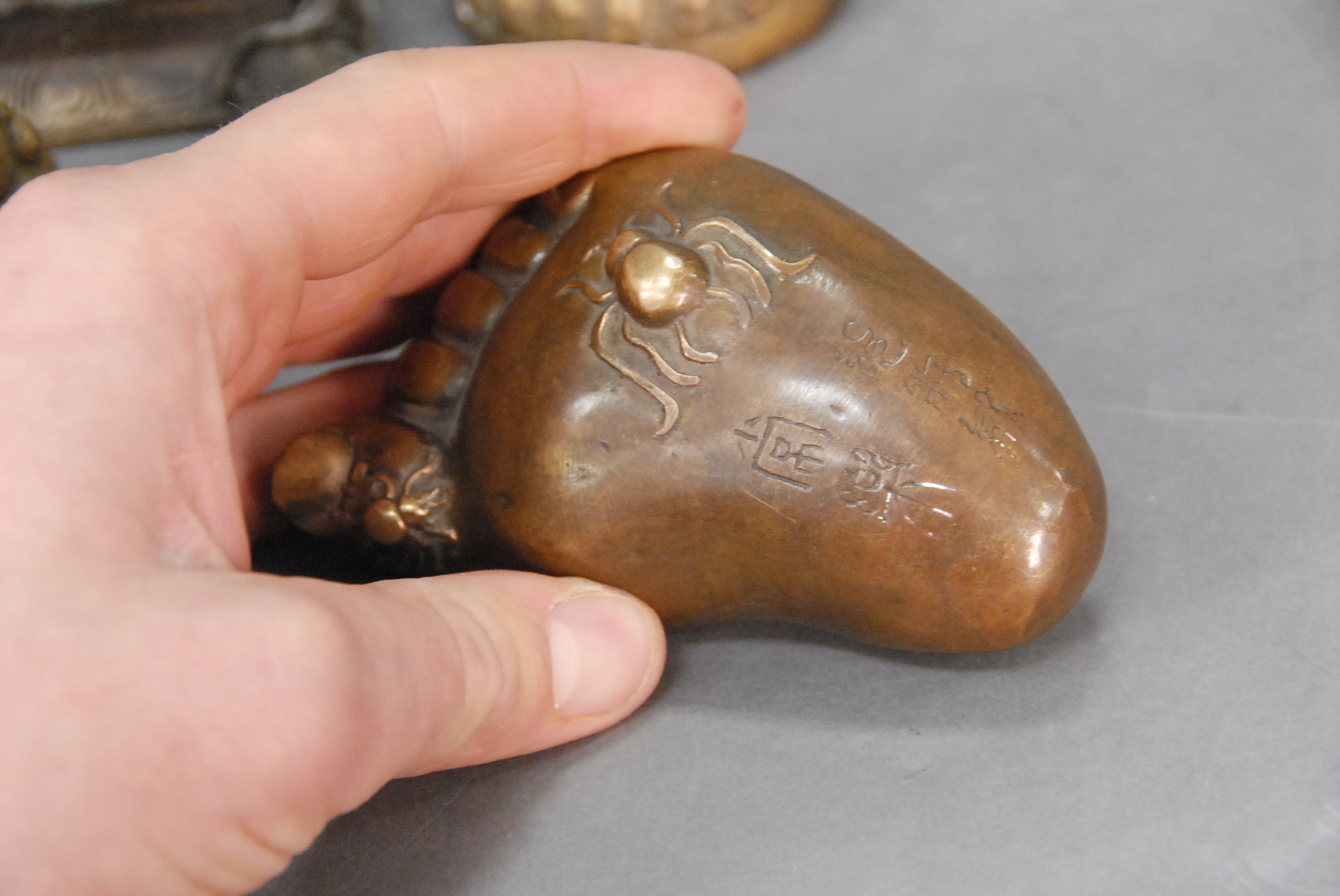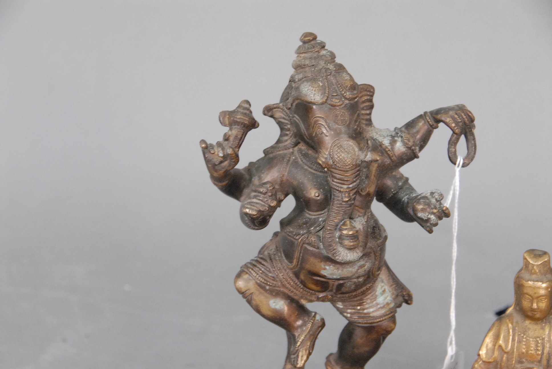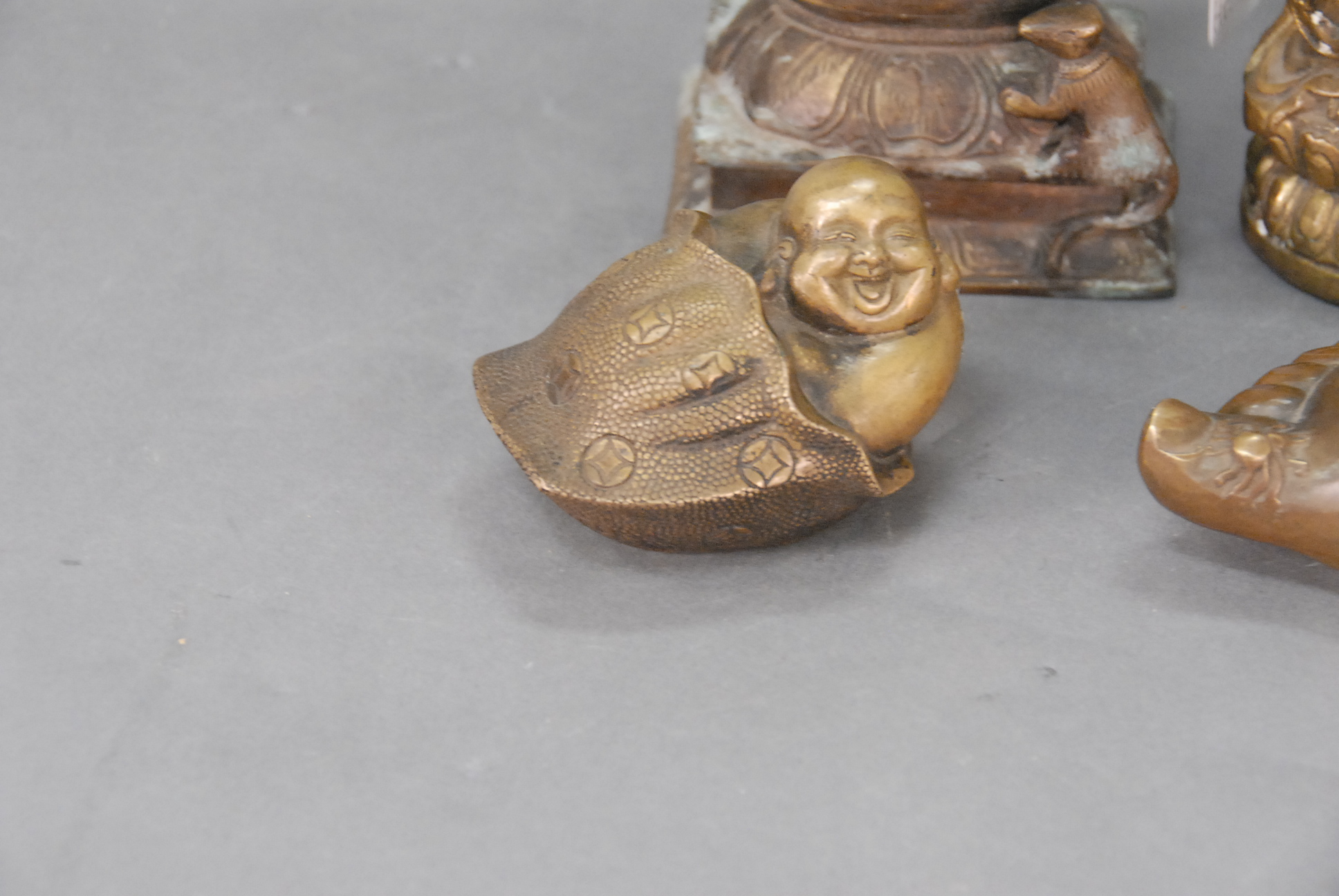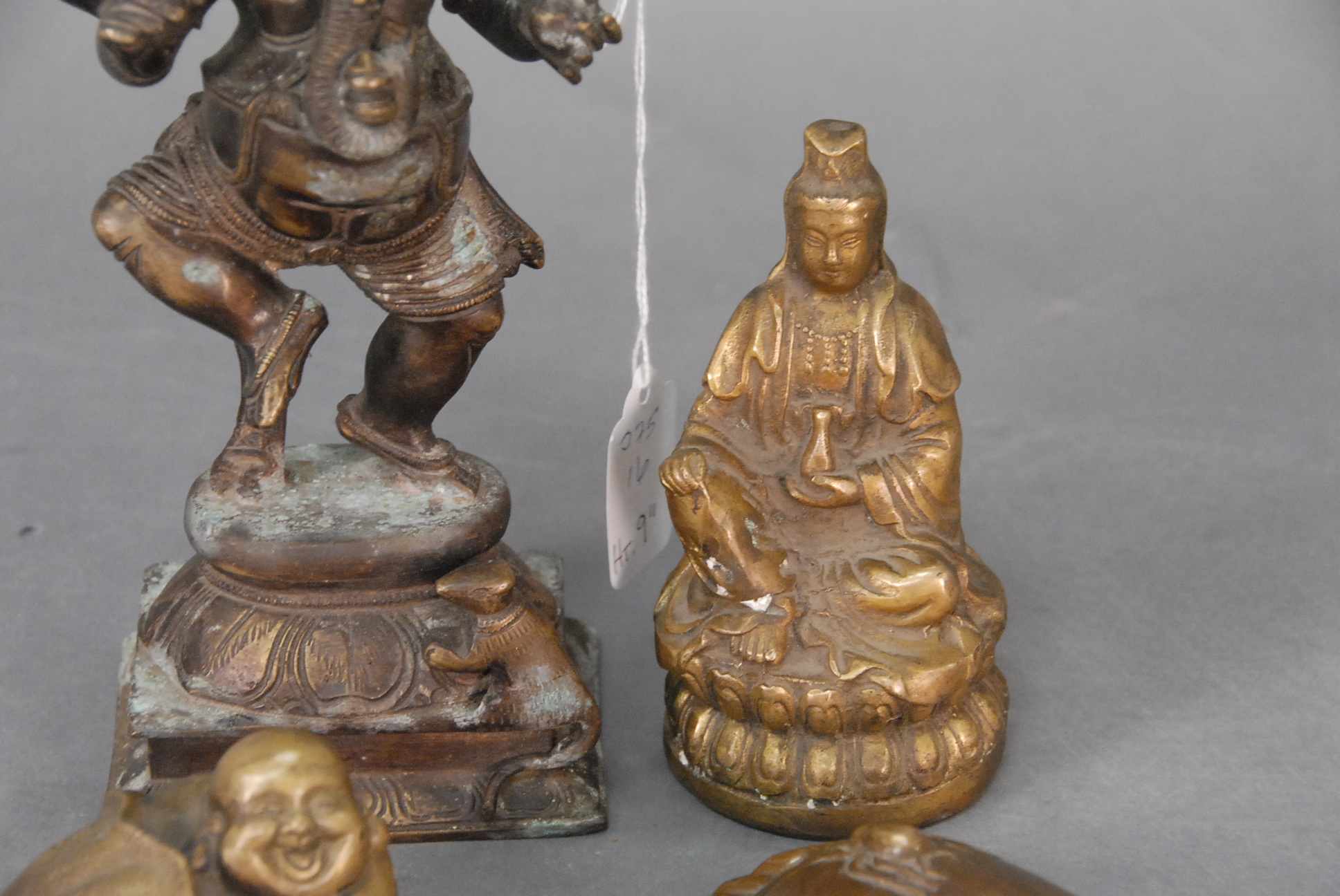 Four piece lot to include a Chinese metal figurine of a seated Quan Yin with a spurious Ming seal, bronze of the diety Ganesh dancing on a lotus blossom stand with Hanaman at his feet, 19th century – -20th century, and two Japanese bronze okimono, possibly weights, one in the shape of a foot with spiders and signed, the other with Hotei emerging from a bag, 19th century – 20th century.