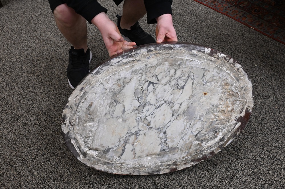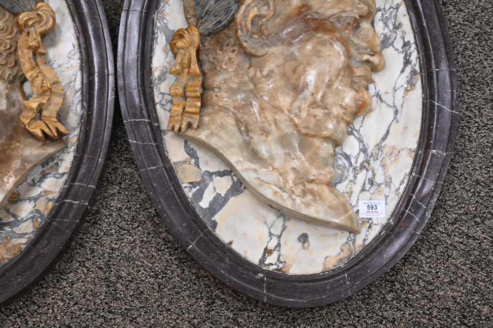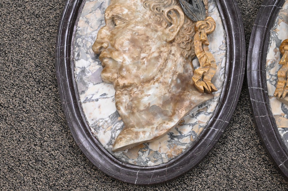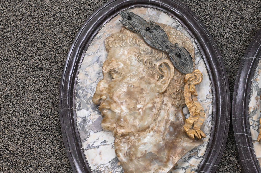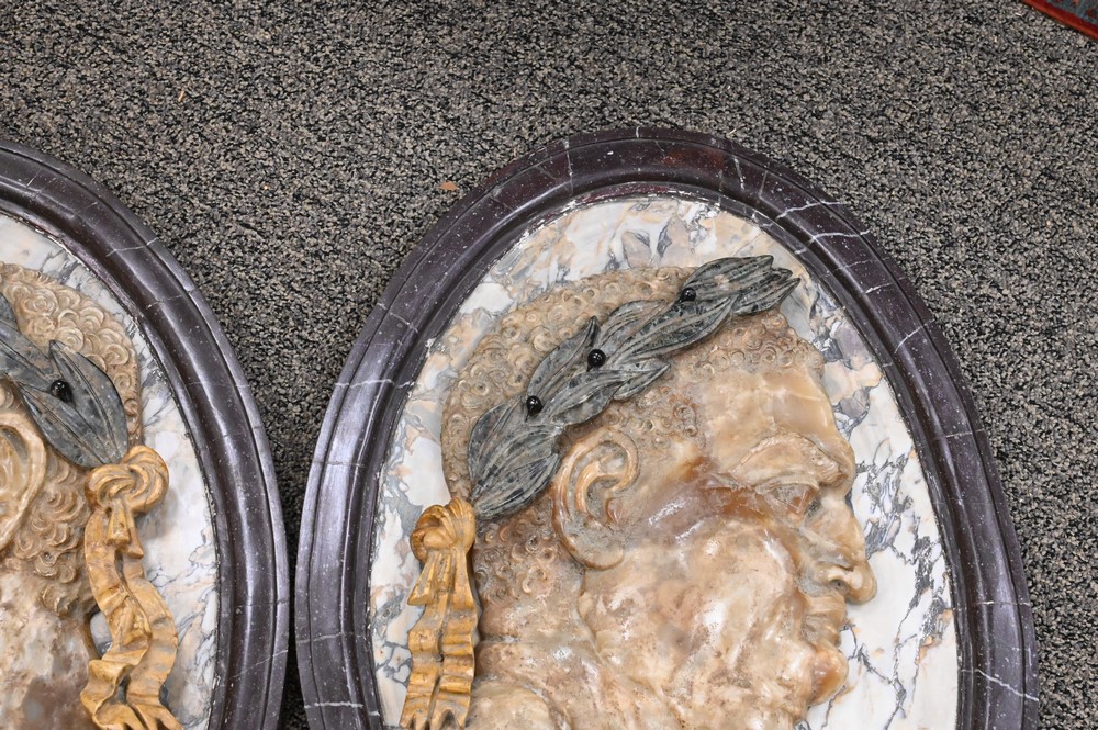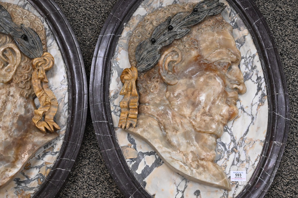 Lot 593: Pair of Large Italian Rouge Marble Portrait Plaques, having molded frames with rouge marble profile portraits and marble backgrounds, 28 1/2″ x 20″.