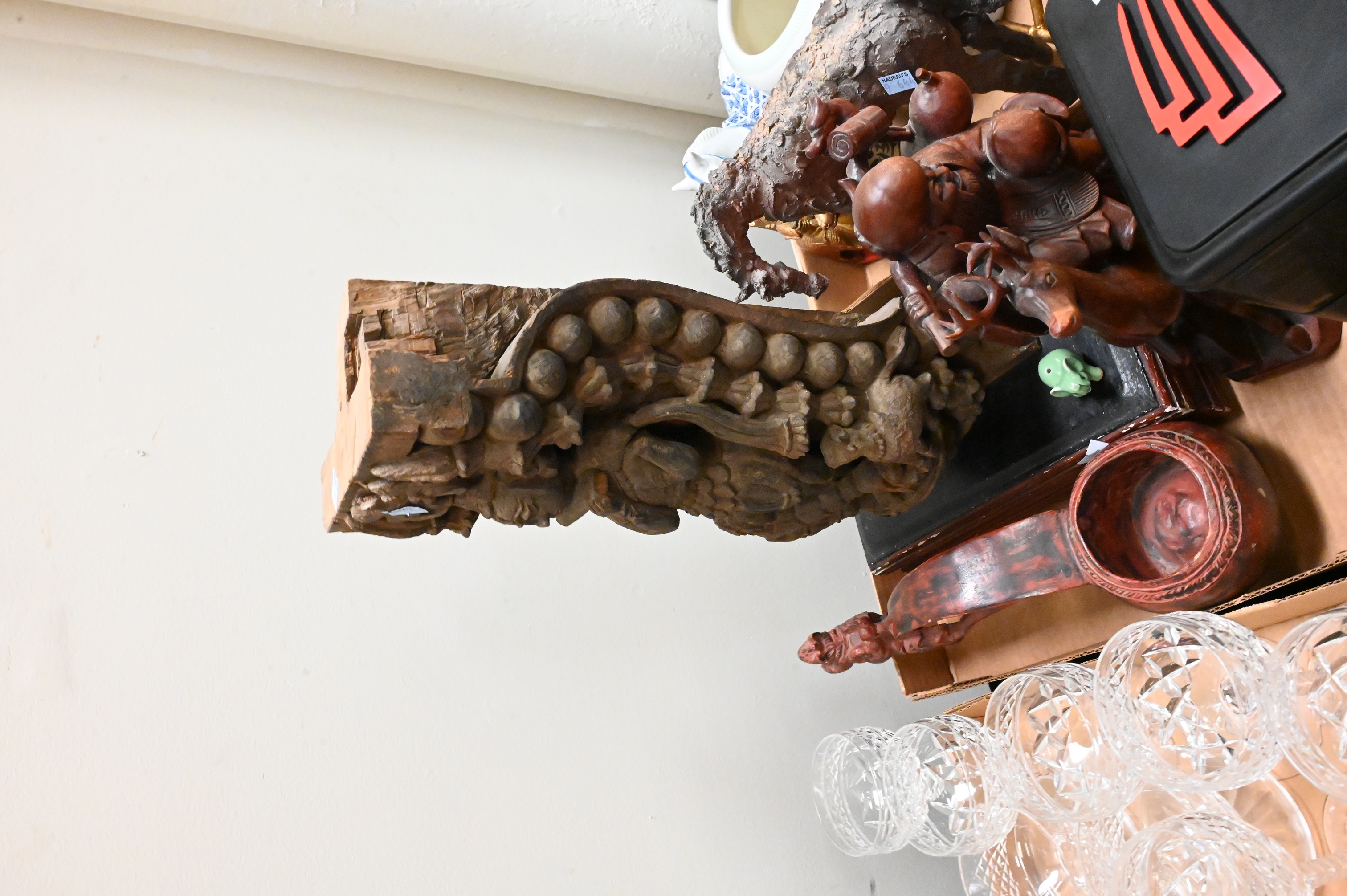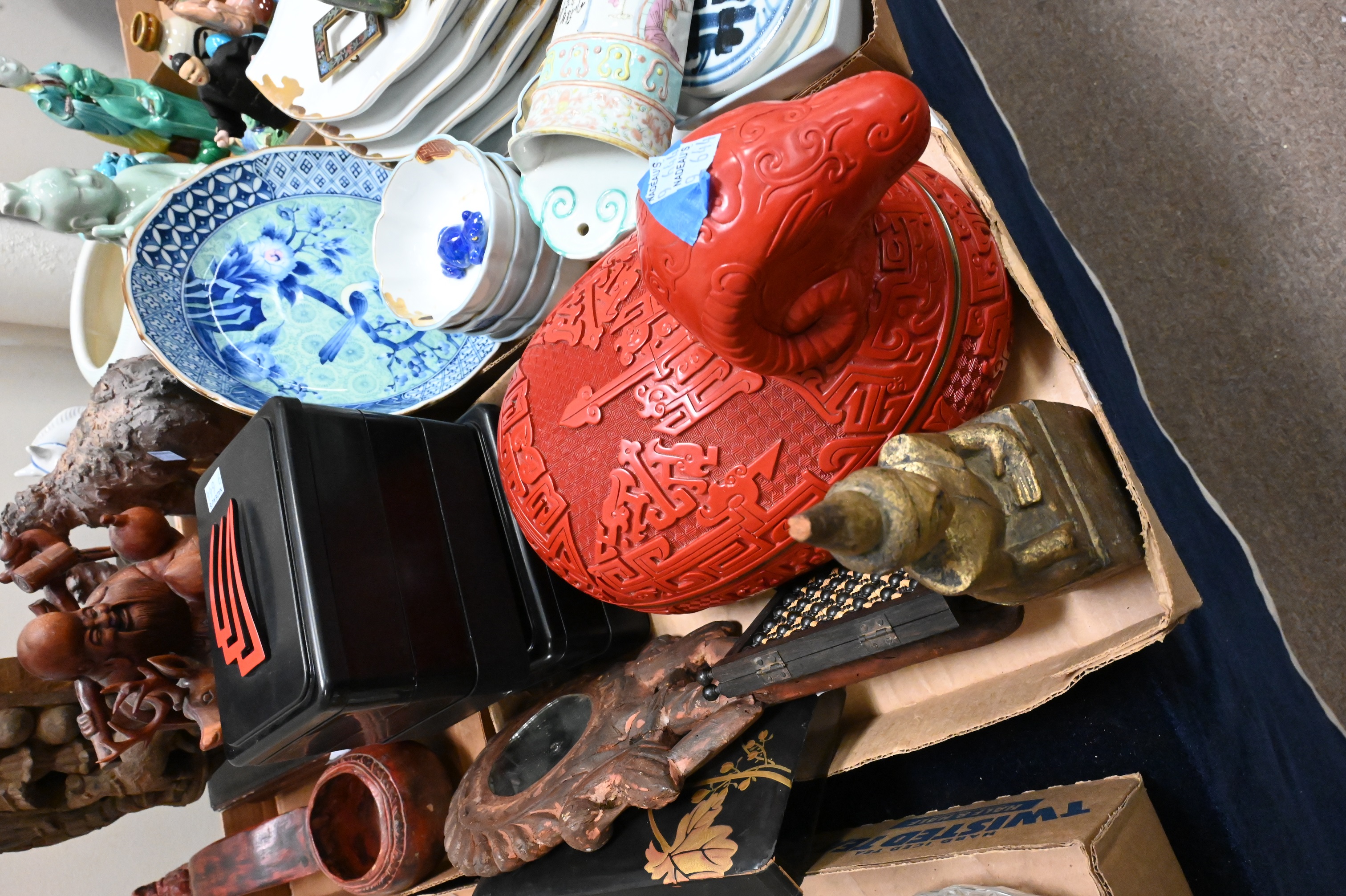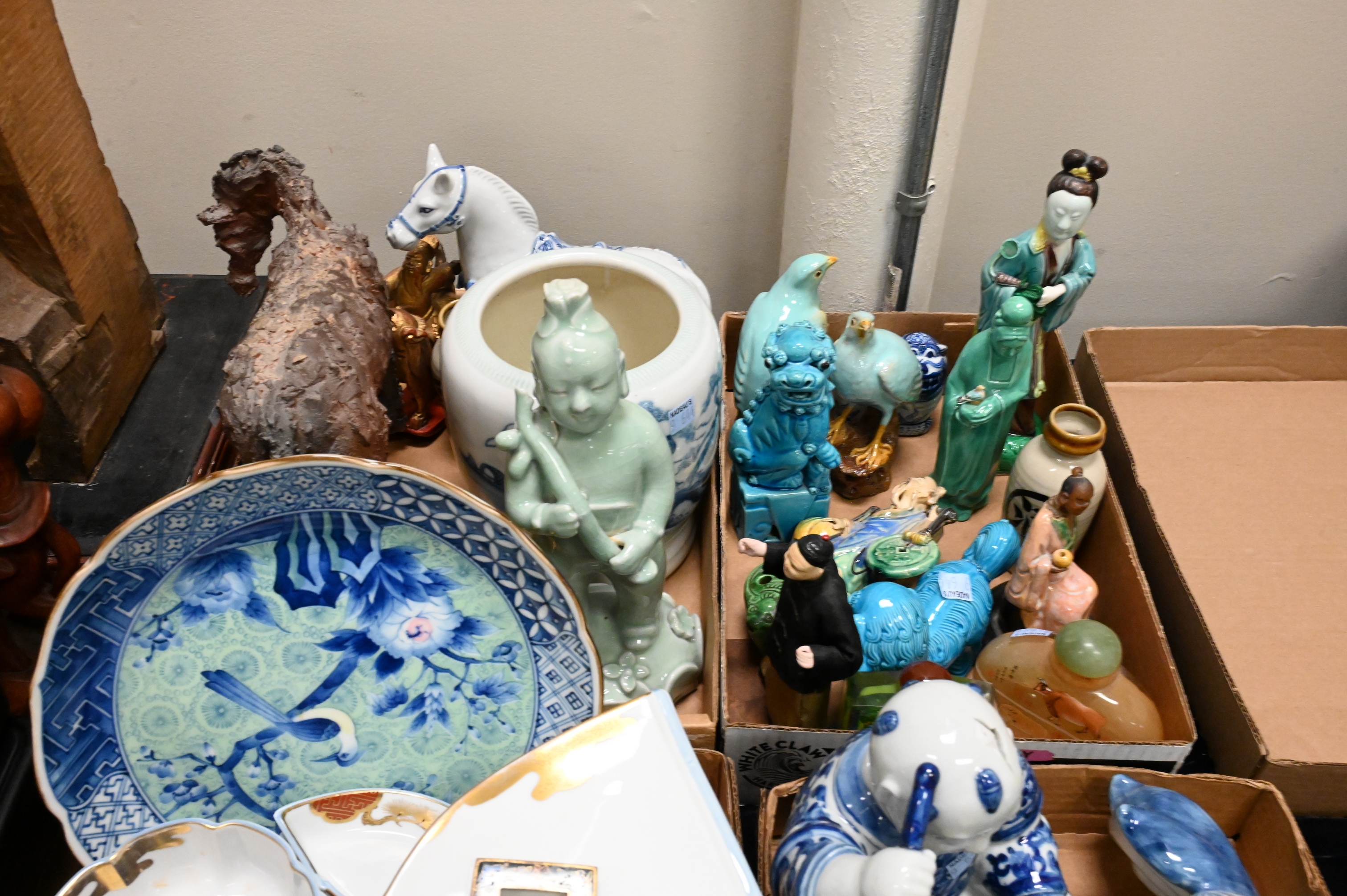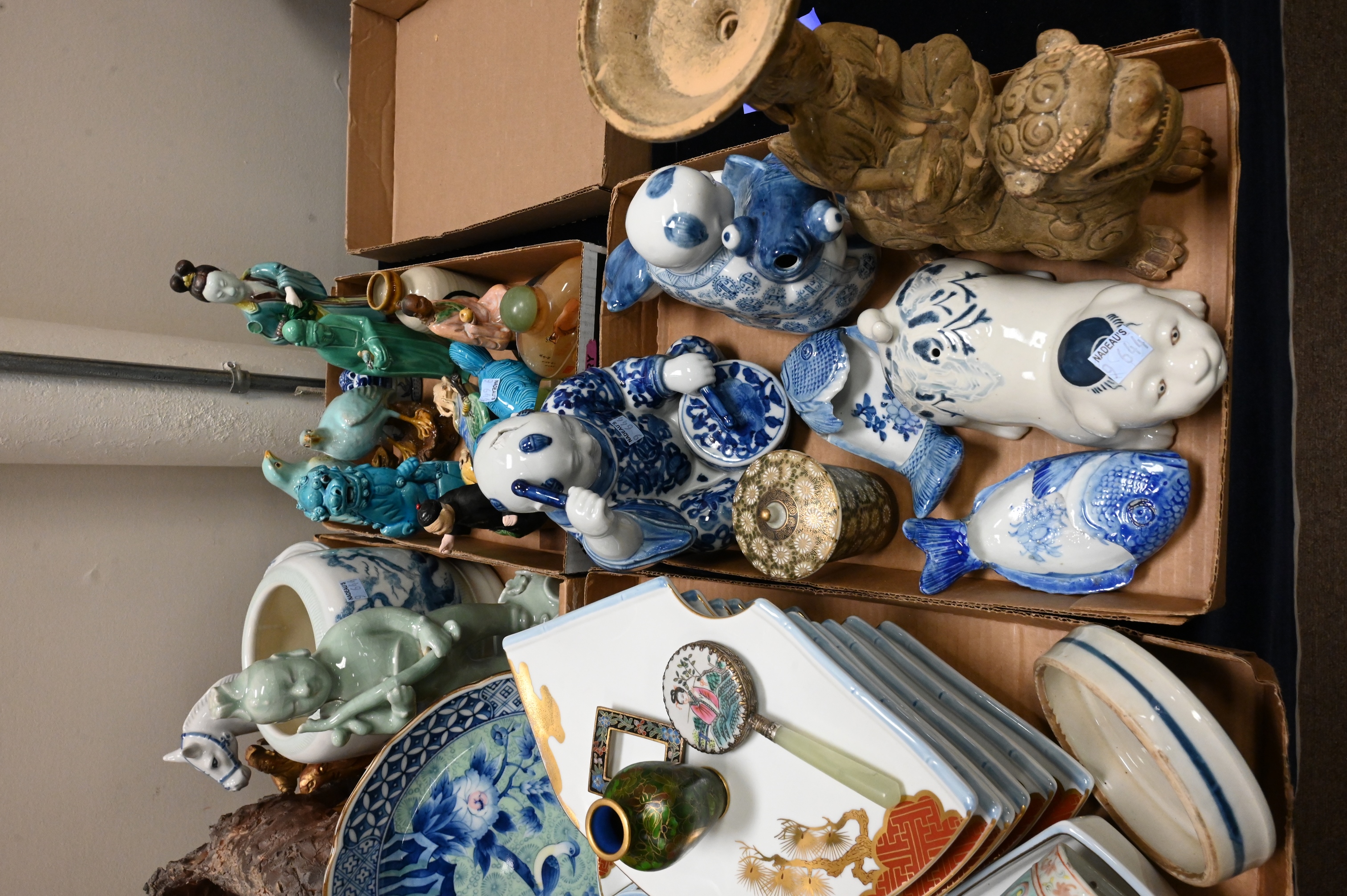 to include turquoise foo dogs and pigeons, Guanyin, blue and white buddhas, fish dishes, reverse painted snuff bottles, celadon figure, Thai carved temple fragments, small hardstone handled mirror with geisha, red lacquer covered ram box, Japanese gilt plates etc…