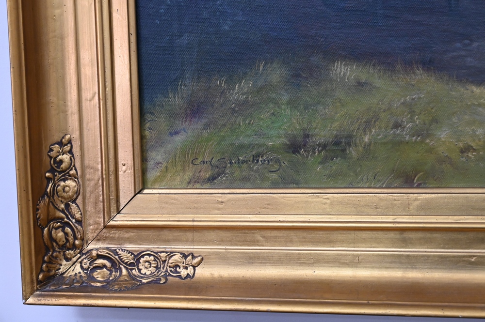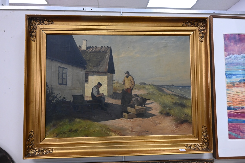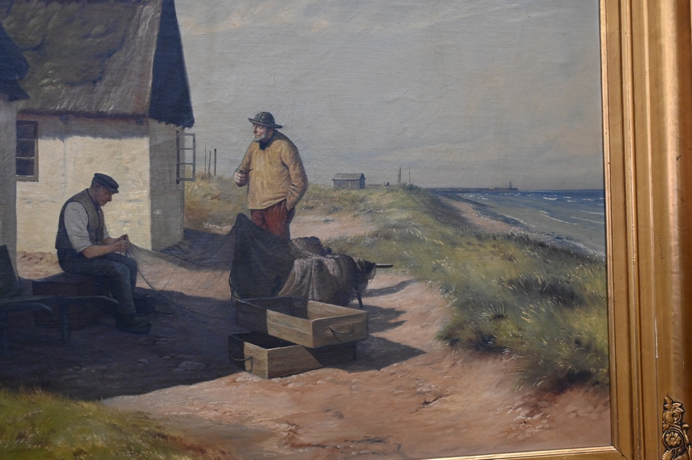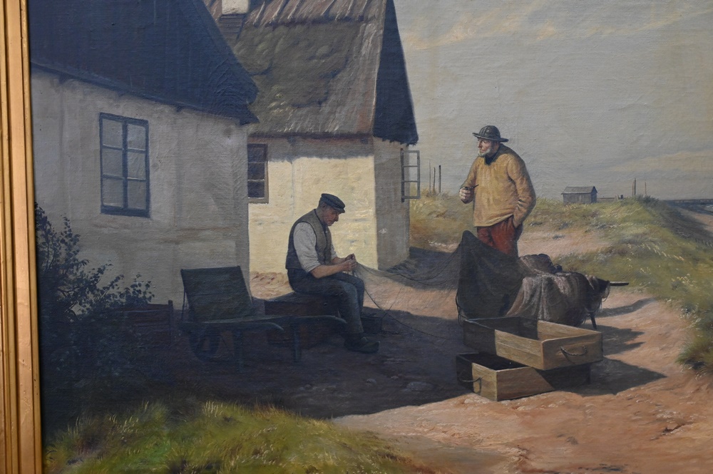 Lot 594: Carl-Soderberg, Also Known As Niels Walseth (1914-2001), Danish landscape sewing a fishing net, oil on canvas, signed lower left Carl Soderberg, 27″ x 37″.