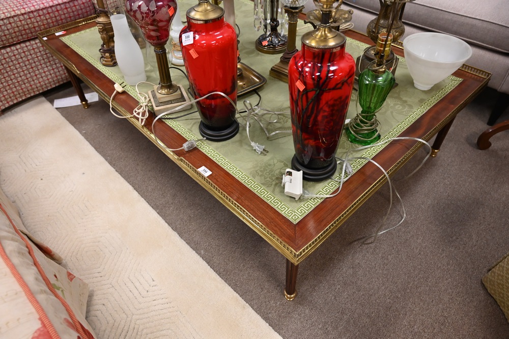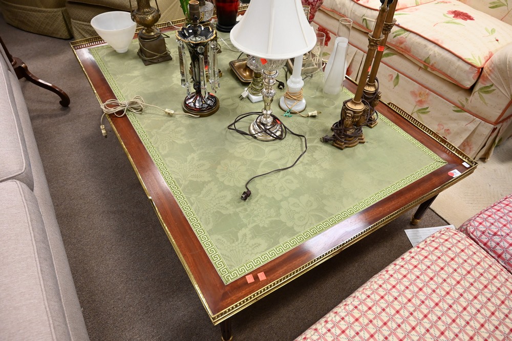 Lot 594: Louis XVI Style Mahogany Coffee Table, having cloth center and brass gallery with brass trimmed legs, height 15 inches, top 40″ x 59 1/2″.