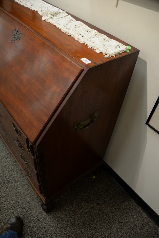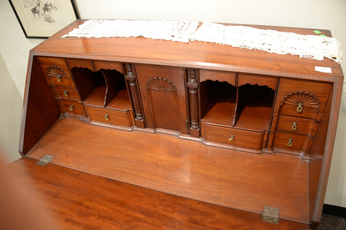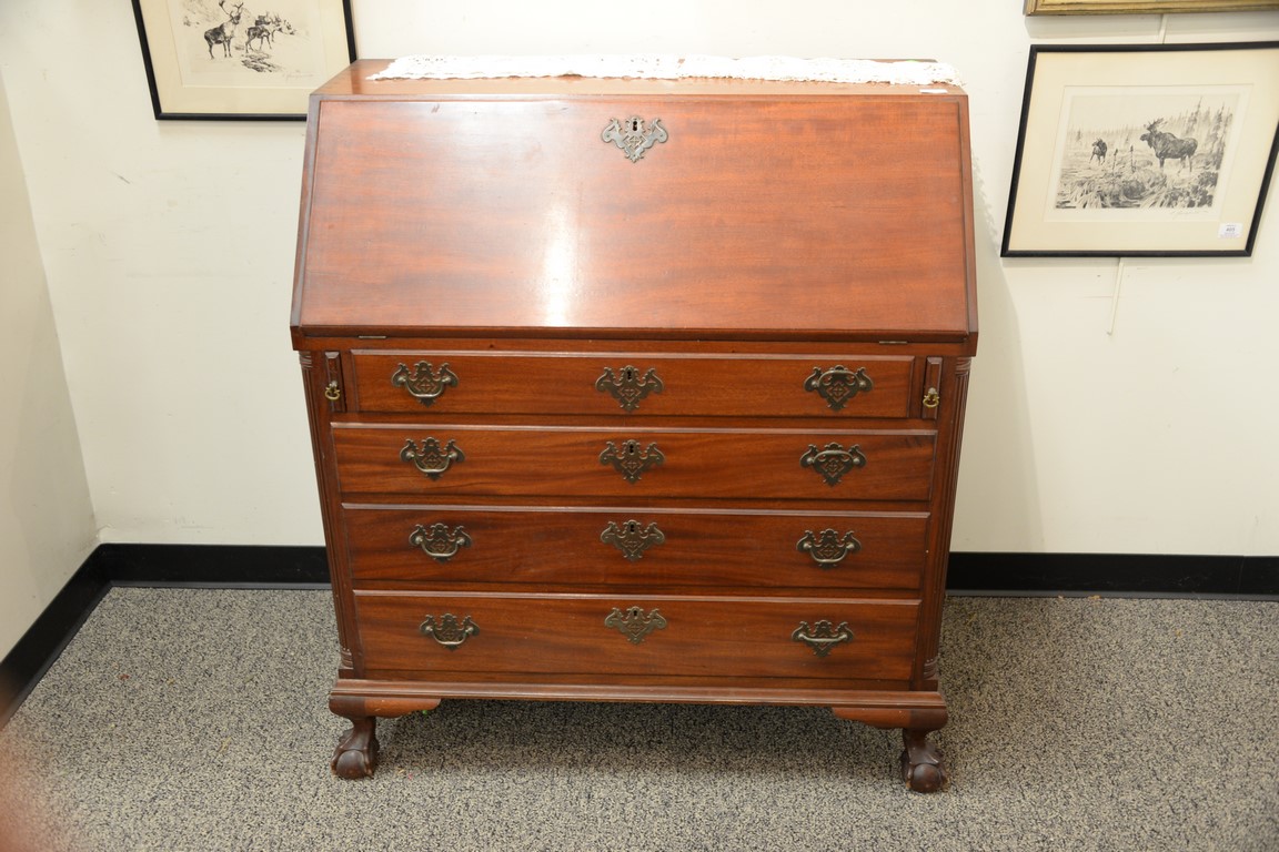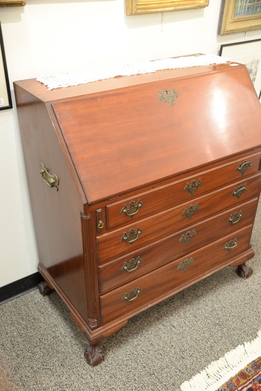 Lot 594: Margolis mahogany Chippendale style desk having slat lid over four graduated drawers flanked by fluted quarter columns, interior wit…