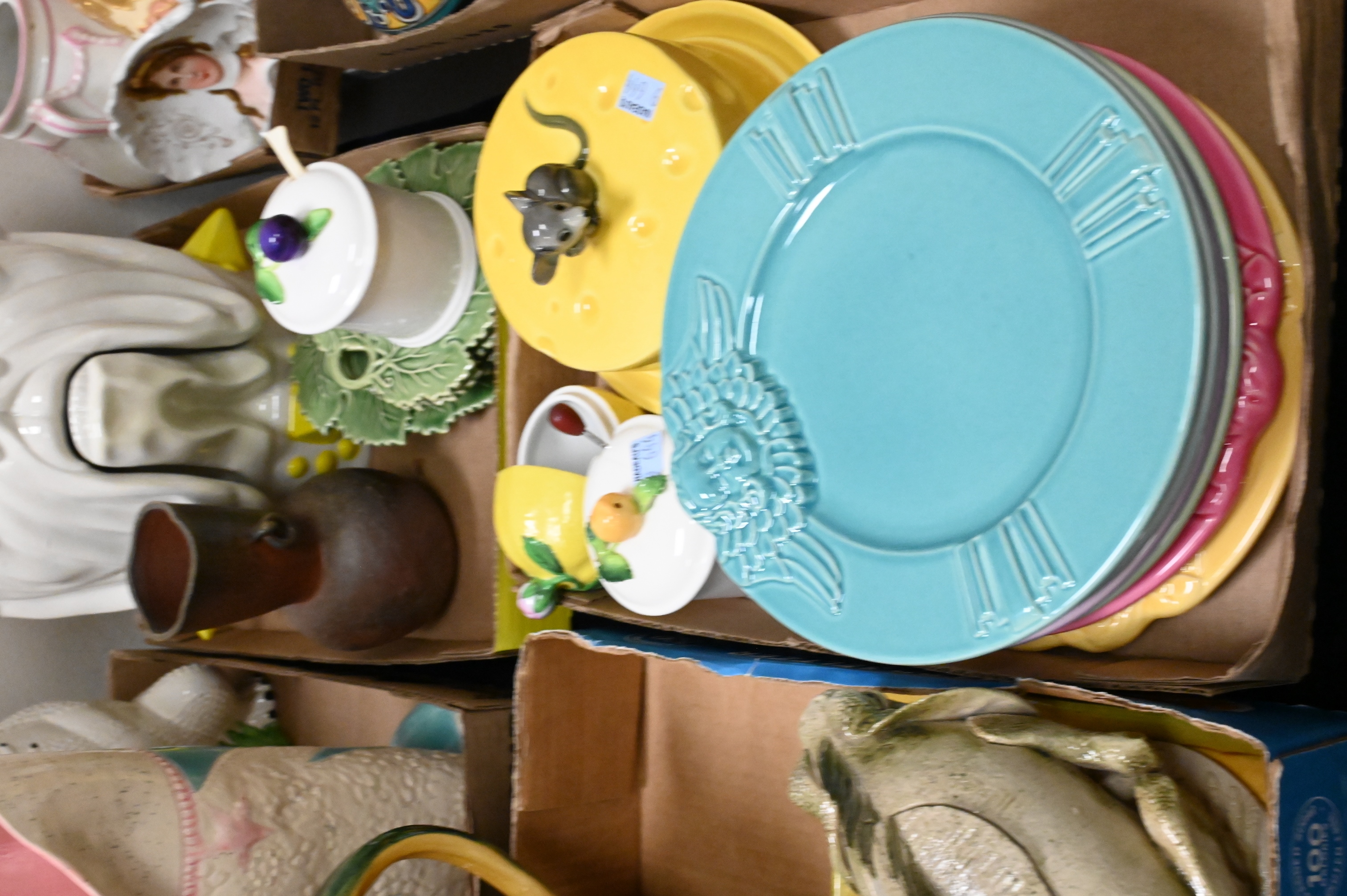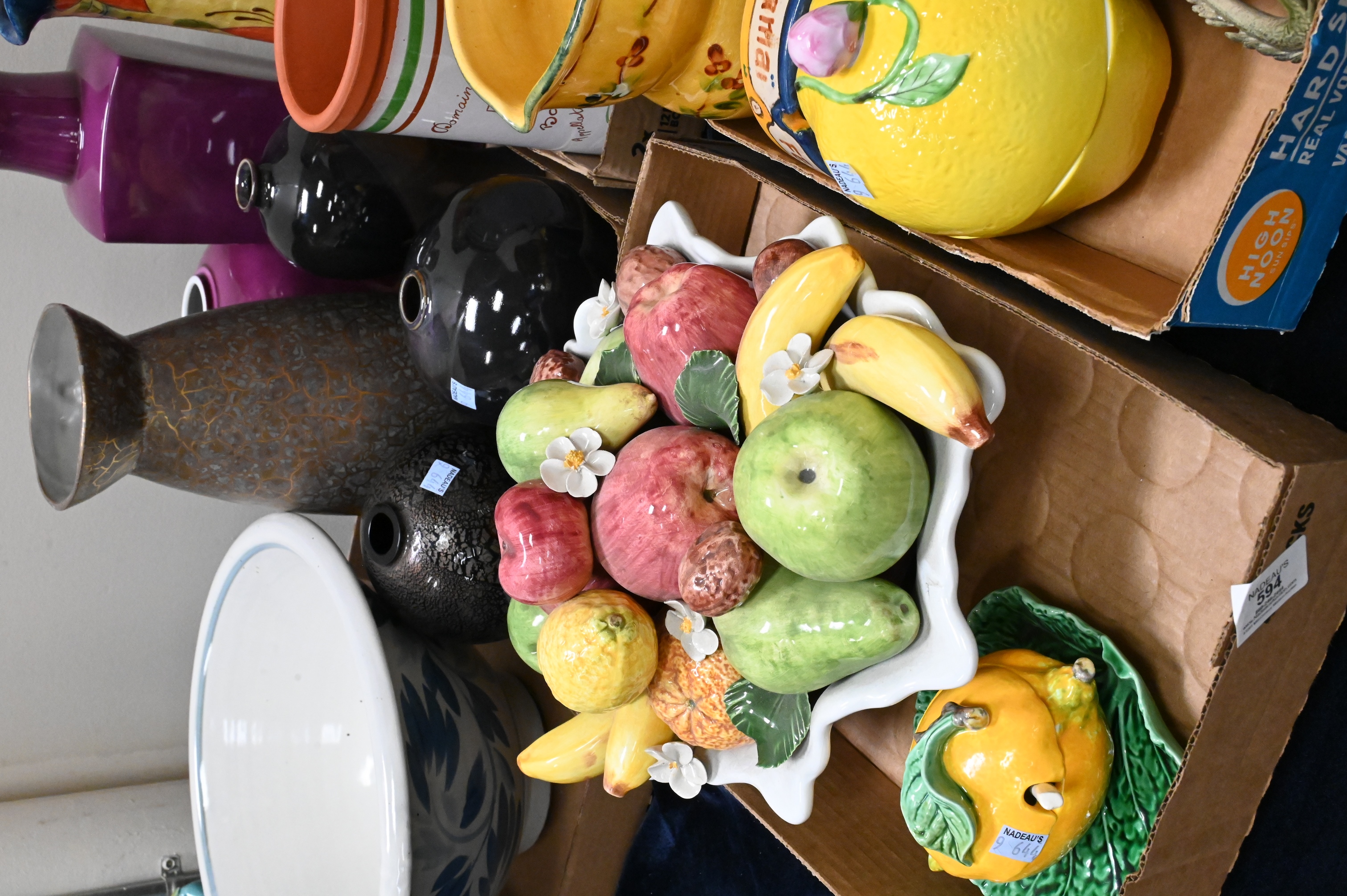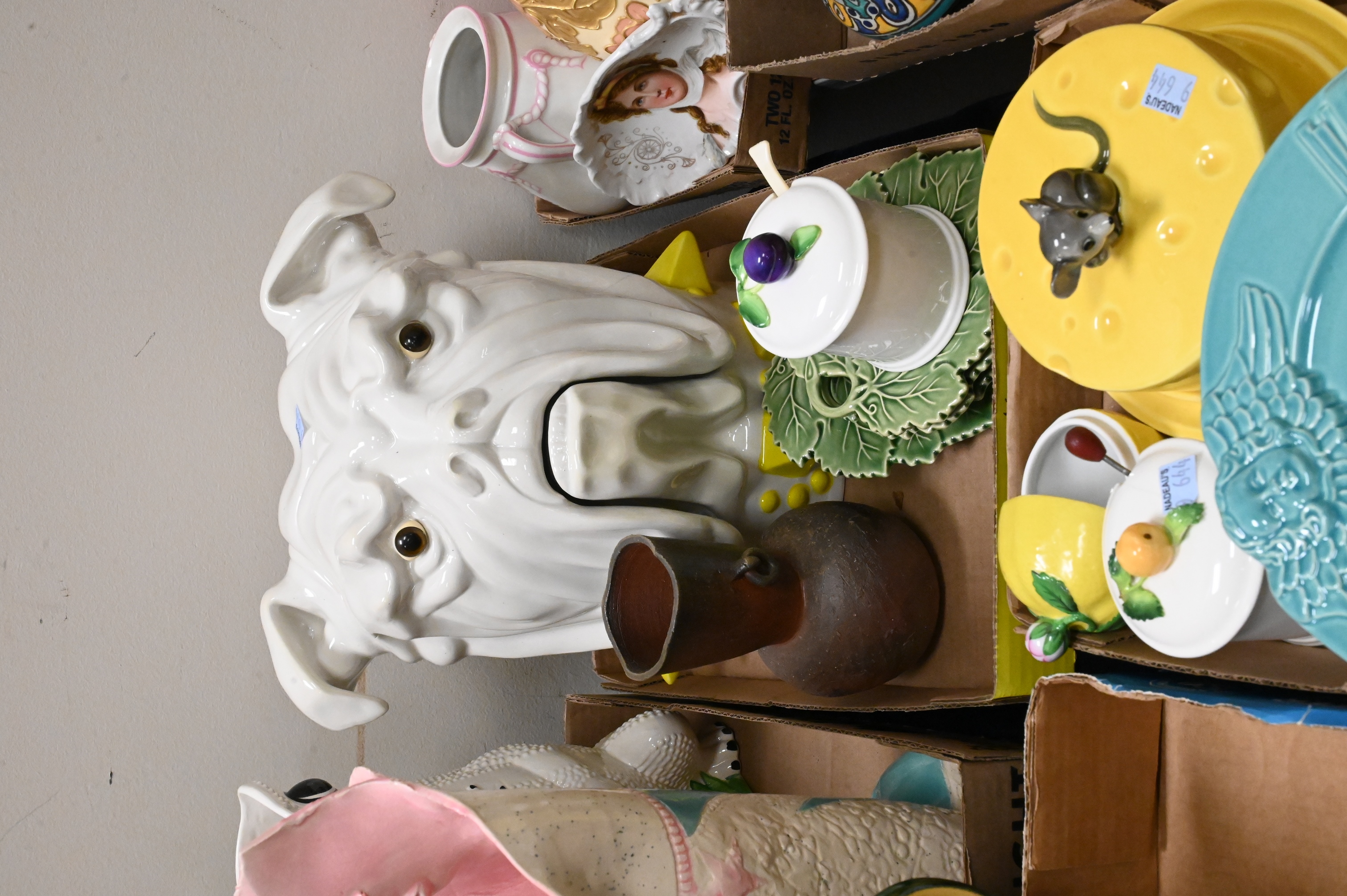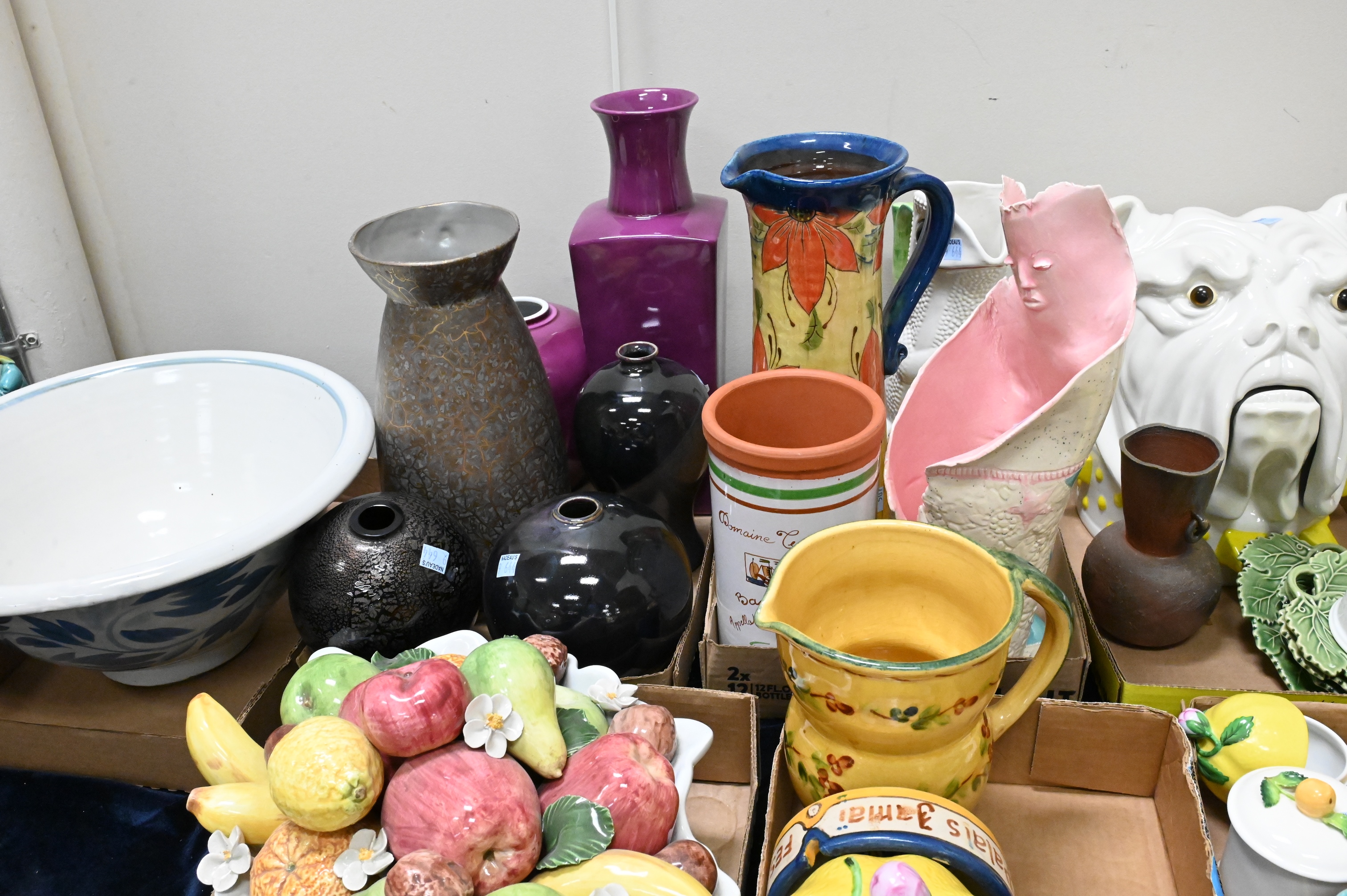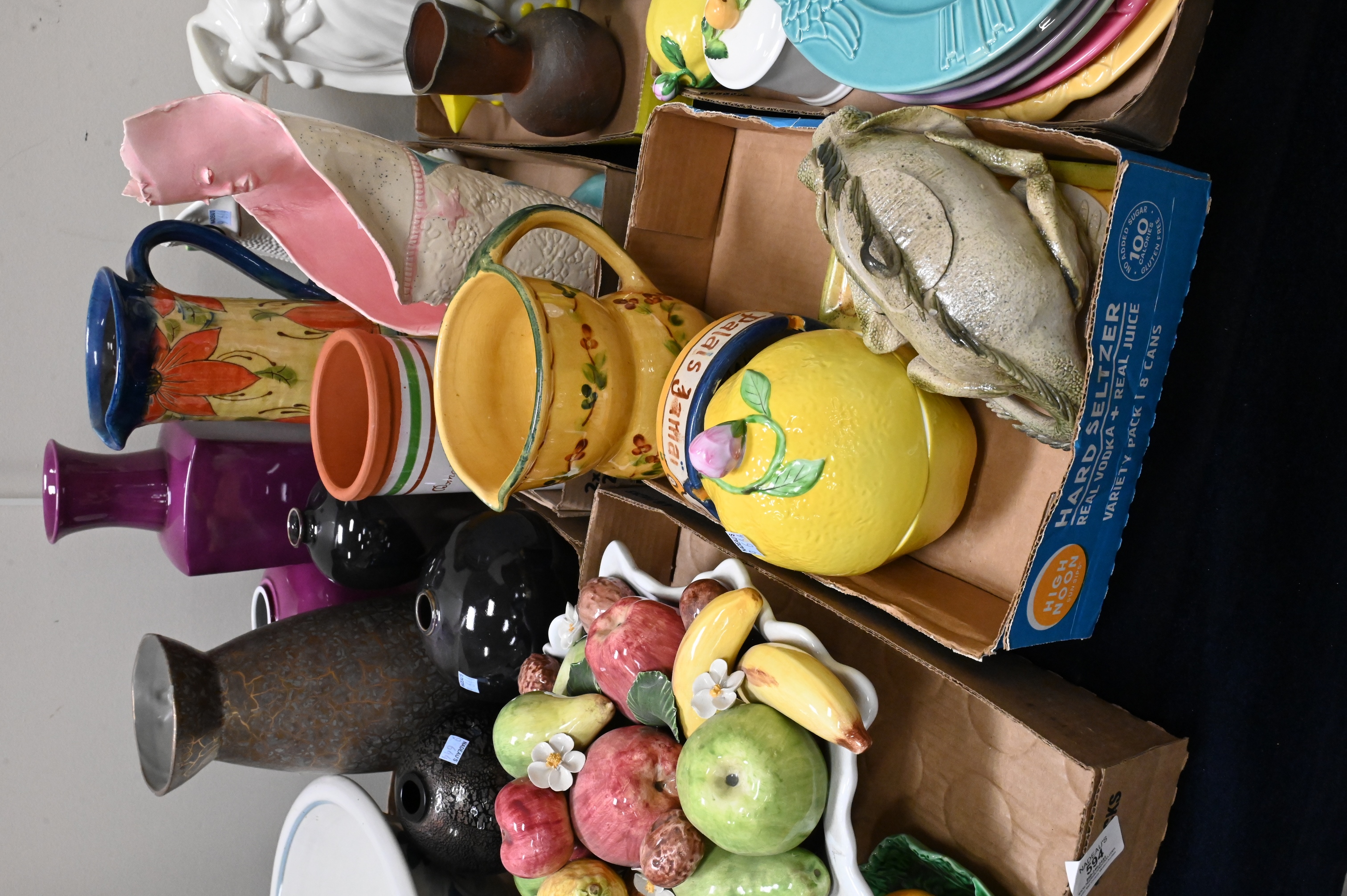 to include Majolica fruit basket, lemon sugar bowl with spoon, Mikasa vases, Mancioli bulldog, stoneware wash pitcher and basin etc…