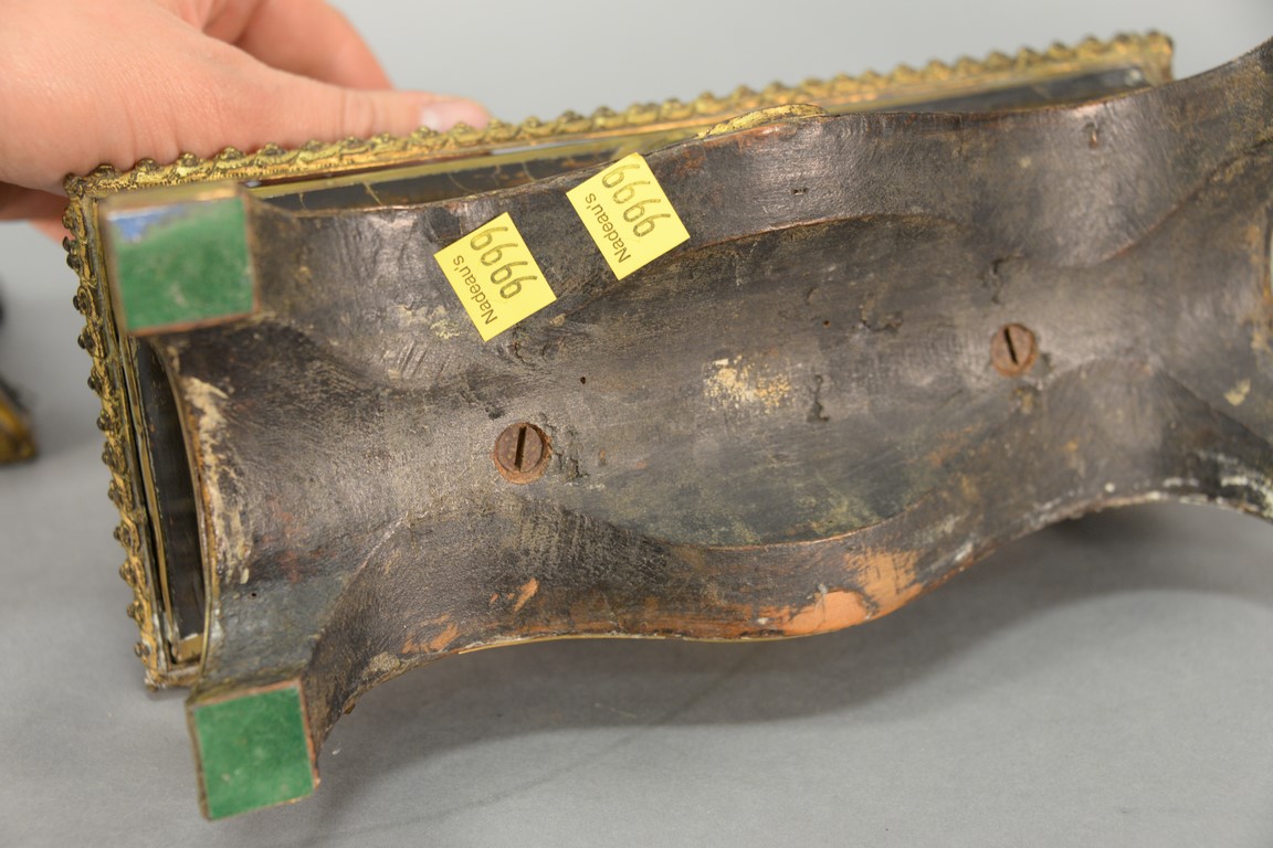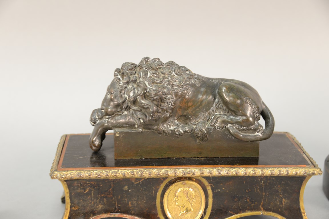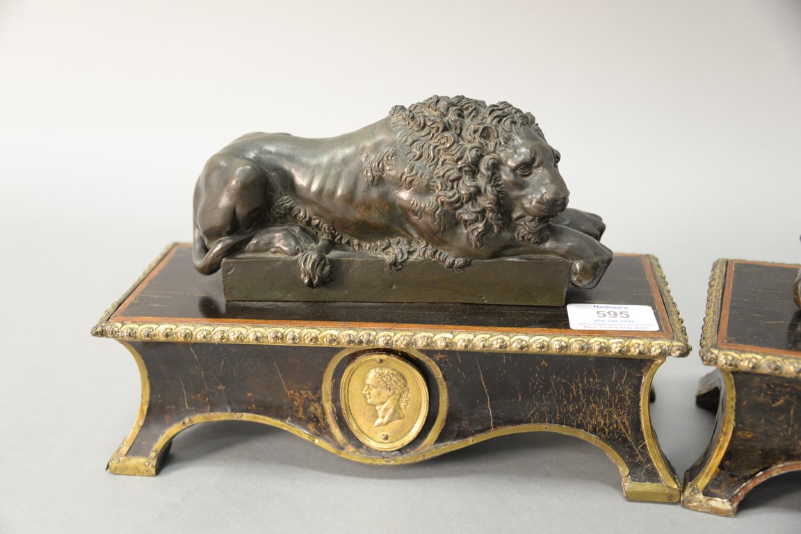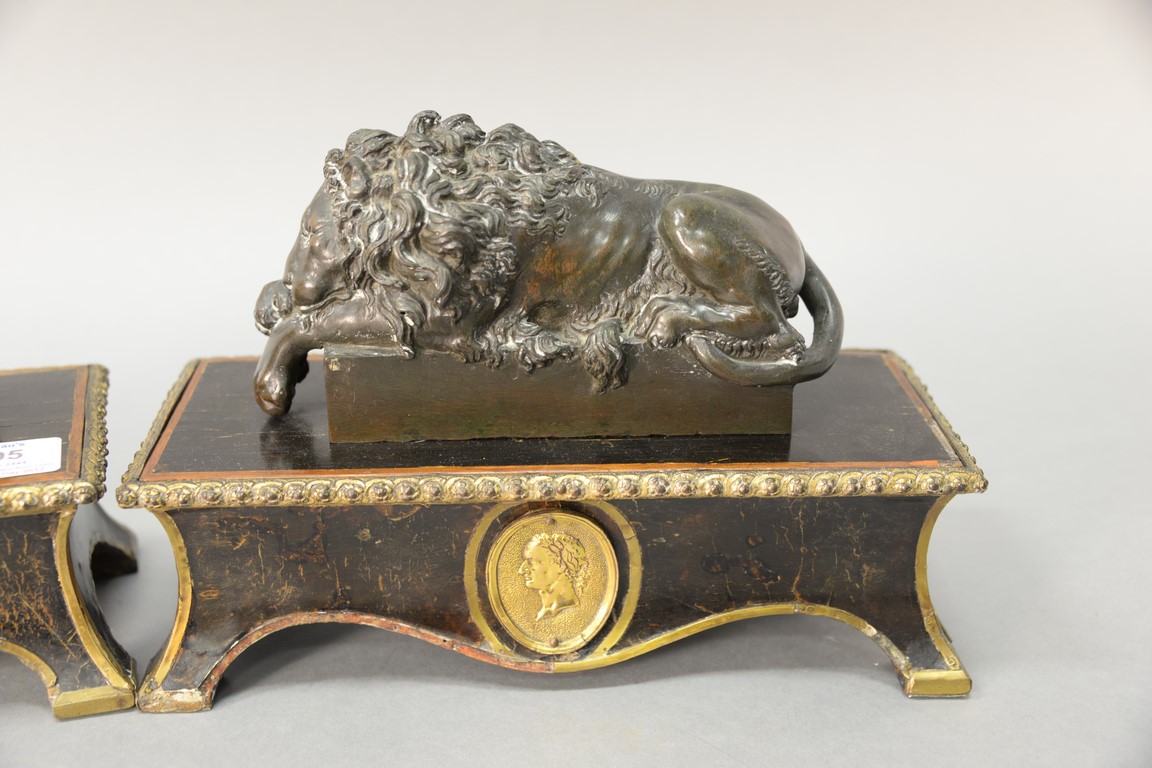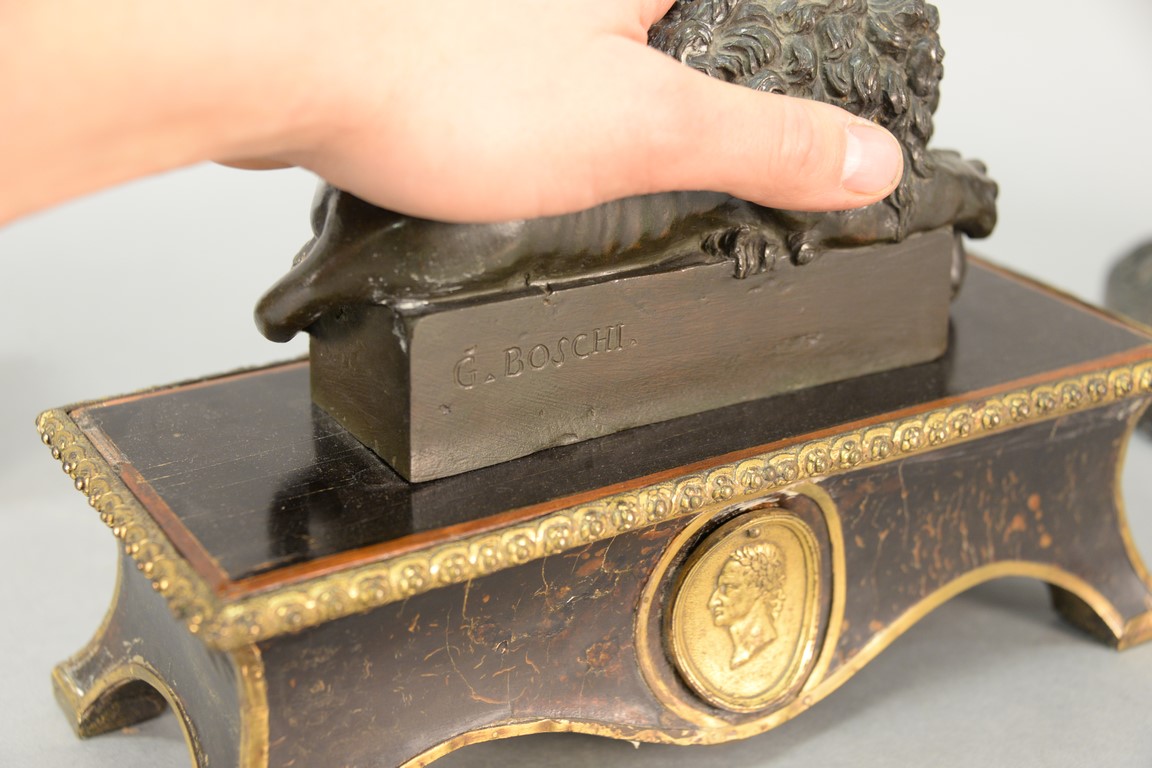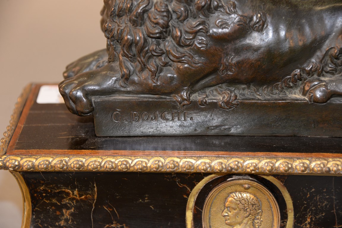 Lot 595: After Guiseppe Boschi 1760-1821 two bronzes Lion Laying on Rectangular Base marked: G. Boschi mounted on carved footed…