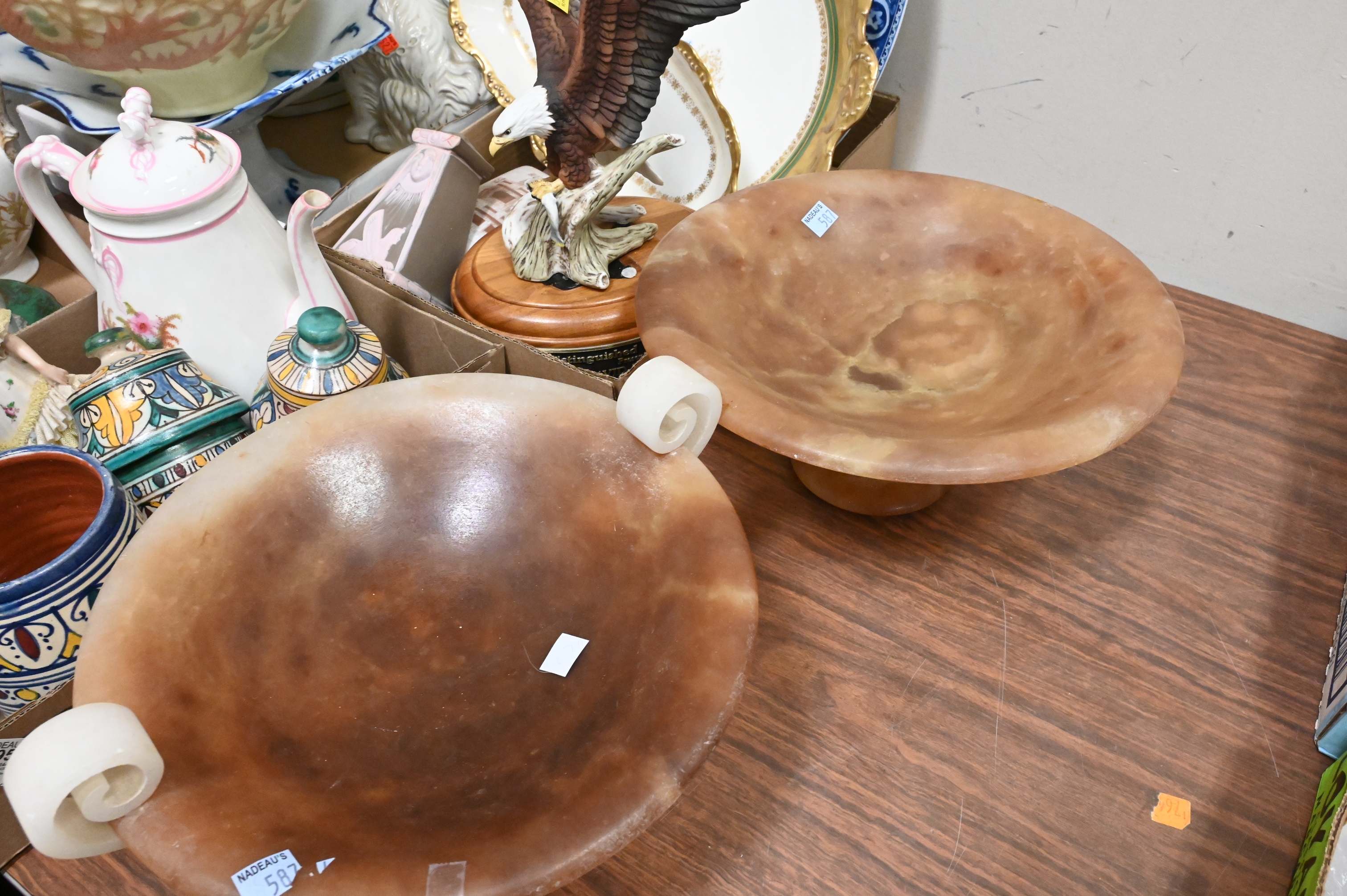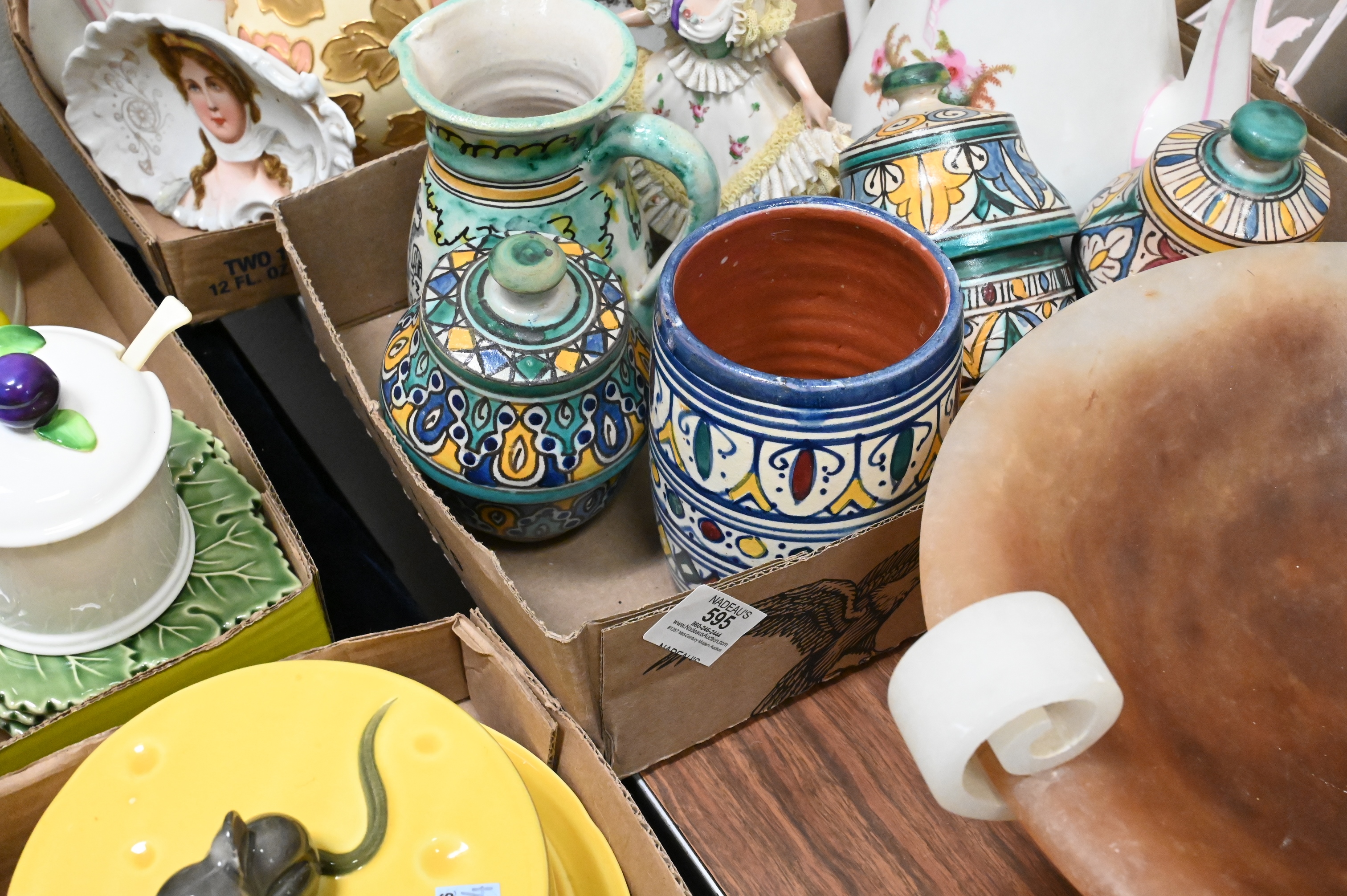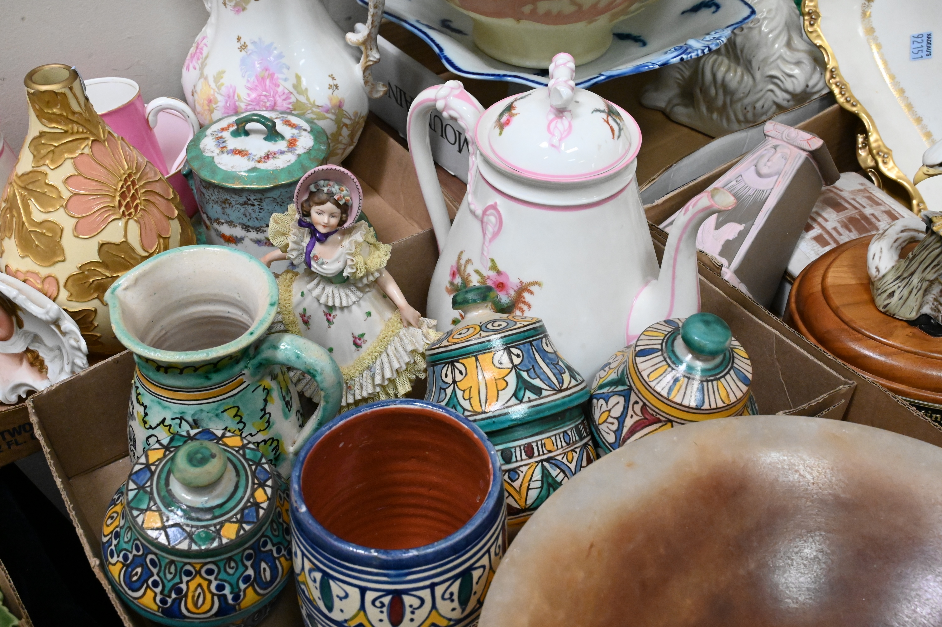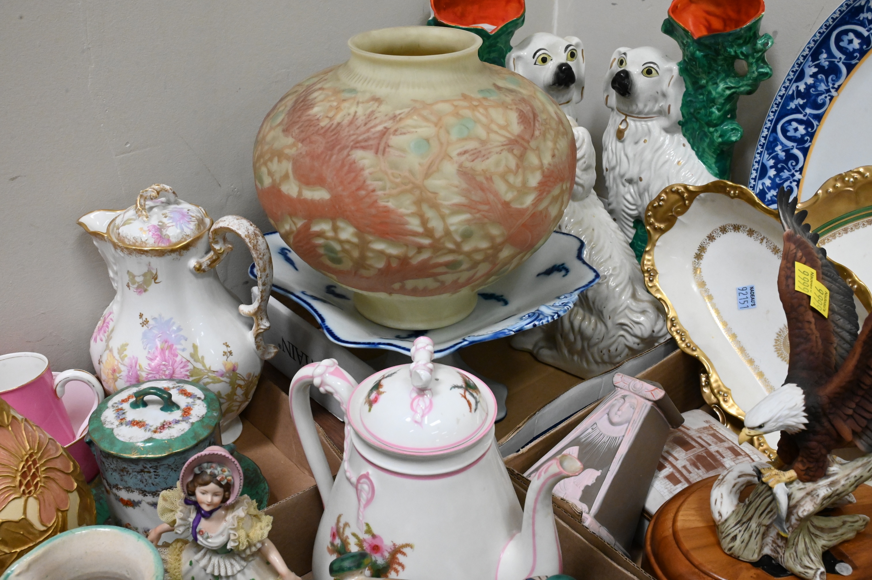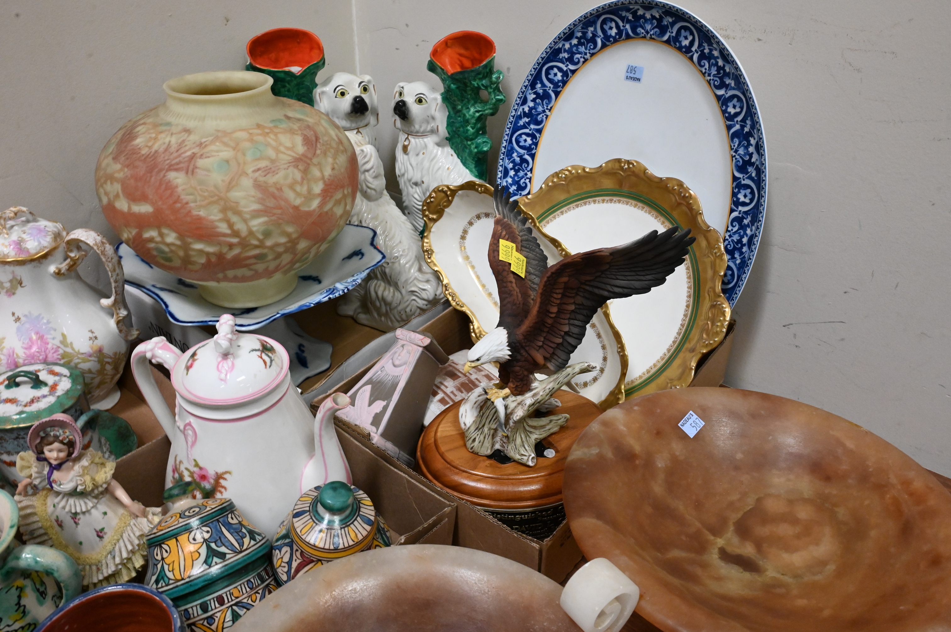 to include two Staffordshire dog spill vases and one dog figure, Majolica canisters, Wedgewood vase with high relief gilt applique, Limoges France coffee pot, Vista Alegre serving platter etc…