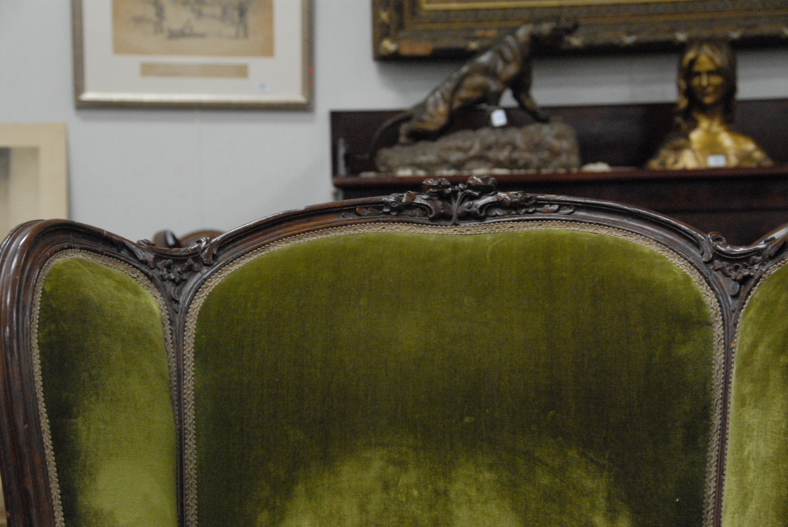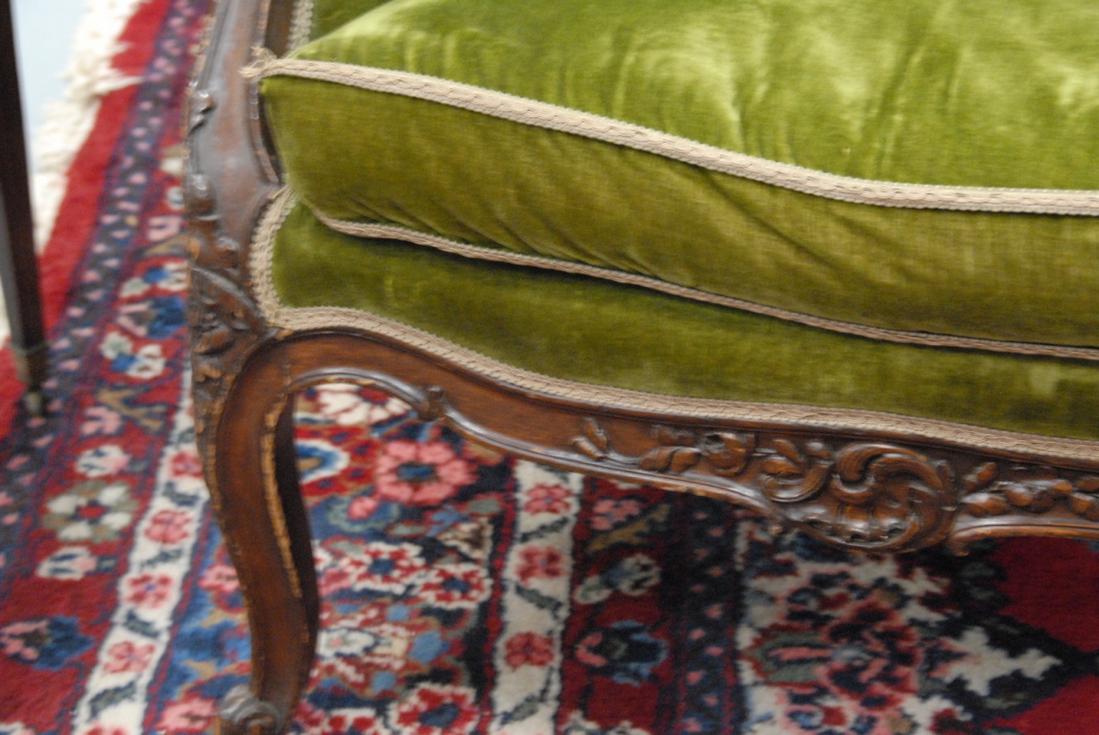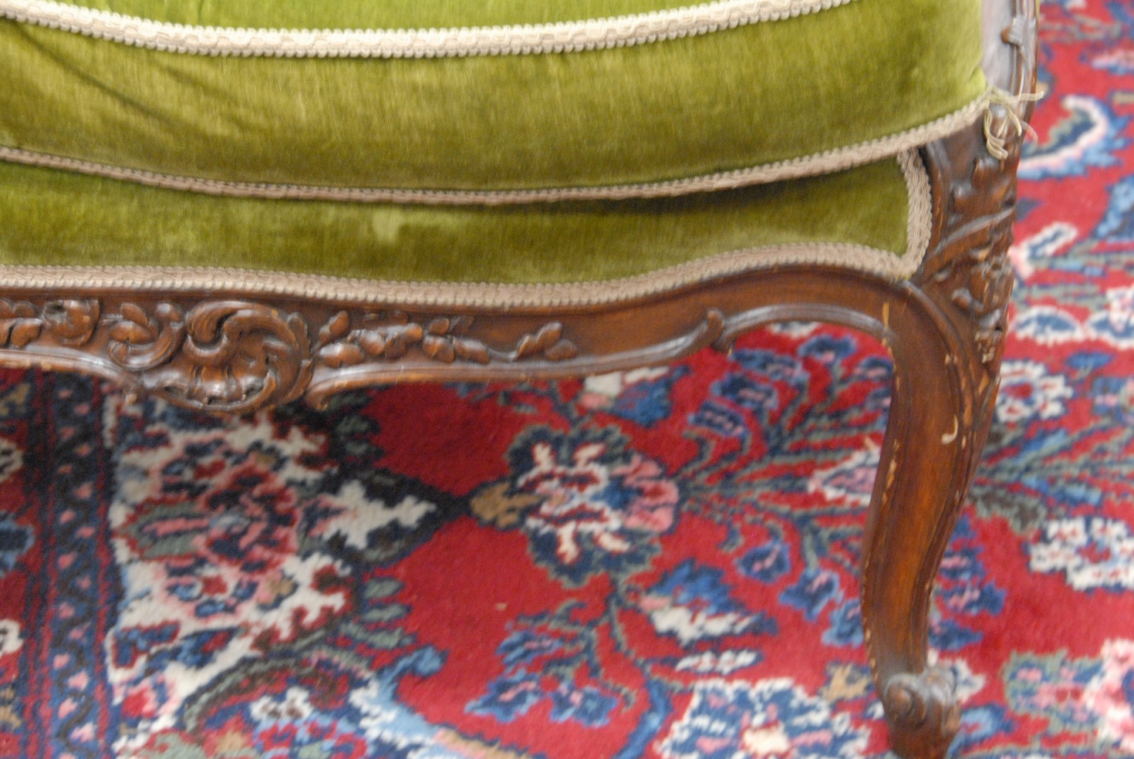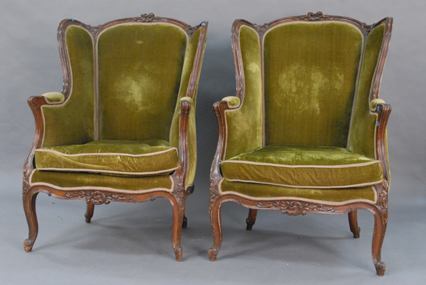 Pair of Louis XV style upholstered wing chairs with carved walnut frames.