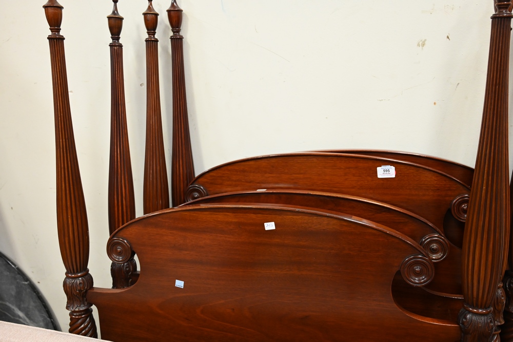 Lot 595: Pair of Mahogany Federal Style Four Post Beds, each having carved posts, height 64 inches, top of rail width 39 inches.